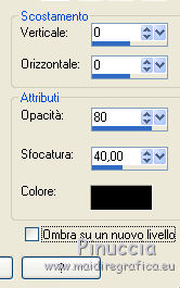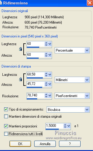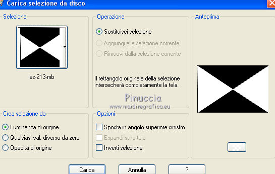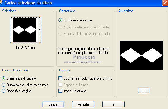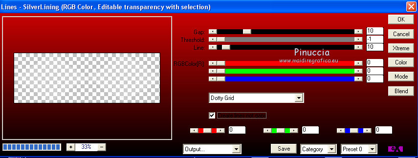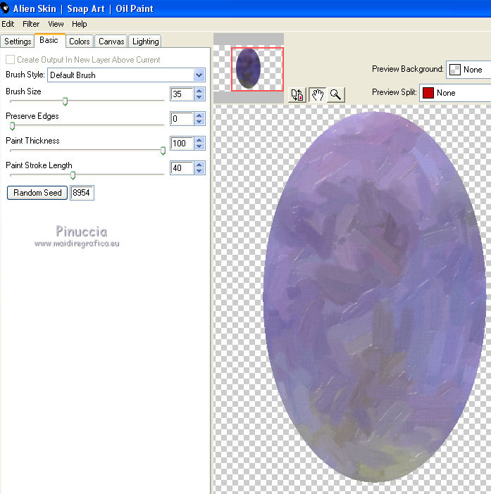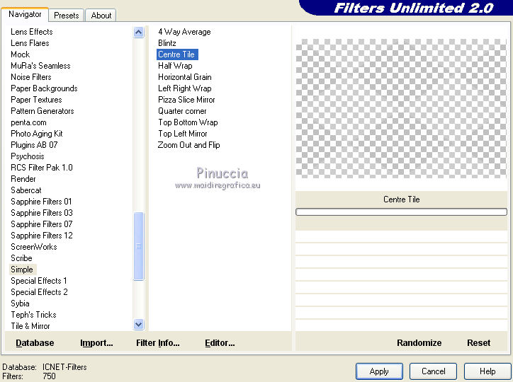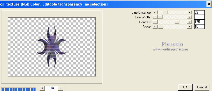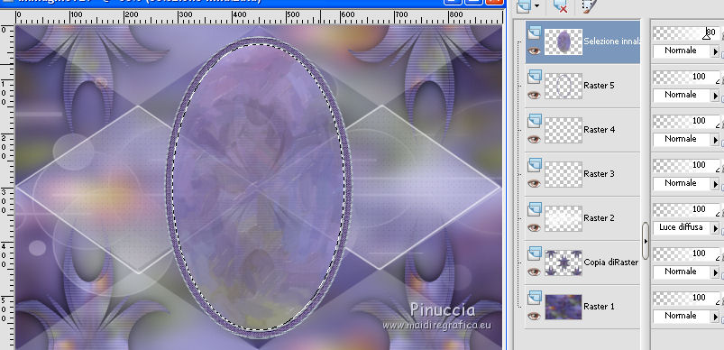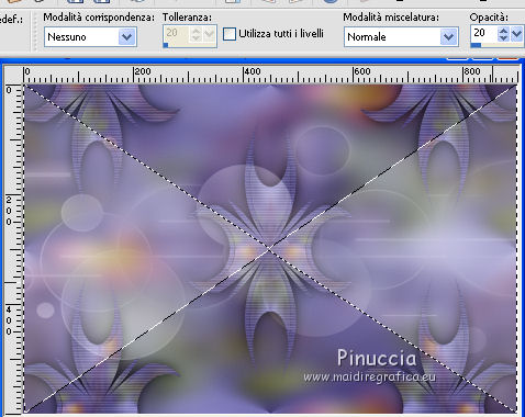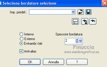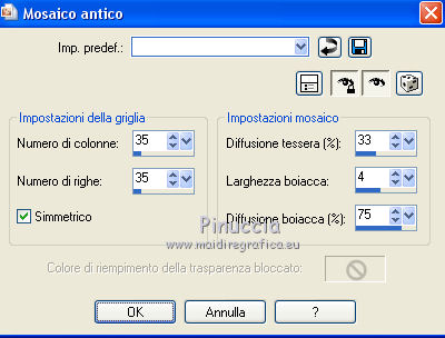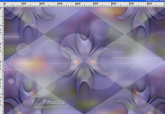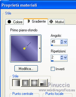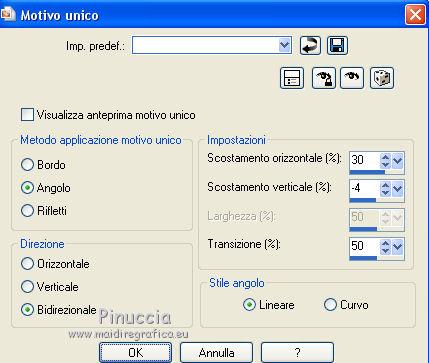 qui puoi trovare qualche risposta ai tuoi dubbi. Se l'argomento che ti interessa non è presente, ti prego di segnalarmelo. Per tradurre il tutorial ho usato Corel X, ma può essere eseguito con ogni versione di PSP. Dalla versione X4, il comando Immagine>Rifletti è stato sostituito con Immagine>Capovolgi in orizzontale, e il comando Immagine>Capovolgi con Immagine>Capovolgi in verticale. Nelle versioni X5 e X6, le funzioni sono state migliorate rendendo disponibile il menu Oggetti. Con la nuova versione X7, sono tornati Rifletti/Capovolgi, ma con nuove differenze Vedi la scheda sull'argomento qui traduzione in francese qui Le vostre versioni qui Occorrente: Materiale qui Per il tube deco grazie Occhiblu. (in questa pagina trovi i links ai loro siti). Filtri in caso di dubbi, ricorda di consultare la mia sezione filtri qui Filters Unlimited 2.0 qui Simple - Centre Tile qui Carolaine and Sensibility - CS Texture qui Flaming Pear - Flexify 2 qui AAA Frames - Foto Frame qui AP 01 Innovations - Lines SilverLining qui Alien skin Snap Art - Oil Paint qui I filtri Simple si possono usare da soli o importati in Filters Unlimited (come fare vedi qui) Se un filtro fornito appare con questa icona ![]() se stai usando altri colori, sperimenta le modalità di miscelatura e opacità più adatte ai tuoi colori Nelle ultime versioni di PSP non c'è il gradiente di primo piano/sfondo (Corel_06_029) Puoi usare i gradienti delle versioni precedenti. Trovi qui i gradienti Corel X. Metti le selezioni nella cartella Selezioni. 1. Imposta il colore di primo piano con #9490ce, e il colore di sfondo con #433c7a. ![]() Passa il colore di primo piano a Gradiente di primo piano/sfondo, stile Lineare. ![]() 2. Apri una nuova immagine trasparente 900 x 600 pixels. ![]() Riempi l'immagine trasparente con il gradiente.3. Selezione>Seleziona tutto. Apri il tube 328570fleurtiram144.png e vai a Modifica>Copia. Torna al tuo lavoro e vai a Modifica>Incolla nella selezione. Selezione>Deseleziona. 4. Regola>Sfocatura>Sfocatura gaussiana - raggio 20. ![]() 5. Effetti>Effetti di immagine>Motivo unico, con i settaggi standard. ![]() Effetti>Effetti di bordo>Aumenta di più. 6. Livelli>Duplica. Immagine>Ridimensiona, al 60%, tutti i livelli non selezionato. ![]() 7. Effetti>Plugins>Flaming Pear - Flexify 2. ![]() Ripeti il filtro una seconda volta con gli stessi settaggi. 8. Effetti>Plugins>Carolaine and Sensibility - CS Texture. ![]() 9. Effetti>Effetti 3D>Sfalsa ombra, colore nero. ![]() 10. Effetti>Effetti di immagine>Motivo unico. ![]() 11. Effetti>Effetti di riflesso>Specchio rotante. ![]() 12. Apri il tube OBG_ORNAMENT_12.png e vai a Modifica>Copia. Torna al tuo lavoro e vai a Modifica>Incolla come nuovo livello. Cambia la modalità di miscelatura di questo livello in Luce diffusa. 13. Livelli>Nuovo livello raster. Selezione>Carica/Salva selezione>Carica selezione da disco. Cerca e carica la selezione les-213-mb. ![]() 14. Imposta il colore di sfondo con il colore bianco #ffffff. Abbassa l'opacità dello strumento Riempimento a 20 e riempi la selezione con il colore bianco.![]() Selezione>Deseleziona. 15. Effetti>Plugins>Filters Unlimited 2.0 - Simple - Centre Tile. ![]() Risultato: ![]() 16. Selezione>Carica/Salva selezione>Carica selezione da disco. Cerca e carica la selezione les-213-2-mb. ![]() 17. Effetti>Plugins>AP 01 [Innovations] - Lines SilverLining. ![]() 18. Livelli>Nuovo livello raster. Selezione>Modifica>Seleziona bordature selezione. ![]() 19. Aumenta l'opacità dello strumento Riempimento a 60, e riempi il bordo con il colore bianco di sfondo.(Riporta l'opacità dello strumento a 100) Selezione>Deseleziona. 20. Apri deco-1 e vai a Modifica>Copia. Torna al tuo lavoro e vai a Modifica>Incolla come nuovo livello. 21. Attiva lo strumento Bacchetta magica , sfumatura e tolleranza 0,e clicca nella cornice per selezionarla. 22. Attiva il livello inferiore, Raster 1. Selezione>Innalza selezione a livello. Livelli>Disponi>Porta in alto. 23. Effetti>Plugins>Alien Skin Snap Art - Oil Paint. ![]() 24. Abbassa l'opacità di questo livello all'80%. ![]() Selezione>Deseleziona. Livelli>Unisci>Unisci giù. 25. Effetti>Effetti 3D>Sfalsa ombra, colore nero. ![]() 26. Attiva nuovamente il tube 328570fleurtiram144 e vai a Modifica>Copia. Torna al tuo lavoro e vai a Modifica>Incolla come nuovo livello. Posiziona correttamente il tube nella cornice.27. Effetti>Effetti 3D>Sfalsa ombra, colore nero. ![]() 28. Livelli>Duplica. Effetti>Effetti di trama>Mosaico antico. ![]() Livelli>Disponi>Sposta giù. 29. Apri deco-2 e vai a Modifica>Copia. Torna al tuo lavoro e vai a Modifica>Incolla come nuovo livello. 30. Immagine>Aggiungi bordatura, 1 pixel, simmetriche, colore di primo piano #9490ce. Immagine>Aggiungi bordatura, 5 pixels, simmetriche, colore bianco #ffffff. Immagine>Aggiungi bordatura, 1 pixel, simmetriche, colore di primo piano #9490ce. Immagine>Aggiungi bordatura, 40 pixels, simmetriche, colore bianco #ffffff. 31. Effetti>Plugins>AAA Frames - Foto Frame. ![]() 32. Firma il tuo lavoro su un nuovo livello. Livelli>Unisci>Unisci tutto e salva in formato jpg. ![]() Se hai problemi o dubbi, o trovi un link non funzionante, o anche soltanto per un saluto, scrivimi. 25 Ottobre 2017 |