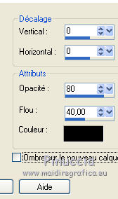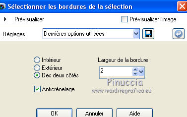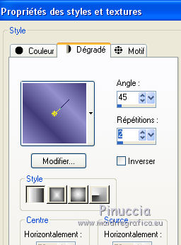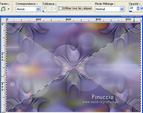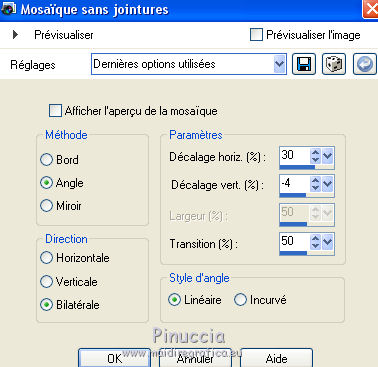 Ce tutoriel a été créé avec CorelX17, mais il peut également être exécuté avec les autres versions. Pour traduire le tutoriel j'ai utilisé CorelX17 pour l'italien et CorelX2 pour le français. Suivant la version utilisée, vous pouvez obtenir des résultats différents. Depuis la version X4, la fonction Image>Miroir a été remplacée par Image>Renverser horizontalement, et Image>Renverser avec Image>Renverser verticalement. Dans les versions X5 et X6, les fonctions ont été améliorées par la mise à disposition du menu Objets. Dans la nouvelle version X7, nous avons à nouveau Miroir/Renverser, mais avec autres différences. Voir plus les détails à ce sujet ici Certaines dénominations ont changées entre les versions de PSP. Les plus frequentes dénominations utilisées: ![]() Traduction en italien ici Vos versions ici Nécessaire pour réaliser ce tutoriel: Matériel qui Pour le déco merci Occhiblu Modules Externes consulter, si nécessaire, ma section de filtre ici Filters Unlimited 2.0 ici Simple - Centre Tile ici Carolaine and Sensibility - CS Texture ici Flaming Pear - Flexify 2 ici AAA Frames - Foto Frame ici AP 01 Innovations - Lines SilverLining ici Alien skin Snap Art - Oil Paint ici Filtres Simple peuvent être utilisés seuls ou importés dans Filters Unlimited. voir comment le faire ici). Si un filtre est fourni avec cette icône, ![]() Si vous voulez utiliser vos propres couleurs, n'hésitez pas à changer le mode et l'opacité des calques Dans les plus récentes versions de PSP, vous ne trouvez pas le dégradé d'avant plan/arrière plan ou Corel_06_029. Vous pouvez utiliser le dégradé des versions antérieures. Ici le dossier Dégradés de CorelX. Placer les sélections dans le dossier Sélections. 1. Placer en avant plan la couleur #9490ce, et en arrière plan la couleur #433c7a. ![]() Préparer en avant plan un dégradé de premier plan/arrière plan, style Linéaire. ![]() 2. Ouvrir une nouvelle image transparente 900 x 600 pixels. ![]() Remplir l'image transparente du dégradé.3. Sélections>Sélectionner tout. Ouvrir le tube 328570fleurtiram144.png - Édition>Copier. Revenir sur votre travail et Édition>Coller dans la sélection. Sélections>Désélectionner tout. 4. Réglage>Flou>Flou gaussien - rayon 20. ![]() 5. Effets>Effets d'image>Mosaïque sans jointures, par défaut. ![]() Effes>Effets de bords>Accentuer davantage. 6. Calques>Dupliquer. Image>Redimensionner, à 60%, redimensionner tous les calques décoché. ![]() 7. Effets>Modules Externes>Flaming Pear - Flexify 2. ![]() Répéter le filtre une deuxième fois avec les mêmes réglages. 8. Effets>Modules Externes>Carolaine and Sensibility - CS Texture. ![]() 9. Effets>Effets 3D>Ombre portée, couleur noire. ![]() 10. Effets>Effets d'image>Mosaïque sans jointures. ![]() 11. Effets>Effets de réflexion>Miroir rotatif. ![]() 12. Ouvrir le tube OBG_ORNAMENT_12.png - Édition>Copier. Revenir sur votre travail et Édition>Coller comme nouveau calque. Placer le calque en mode Lumière douce. 13. Calques>Nouveau calque raster. Sélectoins>Charger/Enregistrer une sélection>Charger à partir du disque. Chercher et charger la sélection les-213-mb. ![]() 14. Placer en arrière plan la couleur blanche #ffffff. Réduire l'opacité de l'outil Pot de peinture à 20 et remplir la sélection avec la couleur blanche.![]() Sélections>Désélectionner tout. 15. Effets>Modules Externes>Filters Unlimited 2.0 - Simple - Centre Tile. ![]() Résultat: ![]() 16. Sélections>Charger/Enregistrer une sélection>Charger à partir du disque. Chercher et charger la sélection les-213-2-mb. ![]() 17. Effets>Modules Externes>AP 01 [Innovations] - Lines SilverLining. ![]() 18. Calques>Nouveau calque raster. Sélections>Modifier>Sélectionner les bordures de la sélection. ![]() 19. Placer l'opacité de l'outil Pot de peinture à 60, et remplir le bord avec la couleur blanche d'arrière plan.(Placer à nouveau l'opacité de l'outil à 100). Sélections>Désélectionner tout. 20. Ouvrir deco-1 - Édition>Copier. Revenir sur votre travail et Édition>Coller comme nouveau calque. 21. Activer l'outil Baguette Magique , tolérance et progressivité 0,et cliquer dans le cadre pour le sélectionner. 22. Vous positionner sur le calque du bas de la pile, Raster 1. Sélections>Transformer la sélection en calque. Calques>Agencer>Placer en haut de la pile. 23. Effets>Modules Externes>Alien Skin Snap Art - Oil Paint. ![]() 24. Réduire l'opacité de ce calque à 80%. ![]() Sélections>Désélectionner tout. 25. Effets>Effets 3D>Ombre portée, couleur noire. ![]() 26. Activer à nouveau le tube 328570fleurtiram144 - Édition>Copier. Revenir sur votre travail et Édition>Coller comme nouveau calque. Positionner bien le tube dans le cadre.27. Effets>Effets 3D>Ombre portée, couleur noire. ![]() 28. Calques>Dupliquer. Effets>Effets de textures>Mosaïque antique. ![]() Calques>Agencer>Déplacer vers le bas. 29. Ouvrir deco-2 - Édition>Copier. Revenir sur votre travail et Édition>Coller comme nouveau calque. 30. Image>Ajouter des bordures, 1 pixel, symétrique, couleur d'avant plan #9490ce. Image>Ajouter des bordures, 5 pixels, symétrique, couleur blanche #ffffff. Image>Ajouter des bordures, 1 pixel, symétrique, couleur d'avant plan #9490ce. Image>Ajouter des bordures, 40 pixels, symétrique, couleur blanche #ffffff. 31. Effets>Modules Externes>AAA Frames - Foto Frame. ![]() 32. Signer votre travail sur un nouveau calque. Calques>Fusionner>Tous et enregistrer en jpg. ![]() Si vous avez des problèmes, ou des doutes, ou vous trouvez un link modifié, ou seulement pour me dire que ce tutoriel vous a plu, vous pouvez m'écrire. 25 Octobre 2017 |