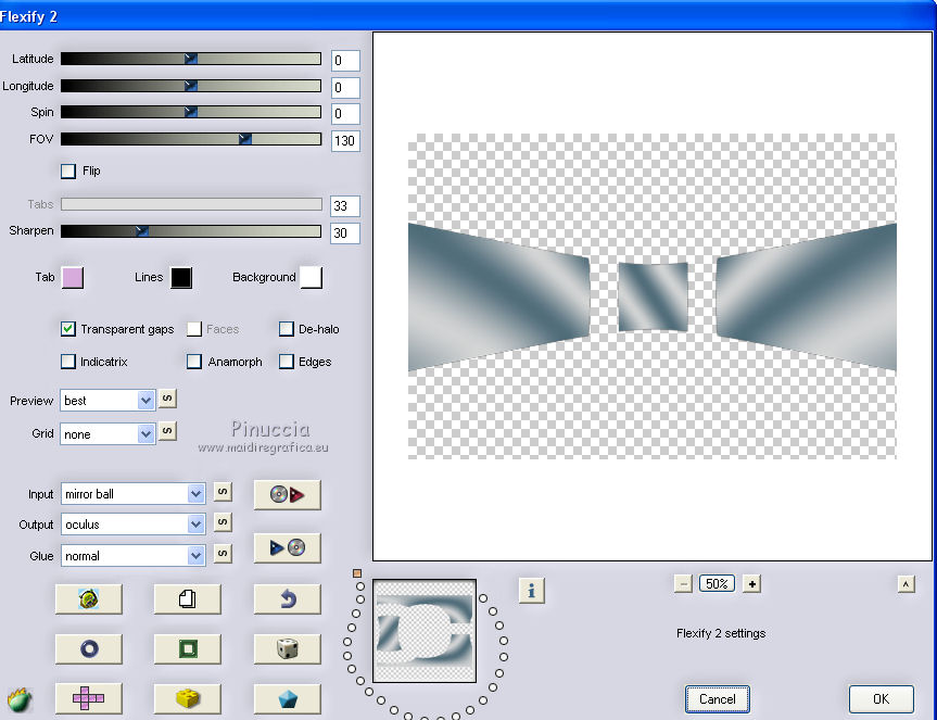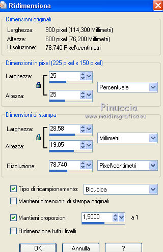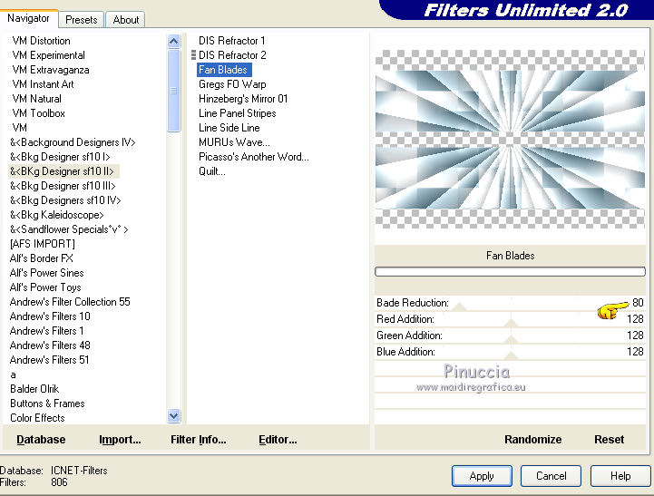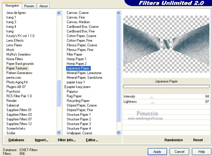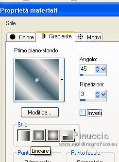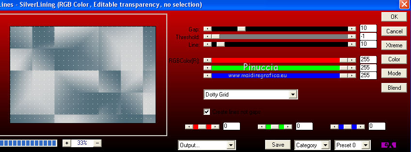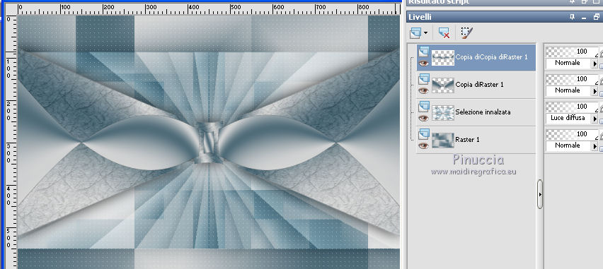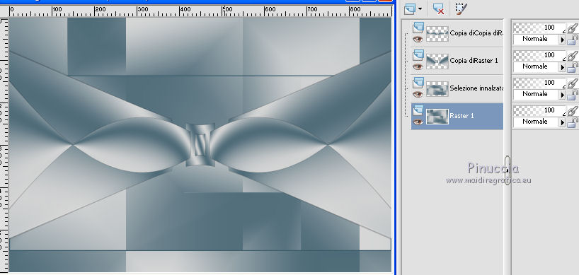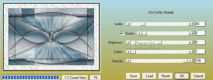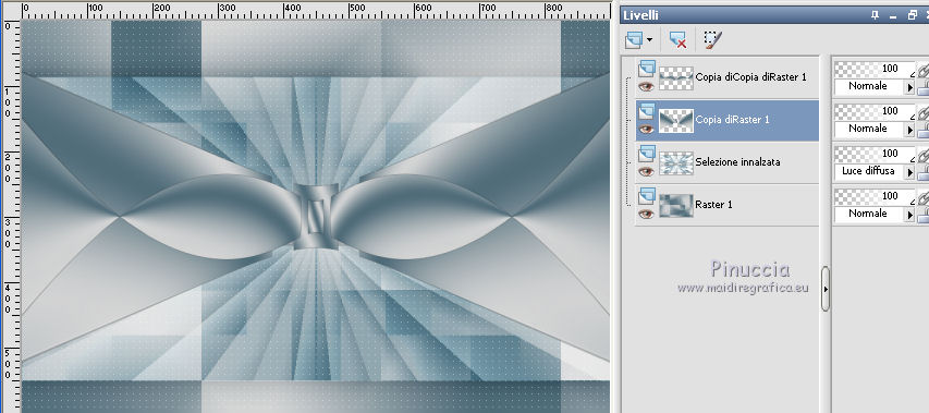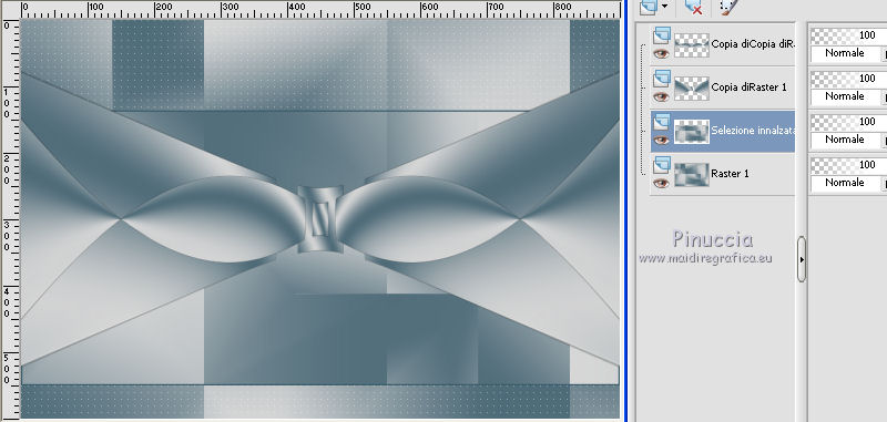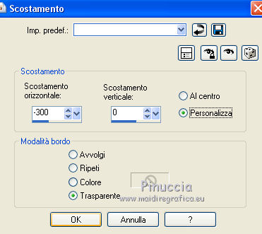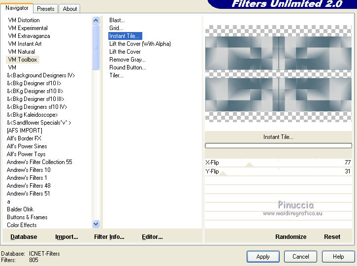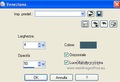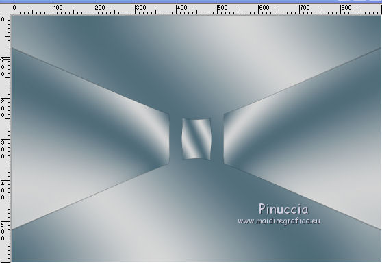 qui puoi trovare qualche risposta ai tuoi dubbi. Se l'argomento che ti interessa non è presente, ti prego di segnalarmelo. Per tradurre il tutorial ho usato Corel X, ma può essere eseguito con ogni versione di PSP. Dalla versione X4, il comando Immagine>Rifletti è stato sostituito con Immagine>Capovolgi in orizzontale, e il comando Immagine>Capovolgi con Immagine>Capovolgi in verticale. Nelle versioni X5 e X6, le funzioni sono state migliorate rendendo disponibile il menu Oggetti. Con la nuova versione X7, sono tornati Rifletti/Capovolgi, ma con nuove differenze Vedi la scheda sull'argomento qui traduzione in francese qui Le vostre versioni qui Occorrente: Materiale qui Per il tube grazie Kamalini. (in questa pagina trovi i links ai loro siti). Filtri in caso di dubbi, ricorda di consultare la mia sezione filtri qui Filters Unlimited 2.0 qui &<Bkg Designer sf10II> - Fan Blades (da importare in Unlimited) qui VM Toolbox - Instant Tile qui Flaming Pear - Flexify 2 qui AAA Frames - Foto Frame qui Mehdi - Sorting Tiles qui AP 01 [Innovations] - Lines SilverLining qui I filtri VM Toolbox si possono usare da soli o importati in Filters Unlimited (come fare vedi qui) Se un filtro fornito appare con questa icona ![]() se stai usando altri colori, sperimenta le modalità di miscelatura e opacità più adatte ai tuoi colori Nelle ultime versioni di PSP non c'è il gradiente di primo piano/sfondo (Corel_06_029) Puoi usare i gradienti delle versioni precedenti. Trovi qui i gradienti Corel X. 1. Imposta il colore di primo piano con #3b5c6b, e il colore di sfondo con #e9e5e3. ![]() Passa il colore di primo piano a Gradiente di primo piano/sfondo, stile Lineare. ![]() 2. Apri una nuova immagine trasparente 900 x 600 pixels. ![]() Riempi l'immagine trasparente con il gradiente.3. Regola>Sfocatura>Sfocatura gaussiana - raggio 50. ![]() 4. Livelli>Duplica. 5. Immagine>Ridimensiona, al 25%, tutti i livelli non selezionato. ![]() 6. Livelli>Duplica. 7. Effetti>Effetti di immagine>Scostamento. ![]() 8. Livelli>Duplica. Immagine>Rifletti. Livelli>Unisci>Unisci giù. Modifica>Ripeti Unione livello sottostante. 9. Effetti>Plugins>Flaming Pear - Flexify 2 ![]() 10. Ripeti il filtro Flexify una seconda volta. Questo il risultato ![]() Se hai problemi con il filtro, nel materiale trovi il livello con l'effetto - extra-1, da copiare/incollare come nuovo livello 11. Livelli>Duplica. 12. Effetti>Plugins>Flaming Pear - Flexify 2, con i settaggi precedenti, ma Output: Lagrange plus. ![]() se hai problemi, copia/incolla come nuovo livello l'effetto che trovi nel materiale: extra-2. ![]() 13. Attiva il livello inferiore, Raster 1. Effetti>Plugins>Mehdi - Sorting Tiles. ![]() 14. Attiva lo strumento Selezione ![]() (non importa il tipo di selezione impostato, perchè con la selezione personalizzata si ottiene sempre un rettangolo) clicca sull'icona Selezione personalizzata ![]() e imposta i seguenti settaggi. ![]() Selezione>Innalza selezione a livello. 15. Livelli>Nuovo livello raster. Imposta il colore di primo piano a Colore. Riempi con il colore scuro di primo piano.16. Selezione>Modifica>Contrai - 2 pixels. Premi sulla tastiera il tasto CANC ![]() Selezione>Deseleziona. 17. Livelli>Unisci>Unisci giù. 18. Attiva il livello inferiore. ![]() Effetti>Plugins>AP 01 [Innovations] - Lines SilverLining. ![]() 19. Attiva il livello soprastante (selezione innalzata). ![]() Effetti>Plugins>Filters Unlimited 2.0 - VM Toolbox - Instant Tile, con i settaggi standard. ![]() 20. Effetti>Plugins>Filters Unlimited 2.0 - &<Bkg Designer sf10II> - Fan Blades. ![]() 21. Cambia la modalità di miscelatura di questo livello in Luce diffusa. 22. Effetti>Effetti di immagine>Scostamento. ![]() 23. Effetti>Effetti 3D>Sfalsa ombra, colore nero. ![]() 24. Attiva il livello soprastante, copia di Raster 1. ![]() Effetti>Plugins>Filters Unlimited 2.0 - Paper Textures - Japanese Paper, con i settaggi standard. ![]() 25. Effetti>Effetti 3D>Sfalsa ombra, con i settaggi precedenti. ![]() 26. Attiva il livello superiore copia 2 di Raster 1. ![]() Effetti>Effetti di trama>Veneziana - colore scuro. ![]() 27. Effetti>Effetti 3D>Sfalsa ombra, con i settaggi precedenti. ![]() 28. Apri deco-114-1 e vai a Modifica>Copia. Torna al tuo lavoro e vai a Modifica>Incolla come nuovo livello. 29. Effetti>Effetti di immagine>Scostamento. ![]() 30. Immagine>Aggiungi bordatura, 2 pixels, simmetriche, colore scuro. Immagine>Aggiungi bordatura, 2 pixels, simmetriche, colore chiaro. Immagine>Aggiungi bordatura, 50 pixels, simmetriche, colore bianco. 31. Effetti>Plugins>AAA Frames - Texture Frame. ![]() 32. Apri il tube Kamalini-686 - cancella il watermark e vai a Modifica>Copia. Torna al tuo lavoro e vai a Modifica>Incolla come nuovo livello. Spostalo nell'angolo in basso a sinistra.33. Effetti>Effetti 3D>Sfalsa ombra, con i settaggi precedenti. ![]() 34. Apri il tube 1244.pspimage e vai a Modifica>Copia. Torna al tuo lavoro e vai a Modifica>Incolla come nuovo livello. Spostalo a destra, vedi il mio esempio.35. Firma il tuo lavoro su un nuovo livello. 35. Immagine>Aggiungi bordatura, 1 pixel, simmetriche, colore #000000. Salva in formato jpg. Il tube di questo esempio è di Syl ![]() ![]() Se hai problemi o dubbi, o trovi un link non funzionante, o anche soltanto per un saluto, scrivimi. 24 Gennaio 2018 |
