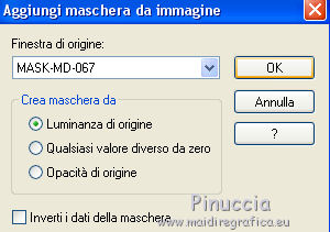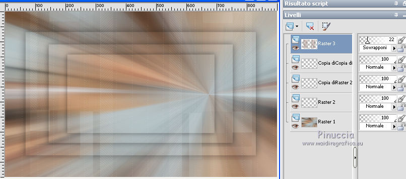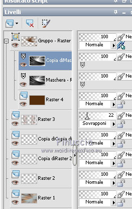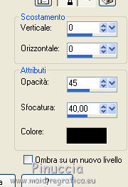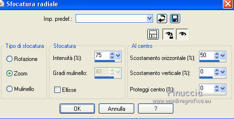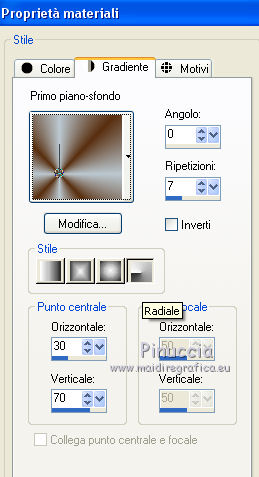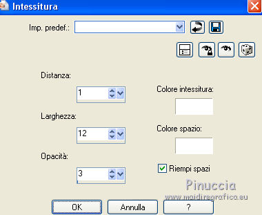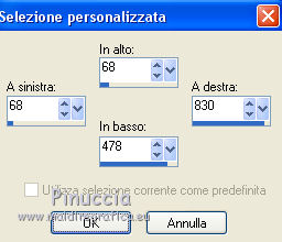 qui puoi trovare qualche risposta ai tuoi dubbi. Se l'argomento che ti interessa non è presente, ti prego di segnalarmelo. Per tradurre il tutorial ho usato Corel X, ma può essere eseguito con ogni versione di PSP. Dalla versione X4, il comando Immagine>Rifletti è stato sostituito con Immagine>Capovolgi in orizzontale, e il comando Immagine>Capovolgi con Immagine>Capovolgi in verticale. Nelle versioni X5 e X6, le funzioni sono state migliorate rendendo disponibile il menu Oggetti. Con la nuova versione X7, sono tornati Rifletti/Capovolgi, ma con nuove differenze Vedi la scheda sull'argomento qui traduzione in francese qui Le vostre versioni qui Occorrente: Materiale qui Per il tube grazie Beatriz. (in questa pagina trovi i links ai loro siti). Filtri in caso di dubbi, ricorda di consultare la mia sezione filtri qui L&K's - L&K Adonis qui AAA Frames - Foto Frame qui ![]() se stai usando altri colori, sperimenta le modalità di miscelatura e opacità più adatte ai tuoi colori Nelle ultime versioni di PSP non c'è il gradiente di primo piano/sfondo (Corel_06_029) Puoi usare i gradienti delle versioni precedenti. Trovi qui i gradienti Corel X. Apri la maschera in PSP e minimizzala con il resto del materiale. 1. Imposta il colore di primo piano con #bbc8d0, e il colore di sfondo con #582e0f. ![]() Passa il colore di primo piano a Gradiente di primo piano/sfondo, stile Radiale. ![]() 2. Apri una nuova immagine trasparente 900 x 550 pixels. ![]() Riempi l'immagine trasparente con il gradiente.3. Regola>Sfocatura>Sfocatura gaussiana - raggio 45. ![]() 4. Livelli>Nuovo livello raster. 5. Selezione>Seleziona tutto. Apri il tube 2629-woman-LB TUBES.psp e vai a Modifica>Copia minimizza il tube perchè ti servirà ancora Torna al tuo lavoro e vai a Modifica>Incolla nella selezione. Selezione>Deseleziona. 6. Effetti>Effetti di immagine>Motivo unico, con i settaggi standard. ![]() 7. Livelli>Unisci>Unisci giù. 8. Regola>Sfocatura>Sfocatura radiale. ![]() 9. Effetti>Plugins>L&K's Landksiteofwonders - L&K's Adonis, con i settaggi standard. ![]() 10. Regola>Messa a fuoco>Metti a foco. 11. Attiva lo strumento Selezione ![]() (non importa il tipo di selezione impostato, perchè con la selezione personalizzata si ottiene sempre un rettangolo) clicca sull'icona Selezione personalizzata ![]() e imposta i seguenti settaggi. ![]() 12. Livelli>Nuovo livello raster. Effetti>Effetti 3D>Sfalsa ombra, colore nero. ![]() Selezione>Deseleziona. 13. Livelli>Duplica. Immagine>Ridimensiona, all'80%, tutti i livelli non selezionato. ![]() 14. Di nuovo Livelli>Duplica. Immagine>Ridimensiona, all'80%, tutti i livelli non selezionato. 15. Apri il tube deco-217-1 e vai a Modifica>Copia. Torna al tuo lavoro e vai a Modifica>Incolla come nuovo livello. 16. Cambia la modalità di miscelatura di questo livello in Sovrapponi, e abbassa l'opacità al 22% (o secondo i tuoi colori). ![]() 17. Livelli>Nuovo livello raster. Riempi con il colore scuro di sfondo.18. Livelli>Nuovo livello maschera>Da immagine. Apri il menu sotto la finestra di origine e vedrai la lista dei files aperti. Seleziona la maschera MASK-MD-067.jpg. ![]() Livelli>Duplica. ![]() Livelli>Unisci>Unisci Gruppo. Abbassa l'opacità di questo livello al 60%. 19. Effetti>Effetti di trama>Intessitura - imposta entrambi i colori con il colore bianco #ffffff. ![]() 20. Apri il tube deco-mb-215.psp e vai a Modifica>Copia. Torna al tuo lavoro e vai a Modifica>Incolla come nuovo livello. Cambia la modalità di miscelatura di questo livello in Sovrapponi. 21. Immagine>Aggiungi bordatura, 1 pixel, simmetriche, colore scuro. Immagine>Aggiungi bordatura, 4 pixels, simmetriche, colore chiaro. Immagine>Aggiungi bordatura, 1 pixel, simmetriche, colore scuro. 22. Selezione>Seleziona tutto. Modifica>Copia. 23. Immagine>Aggiungi bordatura, 45 pixels, simmetriche, colore chiaro. Selezione>Inverti. Modifica>Incolla nella selezione. 24. Regola>Sfocatura>Sfocatura gaussiana - raggio 45. ![]() 25. Selezione>Inverti. Effetti>Effetti 3D>Sfalsa ombra, colore nero. ![]() Selezione>Deseleziona. 26. Effetti>Plugins>AAA Frames - Foto Frame. ![]() 27. Attiva nuovamente il tube 2629-woman-LB TUBES.psp e vai a Modifica>Copia. Torna al tuo lavoro e vai a Modifica>Incolla come nuovo livello. Immagine>Rifletti. Sposta il tube a destra.28. Effetti>Effetti 3D>Sfalsa ombra, colore nero. ![]() Modifica>Ripeti Sfalsa ombra. 29. Firma il tuo lavoro su un nuovo livello. 30. Immagine>Aggiungi bordatura, 1 pixel, simmetriche, colore scuro. Salva in formato jpg. Il tube di questo esempio è di Thafs ![]() ![]() Se hai problemi o dubbi, o trovi un link non funzionante, o anche soltanto per un saluto, scrivimi. 22 Febbraio 2018 |