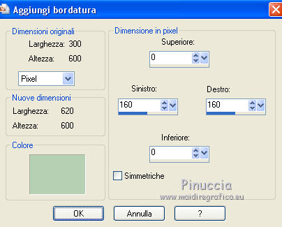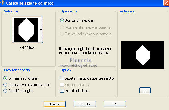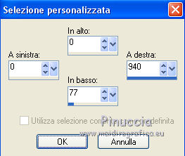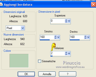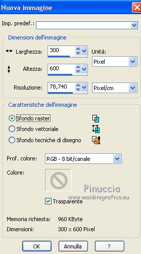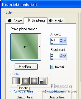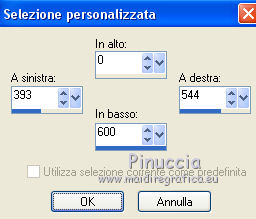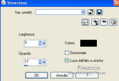 qui puoi trovare qualche risposta ai tuoi dubbi. Se l'argomento che ti interessa non è presente, ti prego di segnalarmelo. Per tradurre il tutorial ho usato Corel X, ma può essere eseguito con ogni versione di PSP. Dalla versione X4, il comando Immagine>Rifletti è stato sostituito con Immagine>Capovolgi in orizzontale, e il comando Immagine>Capovolgi con Immagine>Capovolgi in verticale. Nelle versioni X5 e X6, le funzioni sono state migliorate rendendo disponibile il menu Oggetti. Con la nuova versione X7, sono tornati Rifletti/Capovolgi, ma con nuove differenze Vedi la scheda sull'argomento qui traduzione in francese qui Le vostre versioni qui Occorrente: Materiale qui Per il tube grazie Cal (in questa pagina trovi i links ai loro siti). Filtri in caso di dubbi, ricorda di consultare la mia sezione filtri qui Filters Unlimited 2.0 qui AFS IMPORT - sqborder2 qui VanDerLee - Unplugged-X qui Toadies - What are you qui Texture - Texturizer qui Simple - Diamonds qui I filtri Simple, AFS IMPORT e Toadies si possono usare da soli o importati in Filters Unlimited (come fare vedi qui) Se un filtro fornito appare con questa icona ![]() se stai usando altri colori, sperimenta le modalità di miscelatura e opacità più adatte ai tuoi colori Nelle ultime versioni di PSP non c'è il gradiente di primo piano/sfondo (Corel_06_029) Puoi usare i gradienti delle versioni precedenti. Trovi qui i gradienti Corel X. Metti il preset nella cartella Impostazioni predefinite. Metti la selezione nella cartella Selezioni. 1. Imposta il colore di primo piano con il colore #b5d0b2, e il colore di sfondo con #669461. ![]() Passa il colore di primo piano a Gradiente di primo piano/sfondo, stile Lineare. ![]() Apri una nuova immagine trasparente 300 x 600 pixels. ![]() Riempi l'immagine trasparente con il gradiente.2. Effetti>Plugins>Filters Unlimited 2.0 - Simple - Diamonds. ![]() Effetti>Effetti di bordo>Aumenta. 3. Immagine>Aggiungi bordatura, simmetriche non selezionato, colore chiaro di primo piano. ![]() 4. Effetti>Effetti di immagine>Motivo unico ![]() 5. Immagine>Aggiungi bordatura, simmetriche non selezionato . ![]() 6. Effetti>Effetti di immagine>Motivo unico, con i settaggi precedenti. ![]() 7. Selezione>Carica/Salva selezione>Carica selezione da disco. Cerca e carica la selezione sel-221-mb. ![]() Selezione>Innalza selezione a livello. 8. Effetti>Plugins>Filters Unlimited 2.0 - AFS IMPORT - sqborder2, con i settaggi standard. ![]() Selezione>Deseleziona. 9. Effetti>Plugins>VanDerLee - Unplugged-X - Vertical Tile, con i settaggi standard. ![]() 10. Effetti>Effetti 3D>Sfalsa ombra, colore nero. ![]() 11. Effetti>Effetti di immagine>Motivo unico, con i settaggi standard. ![]() 12. Attiva il livello inferiore di sfondo. Attiva lo strumento Selezione ![]() (non importa il tipo di selezione impostato, perchè con la selezione personalizzata si ottiene sempre un rettangolo) clicca sull'icona Selezione personalizzata ![]() e imposta i seguenti settaggi. ![]() Selezione>Innalza selezione a livello. Selezione>Deseleziona. 13. Effetti>Effetti di trama>Veneziana, colore nero. ![]() 14. Effetti>Effetti 3D>Sfalsa ombra, colore nero. ![]() 15. Livelli>Duplica. Immagine>Capovolgi. Livelli>Unisci>Unisci giù. 16. Abbassa l'opacità di questo livello al 55%. 17. Attiva il livello superiore (selezione innalzata). Selezione personalizzata ![]() ![]() Selezione>Innalza selezione a livello. Selezione>Deseleziona. 18. Effetti>Plugins>Filters Unlimited 2.0 - Toadies - What are you. ![]() 19. Effetti>Filtro definito dall'utente - seleziona il preset Emboss 3 e ok. ![]() 20. Livelli>Duplica. Immagine>Ruota per gradi - 90 gradi a sinistra. ![]() 21. Livelli>Unisci>Unisci giù. 22. Livelli>Duplica. Effetti>Effetti di immagine>Motivo unico, con i settaggi standard. ![]() 23. Attiva il livello inferiore di sfondo. Effetti>Plugins>Texture - Texturizer ![]() 24. Apri il tube deco-les-221 e vai a Modifica>Copia. Torna al tuo lavoro e vai a Modifica>Incolla come nuovo livello. Livelli>Disponi>Porta in alto. 25. Immagine>Aggiungi bordatura, 1 pixel, simmetriche, colore scuro. Immagine>Aggiungi bordatura, 4 pixels, simmetriche, colore chiaro. Immagine>Aggiungi bordatura, 1 pixel, simmetriche, colore scuro. 26. Selezione>Seleziona tutto. Immagine>Aggiungi bordatura, 40 pixels, simmetriche, colore chiaro. Selezione>Inverti. 27. Effetti>Plugins>Texture - Texturizer, con i settaggi precedenti ![]() 28. Selezione>Inverti. Effetti>Effetti 3D>Sfalsa ombra, colore nero. ![]() Selezione>Deseleziona. 29. Apri il tube CAL-2556-031018, cancella il watermark e vai a Modifica>Copia. Torna al tuo lavoro e vai a Modifica>Incolla come nuovo livello. Sposta il tube un po' più in basso.30. Effetti>Effetti 3D>Sfalsa ombra, colore nero. ![]() 31. Firma il tuo lavoro su un nuovo livello e salva in formato jpg. ![]() Se hai problemi o dubbi, o trovi un link non funzionante, o anche soltanto per un saluto, scrivimi. 16 Agosto 2018 |