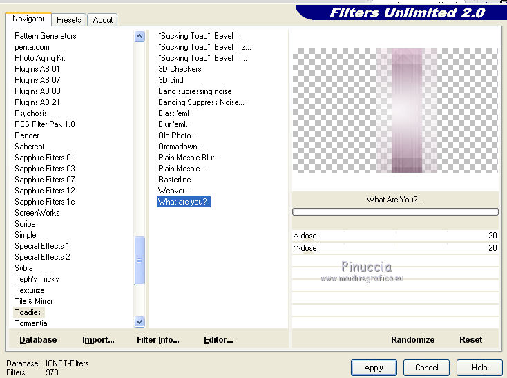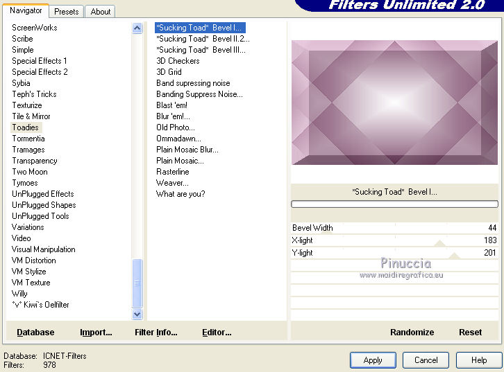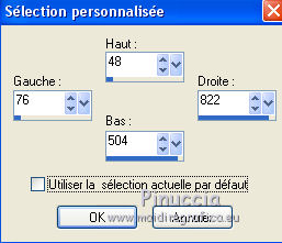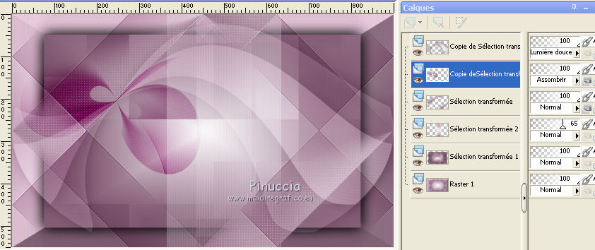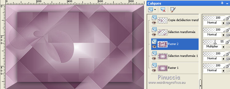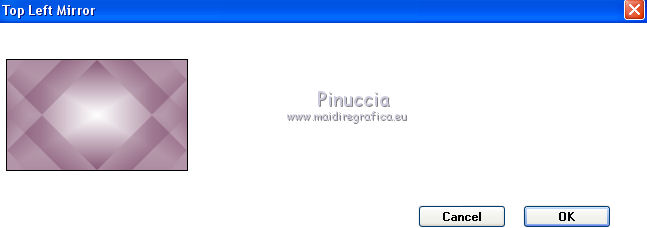 Ce tutoriel a été créé avec CorelX17, mais il peut également être exécuté avec les autres versions. Pour traduire le tutoriel j'ai utilisé CorelX17 pour l'italien et CorelX2 pour le français. Suivant la version utilisée, vous pouvez obtenir des résultats différents. Depuis la version X4, la fonction Image>Miroir a été remplacée par Image>Renverser horizontalement, et Image>Renverser avec Image>Renverser verticalement. Dans les versions X5 et X6, les fonctions ont été améliorées par la mise à disposition du menu Objets. Dans la nouvelle version X7, nous avons à nouveau Miroir/Renverser, mais avec autres différences. Voir plus les détails à ce sujet ici Certaines dénominations ont changées entre les versions de PSP. Les plus frequentes dénominations utilisées: ![]() Traduction en italien ici Vos versions ici Nécessaire pour réaliser ce tutoriel: Matériel qui Pour le tube merci Kamalin (les liens des sites des tubeuses ici) Modules Externes consulter, si nécessaire, ma section de filtre ici Filters Unlimited 2.0 ici Flaming Pear - Flexify 2 ici Carolaine and Sensibility - CS-LDots ici Toadies - What are you, Sucking Toad Bevel I ici Simple - Blintz, Top Left Mirror ici Filtres Simple et Toadies peuvent être utilisés seuls ou importés dans Filters Unlimited. voir comment le faire ici). Si un filtre est fourni avec cette icône, ![]() Si vous voulez utiliser vos propres couleurs, n'hésitez pas à changer le mode et l'opacité des calques Dans les plus récentes versions de PSP, vous ne trouvez pas le dégradé d'avant plan/arrière plan ou Corel_06_029. Vous pouvez utiliser le dégradé des versions antérieures. Ici le dossier Dégradés de CorelX. Placer la sélection dans le dossier Sélections. 1. Placer en avant plan la couleur #885978, et en arrière plan #ffffff. ![]() Préparer en avant plan un dégradé de premier plan/arrière plan, style Rectangulaire. ![]() Ouvrir une nouvelle image transparente 900 x 550 pixels. ![]() Remplir l'image transparente du dégradé.2. Effets>Modules Externes>Simple - Blintz. Édition>Répéter Blintz. Résultat: ![]() 3. Calques>Dupliquer. Image>Renverser. Image>Miroir. Réduire l'opacité de ce calque à 50%. 4. Calques>Fusionner>Fusionner le calque de dessous. 5. Effets>Modules Externes>Simple - Top Left Mirror. ![]() Effets>Effets de bords>Accentuer davantage. 6. Sélections>Charger/Enregistrer une sélection>Charger à partir du disque. Chercher et charger la sélection sel-mb-222.PspSelection. ![]() Sélections>Transformer la sélection en calque. Sélections>Désélectionner tout. 7. Effets>Modules Externes>Carolaine and Sensibility - CS-LDots. ![]() 8. Effets>Effets d'image>Mosaïque sans jointures, par défaut. ![]() 9. Calques>Dupliquer. Calques>Fusionner>Fusionner le calque de dessous. 10. Calques>Dupliquer. Effets>Modules Externes>Flaming Pear - Flexify 2. ![]() 11. Vous positionner sur le calque du bas de la pile, Raster 1. Effets>Modules Externes>Filters Unlimited 2.0 - Toadies - Sucking Toad Bevel I, par défaut. ![]() 12. Activer l'outil Sélection ![]() (peu importe le type de sélection, parce que avec la sélection personnalisée vous obtenez toujours un rectangle), cliquer sur Sélection personnalisée ![]() et setter ces paramètres. ![]() Sélections>Transformer la sélection en calque. 13. Effets>Effets 3D>Ombre portée, couleur noire. ![]() 14. Calques>Nouveau calque raster. Remplir du dégradé.15. Effets>Modules Externes>Mehdi - Sorting Tiles. ![]() Sélections>Désélectionner tout. 16. Placer le calque en mode Multiplier et réduire l'opacité à 55%. ![]() 17. Calques>Fusionner>Fusionner le calque de dessous. 18. Vous positionner à nouveau sur le calque du bas de la pile, Raster 1. Sélection personnalisée ![]() ![]() Sélections>Transformer la sélection en calque. Sélections>Désélectionner tout. 19. Effets>Effets de textures>Stores, couleur blanche. ![]() 20. Réduire l'opacité de ce calque à 65%. Calques>Agencer>Déplacer vers le haut. ![]() 21. Effets>Modules Externes>Filters Unlimited 2.0 - Toadies - What are you. ![]() 22. Calques>Dupliquer. Calques>Agencer>Placer en haut de la pile. 23. Effets>Modules Externes>Flaming Pear - Flexify 2. ![]() 24. Placer le calque en mode Lumière douce et placer l'opacité à 100. 25. Effets>Effets 3D>Ombre portée, comme précédemment. ![]() 26. Vous positionner sur le calque de dessous, copie de Sélection transformée. Placer le calque en mode Assombrir. ![]() 27. Vous positionner sur le calque du haut de la pile. Ouvrir le tube Kamalin-581, effacer le watermark et Édition>Copier. Revenir sur votre travail et Édition>Coller comme nouveau calque. Image>Redimensionner, à 90%, redimensionner tous les calques décoché. Déplacer le tube en bas à droite.28. Effets>Effets 3D>Ombre portée, comme précédemment. ![]() 29. Ouvrir le tube tube222 - Édition>Copier. Revenir sur votre travail et Édition>Coller comme nouveau calque. Déplacer le tube sur la figure![]() 30. Signer votre travail sur un nouveau calque. 31. Image>Ajouter des bordures, 2 pixels, symétrique, couleur d'avant plan. Enregistrer en jpg. Le tube de cette version est de Jeanne. ![]() ![]() Si vous avez des problèmes, ou des doutes, ou vous trouvez un link modifié, ou seulement pour me dire que ce tutoriel vous a plu, vous pouvez m'écrire. 29 Août 2018 |