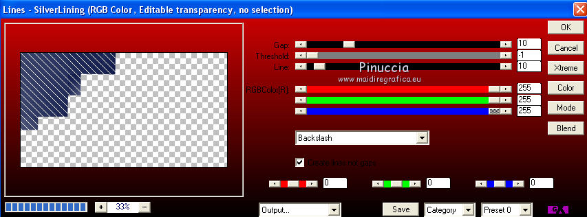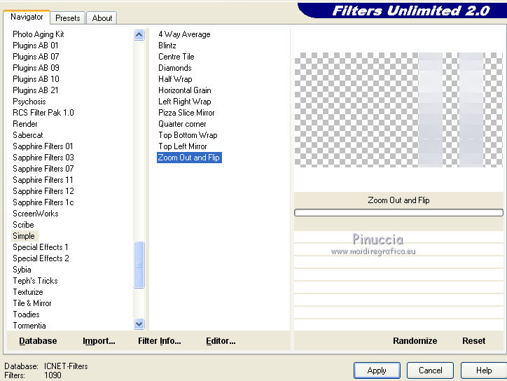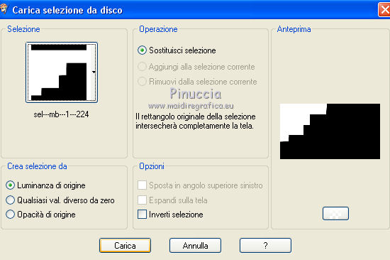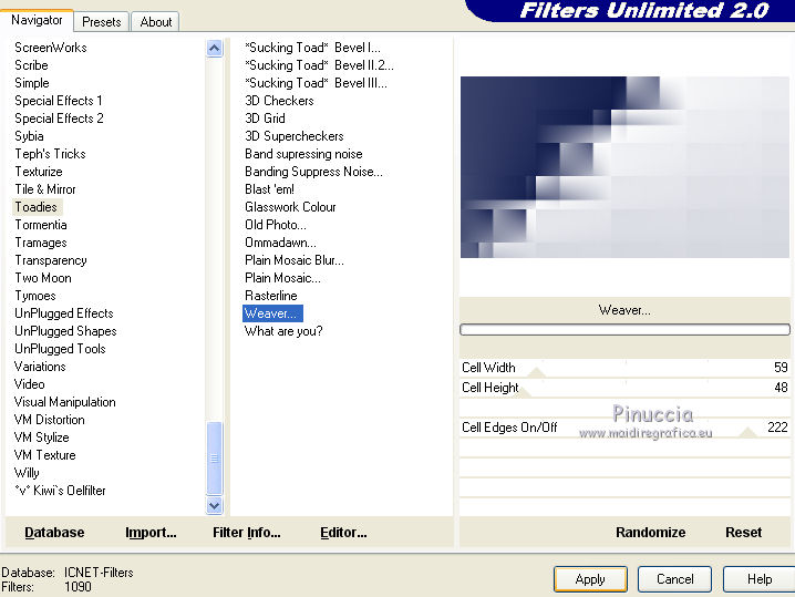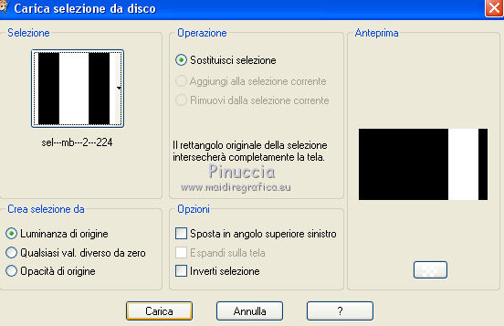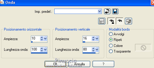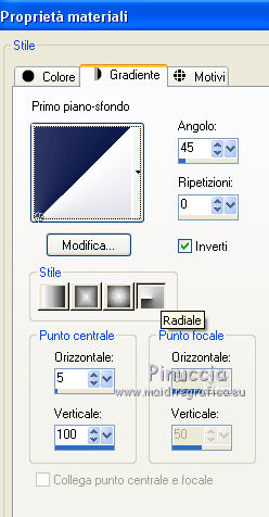 qui puoi trovare qualche risposta ai tuoi dubbi. Se l'argomento che ti interessa non è presente, ti prego di segnalarmelo. Per tradurre il tutorial ho usato Corel X, ma può essere eseguito con ogni versione di PSP. Dalla versione X4, il comando Immagine>Rifletti è stato sostituito con Immagine>Capovolgi in orizzontale, e il comando Immagine>Capovolgi con Immagine>Capovolgi in verticale. Nelle versioni X5 e X6, le funzioni sono state migliorate rendendo disponibile il menu Oggetti. Con la nuova versione X7, sono tornati Rifletti/Capovolgi, ma con nuove differenze Vedi la scheda sull'argomento qui traduzione in francese qui Le vostre versioni qui Occorrente: Materiale qui Per i tubes grazie Kad e SmArt. (in questa pagina trovi i links ai loro siti). Filtri in caso di dubbi, ricorda di consultare la mia sezione filtri qui Filters Unlimited 2.0 qui AP 01 [Innovations] - Lines SilverLining qui Toadies - Weaver qui Simple - Zoom out and flip qui AAA Frames - Foto Frame qui I filtri Simple si possono usare da soli o importati in Filters Unlimited (come fare vedi qui) Se un filtro fornito appare con questa icona ![]() se stai usando altri colori, sperimenta le modalità di miscelatura e opacità più adatte ai tuoi colori Nelle ultime versioni di PSP non c'è il gradiente di primo piano/sfondo (Corel_06_029) Puoi usare i gradienti delle versioni precedenti. Trovi qui i gradienti Corel X. Metti le selezioni nella cartella Selezioni. 1. Imposta il colore di primo piano con il colore #0e194a, e il colore di sfondo con #ffffff. ![]() Passa il colore di primo piano a Gradiente di primo piano/sfondo, stile Radiale ![]() 2. Apri una nuova immagine trasparente 900 x 500 pixels. ![]() Riempi l'immagine trasparente con il gradiente.3. Effetti>Plugins>Filters Unlimited 2.0 - Toadies - Weaver - 2 volte con i settaggi standard. ![]() 4. Effetti>Effetti di bordo>Aumenta. 5. Selezione>Carica/Salva selezione>Carica selezione da disco. Cerca e carica la selezione mb-1-224. ![]() Selezione>Innalza selezione a livello. Selezione>Deseleziona. 6. Effetti>Plugins>AP 01 [Innovations] - Lines SilverLining. ![]() 7. Cambia la modalità di miscelatura di questo livello in Luce diffusa. 8. Effetti>Effetti 3D>Sfalsa ombra, colore nero. ![]() 9. Livelli>Duplica. Immagine>Rifletti. Immagine>Capovolgi. 10. Effetti>Effetti di distorsione>Vento - da destra, intensità 100. ![]() 11. Livelli>Nuovo livello raster. Selezione>Seleziona tutto. 12. Apri KaD_Beach6 e vai a Modifica>Copia. Torna al tuo lavoro e vai a Modifica>Incolla nella selezione. Abbassa l'opacità di questo livello al 60%. Selezione>Deseleziona. 13. Attiva il livello inferiore, Raster 1. Selezione>Carica/Salva selezione>Carica selezione da disco. Cerca e carica la selezione mb-2-224. ![]() Selezione>Innalza selezione a livello. Livelli>Disponi>Porta in alto. Selezione>Deseleziona. 14. Effetti>Plugins>Filters Unlimited 2.0 - Simple - Zoom out and flip. ![]() 15. Effetti>Effetti 3D>Sfalsa ombra, con i settaggi precedenti. ![]() 16. Effetti>Effetti di distorsione>Onda. ![]() 17. Cambia la momdalità di miscelatura di questo livello in Luminanza (esistente). 18. Apri deco-1-224 e vai a Modifica>Copia. Torna al tuo lavoro e vai a Modifica>Incolla come nuovo livello. 19. Tasto K per attivare lo strumento Puntatore ![]() e imposta Posizione X: 39,00 e Posizione Y: 31,00. ![]() ![]() Tasto M per deselezionare lo strumento. 20. Abbassa l'opacità di questo livello al 75%. 21. Apri il tube smArt_v19, cancella il watermark e vai a Modifica>Copia. Torna al tuo lavoro e vai a Modifica>Incolla come nuovo livello. Immagine>Ridimensiona, al 110%, tutti i livelli non selezionato. 22. Tasto K per attivare lo strumento Puntatore ![]() e imposta Posizione X: 340,00 e Posizione Y: 107,00. ![]() ![]() Tasto M per deselezionare lo strumento. 23. Effetti>Effetti 3D>Sfalsa ombra, con i settaggi precedenti. ![]() 24. Immagine>Aggiungi bordatura, 1 pixel, simmetriche, colore scuro. Immagine>Aggiungi bordatura, 10 pixels, simmetriche, colore bianco. Immagine>Aggiungi bordatura, 1 pixel, simmetriche, colore scuro. 25. Selezione>Seleziona tutto. Immagine>Aggiungi bordatura, 40 pixels, simmetriche, colore bianco. Selezione>Inverti. Riempi la selezione con il gradiente.26. Regola>Sfocatura>Sfocatura gaussiana - raggio 100. ![]() 27. Selezione>Inverti. Effetti>Effetti 3D>Sfalsa ombra, con i settaggi precedenti. ![]() Selezione>Deseleziona. 28. Effetti>Plugins>AAA Frames - Foto Frame. ![]() 29. Firma il tuo lavoro su un nuovo livello. 30. Livelli>Unisci>Unisci tutto e salva in formato jpg. ![]() Se hai problemi o dubbi, o trovi un link non funzionante, o anche soltanto per un saluto, scrivimi. 15 Novembre 2018 |