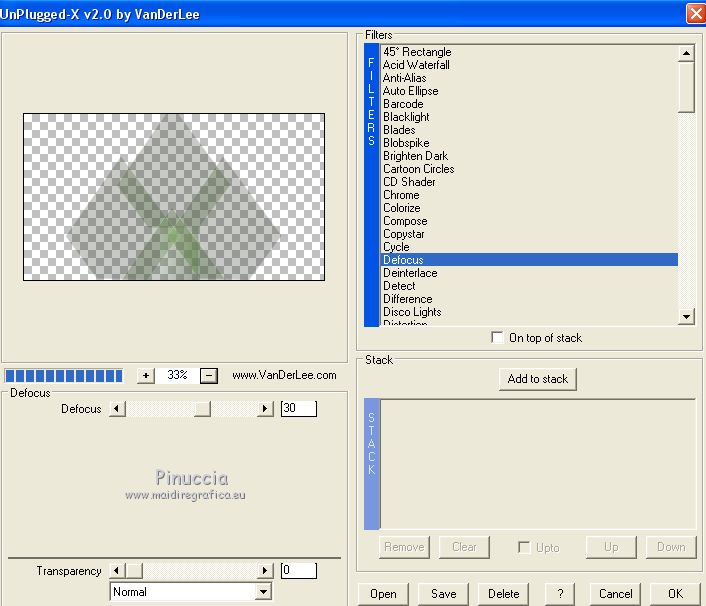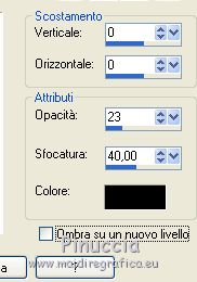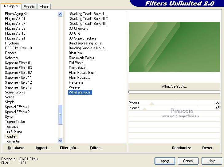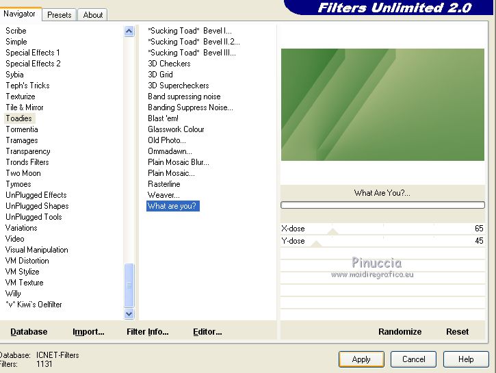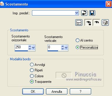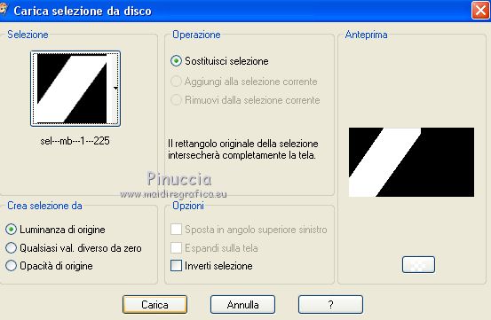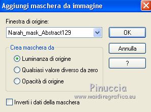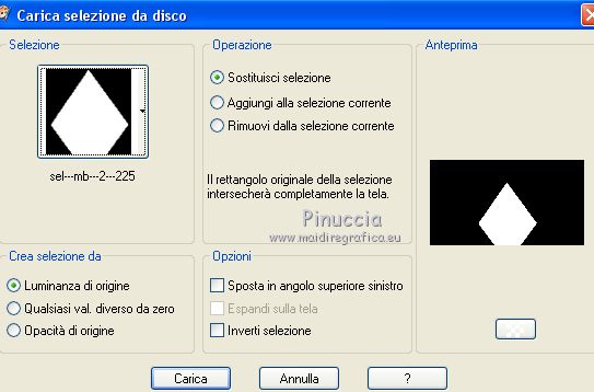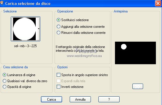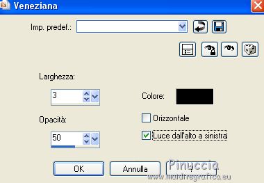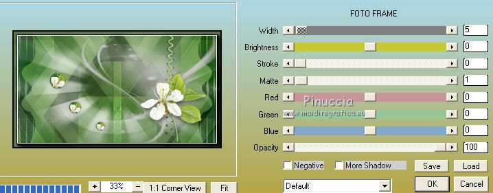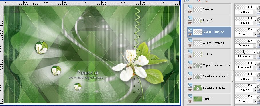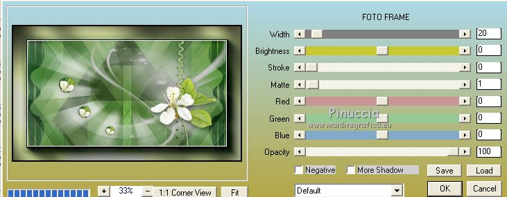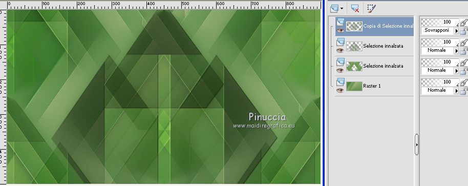 qui puoi trovare qualche risposta ai tuoi dubbi. Se l'argomento che ti interessa non è presente, ti prego di segnalarmelo. Per tradurre il tutorial ho usato Corel X, ma può essere eseguito con ogni versione di PSP. Dalla versione X4, il comando Immagine>Rifletti è stato sostituito con Immagine>Capovolgi in orizzontale, e il comando Immagine>Capovolgi con Immagine>Capovolgi in verticale. Nelle versioni X5 e X6, le funzioni sono state migliorate rendendo disponibile il menu Oggetti. Con la nuova versione X7, sono tornati Rifletti/Capovolgi, ma con nuove differenze Vedi la scheda sull'argomento qui traduzione in francese qui Le vostre versioni qui Occorrente: Materiale qui Filtri in caso di dubbi, ricorda di consultare la mia sezione filtri qui Filters Unlimited 2.0 qui VanDerLee - Unplugged-X qui Alien Skin Eye Candy 5 Impact - Glass qui Toadies - What are you qui Graphics Plus - Graphics Plus qui AAA Frames - Foto Frame qui I filtri Toadies e Graphics Plus si possono usare da soli o importati in Filters Unlimited (come fare vedi qui) Se un filtro fornito appare con questa icona ![]() se stai usando altri colori, sperimenta le modalità di miscelatura e opacità più adatte ai tuoi colori Nelle ultime versioni di PSP non c'è il gradiente di primo piano/sfondo (Corel_06_029) Puoi usare i gradienti delle versioni precedenti. Trovi qui i gradienti Corel X. Metti il preset Emboss 3 nella cartella Impostazioni predefinite Metti le selezioni nella cartella Selezioni. Apri le maschere in PSP e minimizzale con il resto del materiale. 1. Imposta il colore di primo piano con il colore #bcc58e, e il colore di sfondo con #206c20. ![]() Passa il colore di primo piano a Gradiente di primo piano/sfondo, stile Radiale ![]() 2. Apri una nuova immagine trasparente 900 x 500 pixels. ![]() Riempi l'immagine trasparente con il gradiente.3. Effetti>Plugins>Filters Unlimited 2.0 - Toadies -What are you attenzione: il risultato di questo effetto cambia se usato solo o importato in Unlimited. E ancora cambia secondo la versione di Unlimited utilizzata (la versione software o la versione con file 8bf). con versione in file 8bf ![]() con versione Unlimited software ![]() da solo ![]() 4. Selezione>Carica/Salva selezione>Carica selezione da disco. Cerca e carica la selezione mb-1-225. ![]() Selezione>Innalza selezione a livello. Selezione>Deseleziona. 5. Livelli>Duplica. Immagine>Rifletti. Livelli>Unisci>Unisci giù. 6. Effetti>Effetti 3D>Sfalsa ombra, colore nero. ![]() Effetti>Effetti di bordo>Aumenta. 7. Effetti>Effetti di immagine>Motivo unico, con i settaggi standard. ![]() 8. Attiva il livello inferiore, Raster 1. Selezione>Carica/Salva selezione>Carica selezione da disco. Cerca e carica la selezione mb-2-225. ![]() Selezione>Innalza selezione a livello. Livelli>Disponi>Porta in alto. Selezione>Deseleziona. 9. Effetti>Plugins>VanDerLee - Unplugged-X ![]() 10. Effetti>Filtro definito dall'utente - seleziona il preset Emboss 3 e ok. ![]() 11. Effetti>Effetti 3D>Sfalsa ombra, con i settaggi precedenti. ![]() 12. Livelli>Duplica. Effetti>Effetti di immagine>Motivo unico, con i settaggi standard. 13. Cambia la modalità di miscelatura di questo livello in Sovrapponi. ![]() 14. Apri il tube deco-mb-225-groen e vai a Modifica>Copia. Torna al tuo lavoro e vai a Modifica>Incolla come nuovo livello. Mantieni la modalità di miscelatura di questo livello in Differenza e l'opacità al 40%. 15. Imposta il colore di primo piano con il colore bianco. Livelli>Nuovo livello raster. Riempi il livello con il colore bianco.16. Livelli>Nuovo livello maschera>Da immagine. Apri il menu sotto la finestra di origine e vedrai la lista dei files aperti. Seleziona la maschera masker-225. ![]() Livelli>Duplica. Livelli>Unisci>Unisci gruppo. 17. Livelli>Nuovo livello raster. Riempi il livello con il colore bianco.18. Livelli>Nuovo livello maschera>Da immagine. Apri il menu sotto la finestra di origine e seleziona la maschera Narah_mask_Abstract129. ![]() Livelli>Unisci>Unisci gruppo. 19. Effetti>Effetti di trama>Veneziana. ![]() 20. Livelli>Duplica. Livelli>Unisci>Unisci giù. 21. Apri il tube 0_c40f4_f656422f_L e vai a Modifica>Copia. Torna al tuo lavoro e vai a Modifica>Incolla come nuovo livello. 22. Effetti>Effetti 3D>Sfalsa ombra, con i settaggi precedenti. ![]() 23. Effetti>Effetti di immagine>Scostamento. ![]() 24. Livelli>Nuovo livello raster. Selezione>Carica/Salva selezione>Carica selezione da disco. Cerca e carica la selezione sel-mb-3-225. ![]() 25. Riporta il colore di primo piano al colore iniziale e al Gradiente. ![]() Riempi la selezione con il gradiente.26. Attiva il livello Raster 3 (il tube del fiore). Livelli>Duplica. Livelli>Disponi>Porta in alto. Posiziona il tube sulla selezione![]() Selezione>Inverti. Premi sulla tastiera il tasto CANC ![]() Selezione>Deseleziona. Livelli>Unisci>Unisci giù. 27. Effetti>Plugins>Alien Skin Eye Candy 5 Impact - Glass. Seleziona il preset Clear e ok. ![]() 28. Immagine>Ridimensiona, 2 volte al 75%, tutti i livelli non selezionato. 29. Livelli>Duplica. Immagine>Ridimensiona, al 75%, tutti i livelli non selezionato. 30. Ancora Livelli>Duplica. Immagine>Ridimensiona, al 75%, tutti i livelli non selezionato. 31. Posiziona correttamente le tre immagini![]() 32. Assicurati di essere posizionato sul livello superiore. Livelli>Unisci>Unisci giù - 2 volte. Regola>Messa a fuoco>Metti a fuoco. 33. Effetti>Effetti 3D>Sfalsa ombra, con i settaggi precedenti. ![]() 34. Dovresti avere questo ![]() 35. Immagine>Aggiungi bordatura, 1 pixel, simmetriche, colore scuro. Immagine>Aggiungi bordatura, 3 pixels, simmetriche, colore chiaro. Immagine>Aggiungi bordatura, 1 pixel, simmetriche, colore scuro. 36. Selezione>Seleziona tutto. Effetti>Plugins>AAA Frames - Foto Frame. ![]() 37. Immagine>Aggiungi bordatura, 40 pixels, simmetriche, colore chiaro. 38. Selezione>Inverti. Effetti>Plugins>Graphics Plus - Cross Shadow, con i settaggi standard. ![]() 39. Regola>Aggiungi/Rimuovi disturbo>Aggiungi disturbo. !
