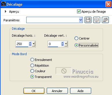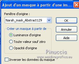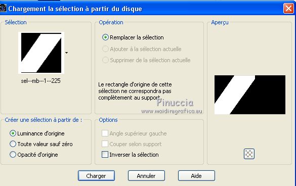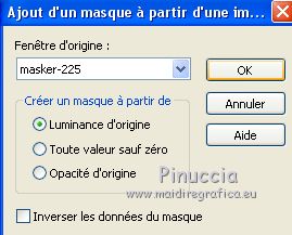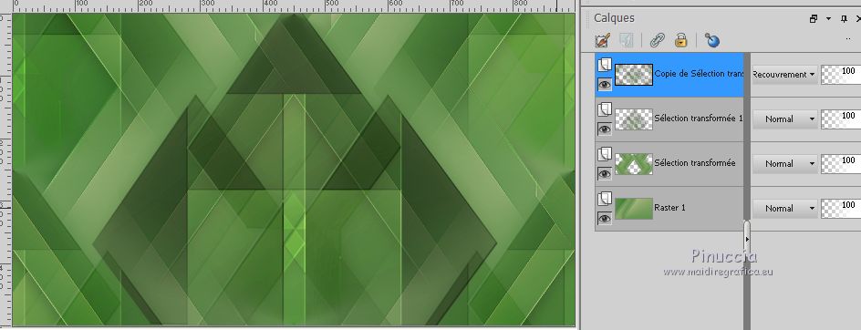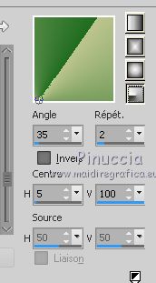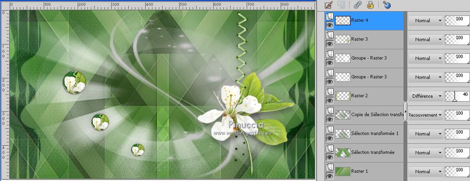 Ce tutoriel a été créé avec CorelX17, mais il peut également être exécuté avec les autres versions. Pour traduire le tutoriel j'ai utilisé CorelX17 pour l'italien et CorelX2 pour le français. Suivant la version utilisée, vous pouvez obtenir des résultats différents. Depuis la version X4, la fonction Image>Miroir a été remplacée par Image>Renverser horizontalement, et Image>Renverser avec Image>Renverser verticalement. Dans les versions X5 et X6, les fonctions ont été améliorées par la mise à disposition du menu Objets. Dans la nouvelle version X7, nous avons à nouveau Miroir/Renverser, mais avec autres différences. Voir plus les détails à ce sujet ici Certaines dénominations ont changées entre les versions de PSP. Les plus frequentes dénominations utilisées: ![]() Traduction en italien ici Vos versions ici Nécessaire pour réaliser ce tutoriel: Matériel qui Pour les tubes merci Kad et SmArt. (les liens des sites des tubeuses ici) Modules Externes consulter, si nécessaire, ma section de filtre ici Filters Unlimited 2.0 ici Toadies - What are you ici VanDerLee - Unplugged-X qui Alien Skin Eye Candy 5 Impact - Glass qui Graphics Plus - Graphics Plus qui AAA Frames - Foto Frame ici Filtres Simple, Graphics Plus et Toadies peuvent être utilisés seuls ou importés dans Filters Unlimited. voir comment le faire ici). Si un filtre est fourni avec cette icône, ![]() Si vous voulez utiliser vos propres couleurs, n'hésitez pas à changer le mode et l'opacité des calques Dans les plus récentes versions de PSP, vous ne trouvez pas le dégradé d'avant plan/arrière plan ou Corel_06_029. Vous pouvez utiliser le dégradé des versions antérieures. Ici le dossier Dégradés de CorelX. Placer le preset Emboss 3 dans le dossier Paramètres par défaut. Placer les sélections dans le dossier Sélections. Ouvrir les masques dans PSP et les minimiser avec le reste du matériel. 1. Placer en avant plan la couleur #bcc58e, et en arrière plan #206c20. ![]() Préparer en avant plan un dégradé de premier plan/arrière plan, style Radial. ![]() 2. Ouvrir une nouvelle image transparente 900 x 500 pixels. ![]() Remplir l'image transparente du dégradé.3. Effets>Modules Externes>Filters Unlimited 2.0 - Toadies - What are you attention: le résultat de cet effet change si utilisé seul ou importée dans Unlimited; et également il change selon la version de Unlimited utilisée (version software ou version files 8bf). version files 8bf ![]() version Unlimited software ![]() seul ![]() 4. Sélections>Charger/Enregistrer une sélection>Charger à partir du disque. Chercher et charger la sélection mb-1-225. ![]() Sélections>Transformer la sélection en calque. Sélections>Désélectionner tout. 5. Calques>Dupliquer. Image>Miroir. Calques>Fusionner>Fusionner le calque de dessous. 6. Effets>Effets 3D>Ombre portée, couleur noire. ![]() Effets>Effets de bords>Accentuer. 7. Effets>Effets d'image>Mosaïque sans jointures, par défaut. ![]() 8. Vous positionner sur le calque du bas de la pile, Raster 1. Sélections>Charger/Enregistrer une sélection>Charger à partir du disque. Chercher et charger la sélection mb-2-225. ![]() Sélections>Transformer la sélection en calque. Calques>Agencer>Placer en haut de la pile. Sélections>Désélectionner tout. 9. Effets>Modules Externes>VanDerLee - Unplugged-X ![]() 10. Effets>Filtre personnalisé - sélectionner le preset Emboss 3 et ok ![]() 11. Effets>Effets 3D>Ombre portée, comme précédemment. ![]() 12. Calques>Dupliquer. Effets>Effets d'image>Mosaïque sans jointures, par défaut. 13. Placer le calque en mode Recouvrement. ![]() 14. Ouvrir le tube deco-mb-225-groen - Édition>Copier. Revenir sur votre travail et Édition>Coller comme nouveau calque. Garder le calque en mode Différence et réduire l'opacité à 40%. 15. Placer en avant plan la couleur blanche. Calques>Nouveau calque raster. Remplir le calque avec la couleur blanche.16. Calques>Nouveau calque de masque>A partir d'une image. Ouvrir le menu deroulant sous la fenêtre d'origine et vous verrez la liste des images ouvertes. Sélectionner le masque masker-225. ![]() Calques>Dupliquer. Calques>Fusionner>Fusionner le groupe. 17. Calques>Nouveau calque raster. Remplir le calque avec la couleur blanche.18. Calques>Nouveau calque de masque>A partir d'une image. Ouvrir le menu deroulant sous la fenêtre d'origine et sélectionner le masque Narah_mask_Abstract129. ![]() Calques>Fusionner>Fusionner le groupe. 19. Effets>Effets de textures>Stores ![]() 20. Calques>Dupliquer. Calques>Fusionner>Fusionner le calque de dessous. 21. Ouvrir le tube 0_c40f4_f656422f_L - Édition>Copier. Revenir sur votre travail et Édition>Coller comme nouveau calque. 22. Effets>Effets 3D>Ombre portée, comme précédemment. ![]() 23. Effets>Effets d'image>Décalage. ![]() 24. Calques>Nouveau calque raster. Sélections>Charger/Enregistrer une sélection>Charger à partir du disque. Chercher et charger la sélection sel-mb-3-225. ![]() 25. Placer à nouveau en avant plan la couleur du début et le Dégradé Radial ![]() Remplir la sélection du dégradé.26. Vous positionner sur le calque Raster 3 (le tube de la fleur) Calques>Dupliquer. Calques>Agencer>Placer en haut de la pile. bien le tube sur la sélection![]() Sélections>Inverser. Presser CANC sur le clavier ![]() Sélections>Désélectionner tout. Calques>Fusionner>Fusionner le calque de dessous. 27. Effets>Modules Externes>Alien Skin Eye Candy 5 Impact - Glass. Sélectionner le preset Clear et ok. ![]() 28. Image>Redimensionner, 2 fois à 75%, redimensionner tous les calques décoché. 29. Calques>Dupliquer. Image>Redimensionner, à 75%, redimensionner, tous les calques décoché. 30. À nouveau Calques>Dupliquer. Image>Redimensionner, à 75%, redimensionner, tous les calques décoché. 31. Positionner bien les trois images.![]() 32. Assurez-vous d'être positionné sur le calque du haut de la pile. Calques>Fusionner>Fusionner le calque de dessous - 