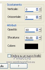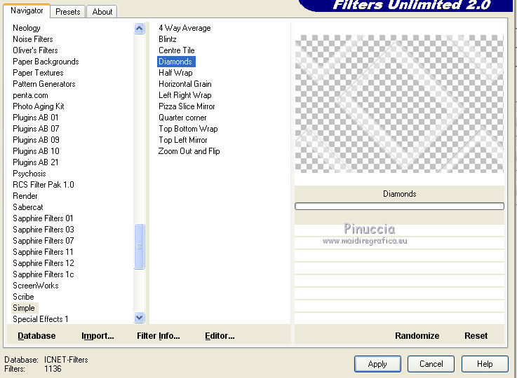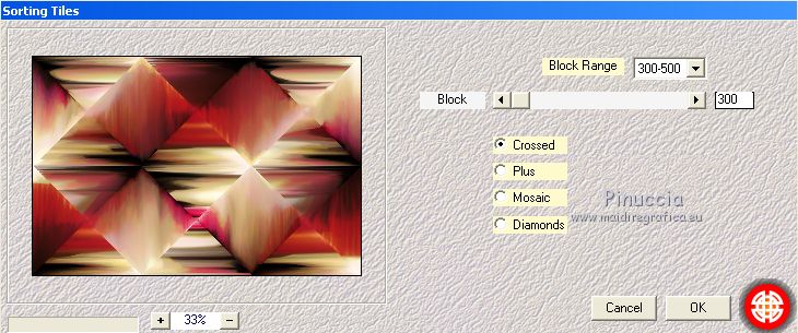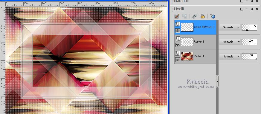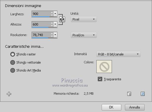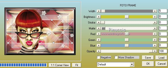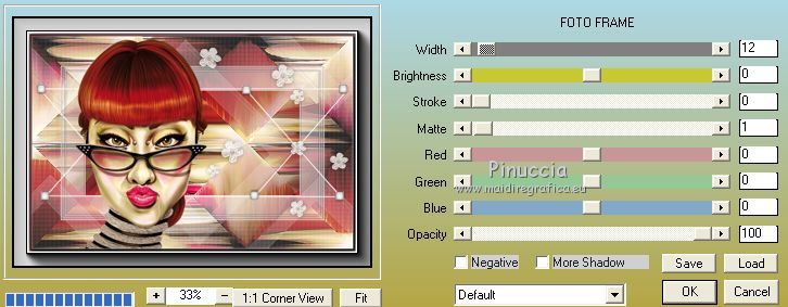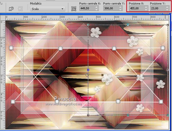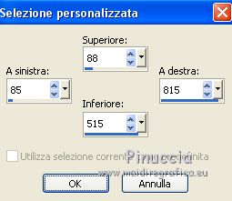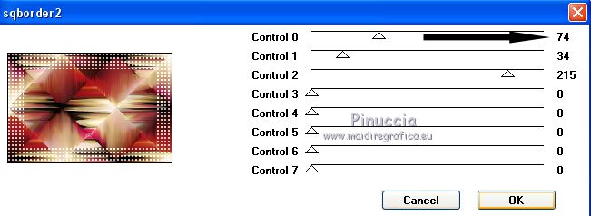 qui puoi trovare qualche risposta ai tuoi dubbi. Se l'argomento che ti interessa non è presente, ti prego di segnalarmelo. Per tradurre il tutorial ho usato Corel X7, ma può essere eseguito con ogni versione di PSP. Dalla versione X4, il comando Immagine>Rifletti è stato sostituito con Immagine>Capovolgi in orizzontale, e il comando Immagine>Capovolgi con Immagine>Capovolgi in verticale. Nelle versioni X5 e X6, le funzioni sono state migliorate rendendo disponibile il menu Oggetti. Con la nuova versione X7, sono tornati Rifletti/Capovolgi, ma con nuove differenze Vedi la scheda sull'argomento qui traduzione in francese qui Le vostre versioni qui Occorrente: Materiale qui Filtri in caso di dubbi, ricorda di consultare la mia sezione filtri qui Filters Unlimited 2.0 qui Mehdi - Sorting Tiles qui AFS IMPORT - sqborder2 qui Simple - Diamonds qui I filtri AFS IMPORT e Simple si possono usare da soli o importati in Filters Unlimited (come fare vedi qui) Se un filtro fornito appare con questa icona ![]() se stai usando altri colori, sperimenta le modalità di miscelatura e opacità più adatte ai tuoi colori Nelle ultime versioni di PSP non c'è il gradiente di primo piano/sfondo (Corel_06_029) Puoi usare i gradienti delle versioni precedenti. Trovi qui i gradienti Corel X. 1. Imposta il colore di primo piano con il colore #f57089, e il colore di sfondo con #ae101e. ![]() Passa il colore di primo piano a Gradiente di primo piano/sfondo, stile Lineare ![]() 2. Apri una nuova immagine trasparente 900 x 600 pixels. ![]() Riempi l'immagine trasparente con il gradiente.3. Selezione>Seleziona tutto. Apri il tube Criss 2772, e vai a Modifica>Copia. minimizza il tube. Torna al tuo lavoro e vai a Modifica>Incolla nella selezione. Selezione>Deseleziona. 4. Effetti>Effetti di immagine>Motivo unico, con i settaggi standard. ![]() 5. Effetti>Plugins>Mehdi - Sorting Tiles. ![]() 6. Effetti>Effetti di bordo>Aumenta di più. 7. Effetti>Plugins>AFS IMPORT - sqborder2. ![]() 8. Attiva lo strumento Selezione ![]() (non importa il tipo di selezione impostato, perchè con la selezione personalizzata si ottiene sempre un rettangolo) clicca sull'icona Selezione personalizzata ![]() e imposta i seguenti settaggi. ![]() 9. Livelli>Nuovo livello raster. Imposta il colore di primo piano con il colore bianco #ffffff. Riempi la selezione con il colore bianco.10. Selezione>Modifica>Contrai - 2 pixels. Premi sulla tastiera il tasto CANC ![]() Abbassa l'opacità dello strumento Riempimento a 50, modalità Nessuno ![]() Riempi la selezione con il colore bianco.11. Selezione>Modifica>Contrai - 10 pixels. Premi sulla tastiera il tasto CANC. Riporta l'opacità dello strumento Riempimento a 100 Riempi la selezione con il colore bianco.12. Selezione>Modifica>Contrai - 2 pixels. Premi sulla tastiera il tasto CANC. 13. Riporta l'opacità a 50 Riempi con il colore bianco.14. Selezione>Modifica>Contrai - 50 pixels. Premi sulla tastiera il tasto CANC. Riporta l'opacità a 100. Riempi con il colore bianco.15. Selezione>Modifica>Contrai - 2 pixels. Premi sulla tastiera il tasto CANC. Selezione>Deseleziona. 16. Effetti>Effetti di bordo>Aumenta. 17. Livelli>Duplica. 18. Effetti>PluginS>Filters Unlimited 2.0 - Simple - Diamonds. ![]() 19. Abbassa l'opacità di questo livello al 35%. ![]() 20. Apri deco-226-mb e vai a Modifica>Copia. Torna al tuo lavoro e vai a Modifica>Incolla come nuovo livello. 21. Effetti>Effetti di immagine>Scostamento. ![]() 22. Apri deco-226 e vai a Modifica>Copia. Torna al tuo lavoro e vai a Modifica>Incolla come nuovo livello. 23. Tasto K sulla tastiera per attivare lo strumento Puntatore ![]() e imposta Posizione X: 455,00 e Posizione Y: 23,00. ![]() Tasto M per deselezionare lo strumento. 24. Attiva nuovamente il tube Criss 2722 e vai a Modifica>Copia. Torna al tuo lavoro e vai a Modifica>Incolla come nuovo livello. Immagine>Ridimensiona, al 75%, tutti i livelli non selezionato. 25. Strumento Puntatore ![]() e imposta Posisione X: 126,00 e Posizione Y: 14,00. ![]() Tasto M per deselezionare lo strumento. 26. Immagine>Aggiungi bordatura, 1 pixel, simmetriche, colore scuro di sfondo. 27. Selezione>Seleziona tutto. Immagine>Aggiungi bordatura, 45 pixels, simmetriche, colore bianco #ffffff. 28. Effetti>Plugins>AAA Frames - Foto Frame. ![]() 29. Effetti>Effetti 3D>Sfalsa ombra, colore nero. ![]() Selezione>Deseleziona. 30. Effetti>Plugins>AAA Frames - Foto Frame - width a 12. ![]() 31. Firma il tuo lavoro e salva in formato jpg. Il tube di questo esempio è di Tigre Blanc ![]() Il tube di questo esempio è di Louise ![]() ![]() Se hai problemi o dubbi, o trovi un link non funzionante, o anche soltanto per un saluto, scrivimi. 1 Marzo 2019 |