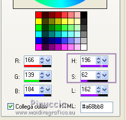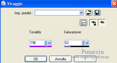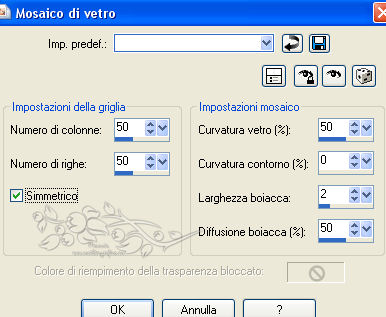 qui puoi trovare qualche risposta ai tuoi dubbi. Se l'argomento che ti interessa non è presente, ti prego di segnalarmelo. Per tradurre questo tutorial ho usato Corel X, ma può essere eseguito con ogni versione di PSP. Dalla versione X4, il comando Immagine>Rifletti è stato sostituito con Immagine>Capovolgi in orizzontale, e il comando Immagine>Capovolgi con Immagine>Capovolgi in verticale. Nelle versioni X5 e X6, le funzioni sono state migliorate rendendo disponibile il menu Oggetti. Con la nuova versione X7, sono tornati Rifletti/Capovolgi, ma con nuove differenze Vedi la scheda sull'argomento qui traduzione in francese qui Le vostre versioni qui Occorrente: Materiale qui Il tube è di Lia Limnida. Filtri in caso di dubbi, ricorda di consultare la mia sezione filtri qui Mura's Meister - Copies qui ![]() se stai usando altri colori, sperimenta le modalità di miscelatura e opacità più adatte ai tuoi colori 1. Apri una nuova immagine bianca 600 x 600 pixels. ![]() 2. Apri l'immagine di sfondo "Stip" e vai a Modifica>Copia. Torna al tuo lavoro e vai a Modifica>Incolla come nuovo livello. 3. Apri le tube Ster e vai a Modifica>Copia. Torna al tuo lavoro e vai a Modifica>Incolla come nuovo livello. 4. Apri il tube Bloem1 e vai a Modifica>Copia. Torna al tuo lavoro e vai a Modifica>Incolla come nuovo livello. 5. Livelli>Duplica. 6. Attiva il livello sottostante del fiore originale. Effetti>Effetti di trama>Mosaico di vetro. ![]() 7. Attiva il livello superiore della copia. Livelli>Duplica. 8. Effetti>Plugins>Mura's Meister - Copies. ![]() 9. Apri il tube di Lia e vai a Modifica>Copia. Torna al tuo lavoro e vai a Modifica>Incolla come nuovo livello. Immagine>Ridimensiona, al 90%, tutti i livelli non selezionato. Regola>Messa a fuoco>Metti a fuoco. (con lo strumento Gomma o Selezione ![]() cancella il testo del tube. Posiziona correttamente il tube.10. Effetti>Effetti 3D>Sfalsa ombra, colore nero. ![]() 11. Se stai usando altri colori, per adattare il materiale ai tuoi colori, prendi nota dei valori di Tonalità (H) e Saturazione (S) del tuo colore ![]() Regola>Tonalità e saturazione>Viraggio e trascrivi i valori annotati nelle rispettive caselle. ![]() 12. Immagine>Aggiungi bordatura, 1 pixels, simmetriche, colore nero. Immagine>Aggiungi bordatura, 10 pixels, simmetriche, colore bianco. 13. Firma il tuo lavoro su un nuovo livello. Salva in formato jpg. ![]() Se hai problemi o dubbi, o trovi un link non funzionante, o anche soltanto per un saluto, scrivimi. 12 Giugno 2016 |