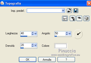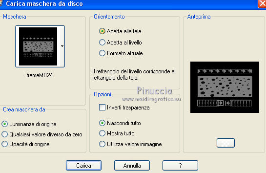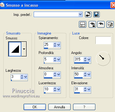 qui puoi trovare qualche risposta ai tuoi dubbi. Se l'argomento che ti interessa non è presente, ti prego di segnalarmelo. Questo tutorial è stato tradotto con CorelX, ma può essere eseguito con ogni versione di PSP. Dalla versione X4, il comando Immagine>Rifletti è stato sostituito con Immagine>Capovolgi in orizzontale, e il comando Immagine>Capovolgi con Immagine>Capovolgi in verticale. Nelle versioni X5 e X6, le funzioni sono state migliorate rendendo disponibile il menu Oggetti. Con la nuova versione X7, sono tornati Rifletti/Capovolgi, ma con nuove differenze Vedi la scheda sull'argomento qui traduzione in francese qui Occorrente: Materiale qui Filtri in caso di dubbi, ricorda di consultare la mia sezione filtri qui Filters Unlimited 2.0 qui Photo Aging Kit - Photo Frame 02 (da importare in Unlimited) qui FM Tile Tools - Blend Emboss qui ![]() se stai usando altri colori, sperimenta le modalità di miscelatura e opacità più adatte ai tuoi colori Metti la maschera nella cartella Maschere. Imposta il colore di primo piano con il colore nero, e il colore di sfondo con #ff0000. 1. Apri una nuova immagine trasparente 600 x 450 pixels, e riempila con il colore nero.2. Livelli>Nuovo livello raster. Riempi con il colore #ff0000.3. Livelli>Carica/salva maschera>Carica maschera da disco. Cerca e carica la maschera FrameMB24. ![]() Livelli>Unisci>Unisci gruppo. 4. Effetti>Effetti 3D>Smusso a incasso. ![]() 5. Apri il tube roos106 e vai a Modifica>Copia. Torna al tuo lavoro e vai a Modifica>Incolla come nuovo livello. Spostalo nella maschera, a destra.6. Livelli>Duplica. Attiva il livello sottostante del tube originale. 7. Effetti>Effetti artistici>Topografia, colore bianco. ![]() Effetti>Effetti di bordo>Aumenta. 8. Attiva il livello superiore. Immagine>Ridimensiona, al 95%, tutti i livelli non selezionato. Sposta il tube un po' più a destra e in basso.![]() Abbassa l'opacità di questo livello al 90%. 9. Effetti>Plugins>FM Tile Tools - Blend Emboss - 2 volte con i settaggi standard. ![]() 10. Apri il tube ring e vai a Modifica>Copia. Torna al tuo lavoro e vai a Modifica>Incolla come nuovo livello. Spostalo in alto a sinistra, nella maschera.11. Effetti>Effetti 3D>Sfalsa ombra, colore nero. ![]() 12. Livelli>Duplica. Immagine>Ridimensiona, al 75%, tutti i livelli non selezionato. Sposta questo tube un po' più in basso e a destra.![]() Abbassa l'opacità di questo livello all'80%. 13. Apri il tube vlindertube e vai a Modifica>Copia. Torna al tuo lavoro e vai a Modifica>Incolla come nuovo livello. Attiva lo strumento Puntatore ![]() ![]() Usa i nodi centrali per ridimensionare il tube, pressappoco come nell'esempio ![]() Muovi il mouse sulla griglia e, quando vedi le due frecce arrotondate, ruota leggermente il tube, pressappoco come nell'esempio. ![]() Regola>Messa a fuoco>Metti a fuoco. 14. Effetti>Effetti 3D>Sfalsa ombra, con i settaggi precedenti. 15. Effetti>Plugins>FM Tile Tools - Blend Emboss, con i settaggi precedenti. 16. Attiva il livello nero di sfondo. Effetti>Plugins>Filters Unlimited 2.0 - Photo Aging Kit - Photo Frame 02. ![]() 17. Attiva lo strumento Bacchetta magica tolleranza 20, sfumatura 0,e clicca nella cornice bianca, anche più volte se necessario, per selezionarla. ![]() 18. Selezione>Modifica>Espandi - 1 pixel. 19. Imposta il colore di primo piano con #7d0000. Livelli>Nuovo livello raster. Riempi la selezione con il colore #7d0000.Selezione>Deseleziona. 20. Effetti>Plugins>FM Tile Tools - Blend Emboss, con i settaggi precedenti. 21. Livelli>Unisci>Unisci tutto. 22. Immagine>Aggiungi bordatura, 10 pixels, simmetriche, colore nero. Immagine>Aggiungi bordatura, 1 pixel, simmetriche, #ff0000. Immagine>Aggiungi bordatura, 10 pixels, simmetriche, colore nero. 23. Regola>Messa a fuoco>Maschera di contrasto. ![]() 24. Firma il tuo lavoro su un nuovo livello. Livelli>Unisci>Unisci tutto e salva in formato jpg. ![]() Se hai problemi o dubbi, o trovi un link non funzionante, o anche soltanto per un saluto, scrivimi. 8 Agosto 2017 |