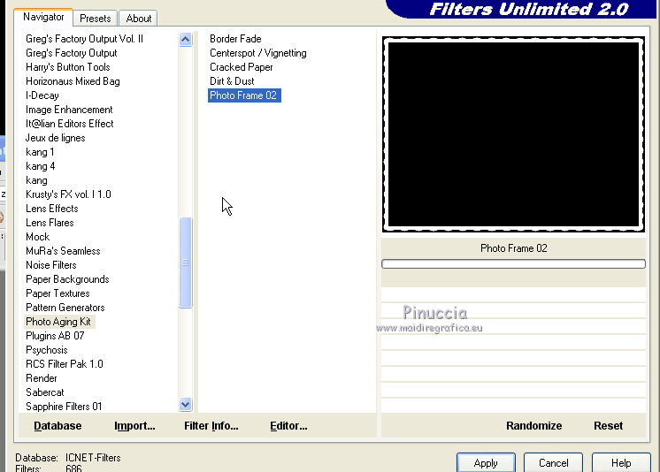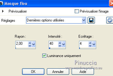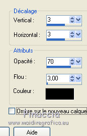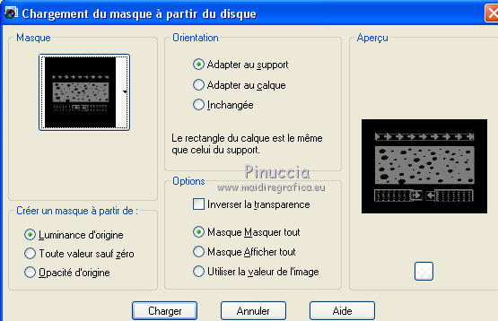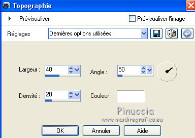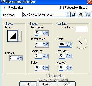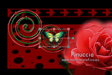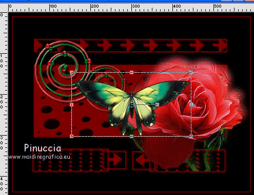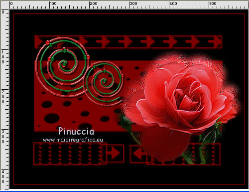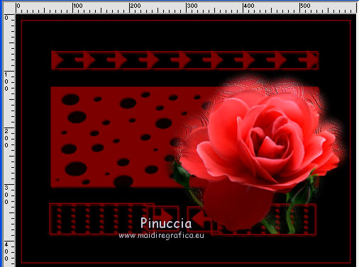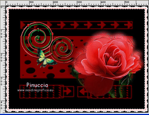 Ce tutoriel a été traduit avec CorelX2, mais il peut également être exécuté avec les autres versions. Suivant la version utilisée, vous pouvez obtenir des résultats différents. Depuis la version X4, la fonction Image>Miroir a été remplacée par Image>Renverser horizontalement, et Image>Renverser avec Image>Renverser verticalement. Dans les versions X5 et X6, les fonctions ont été améliorées par la mise à disposition du menu Objets. Dans la nouvelle version X7, nous avons à nouveau Miroir/Renverser, mais avec autres différences. Voir plus les détails à ce sujet ici Certaines dénominations ont changées entre les versions de PSP. Les plus frequentes dénominations utilisées: ![]() Traduction en italien ici Nécessaire pour réaliser ce tutoriel: Matériel qui (les liens des sites des tubeuses ici) Modules Externes consulter, si nécessaire, ma section de filtre ici Filters Unlimited 2.0 ici Photo Aging Kit - Photo Frame 02 (à importer dans Unlimited) ici FM Tile Tools - Blend Emboss ici ![]() Si vous voulez utiliser vos propres couleurs, n'hésitez pas à changer le mode et l'opacité des calques Placer le masque dans le dossier Masques. Placer en avant plan la couleur noire #000000, et en arrière plan la couleur #ff0000. 1. Ouvrir une nouvelle image transparente 600 x 450 pixels, Remplir l'image avec la couleur noire.2. Calques>Nouveau calque raster. Remplir le calque avec la couleur d'arrière plan #ff0000.3. Calques>Charger/Enregistrer un masque>Charger à partir du disque. Chercher et charger le masque FrameMB24. ![]() Calques>Fusionner>Fusionner le groupe. 4. Effets>Effets 3D>Biseautage intérieur. ![]() 5. Ouvrir le tube roos106 - Édition>Copier. Revenir sur votre travail ete Édition>Coller comme nouveau calque. Déplacer le tube dans le masque, à droite.6. Calques>Dupliquer. Vous positionner sur le calque de dessous de l'original. 7. Effets>Effets artistiques>Topographie, couleur blanche. ![]() Effets>Effets de bords>Accentuer. 8. Vous positionner sur le calque du haut de la pile. Image>Redimensionner, à 95%, redimensionner tous les calques décoché. Déplacer le tube un peu plus à droite et en bas.![]() Réduire l'opacité de ce calque à 90%. 9. Effets>Modules Externes>FM Tile Tools - Blend Emboss - 2 fois, par défaut. ![]() 10. Ouvrir le tube ring - Édition>Copier. Revenir sur votre travail ete Édition>Coller comme nouveau calque. Déplacer le tube dans le masque, en haut à gauche.11. Effets>Effets 3D>Ombre portée, couleur noire. ![]() 12. Calques>Dupliquer. Image>Redimensionner, à 75%, redimensionner tous les calques décoché. Déplacer ce tube un peu plus en bas et à droite.![]() Réduire l'opacité de ce calque à 80%. 13. Ouvrir le tube vlindertube - Édition>Copier. Revenir sur votre travail ete Édition>Coller comme nouveau calque. Activer l'outil Sélecteur ![]() ![]() utiliser les noeuds au centre pour redimensionner le tube, à peu près comme ci-dessous. ![]() Glissez la souris sur la grille et, lorsque vous voyez les deux flèches rondes, rotez légèrement le tube, à peu pres comme ci-dessous. ![]() Réglage>Netteté>Netteté. 14. Effets>Effets 3D>Ombre portée, comme précédemment. 15. Effets>Modules Externes>FM Tile Tools - Blend Emboss, comme précédemment. 16. Vous positionner sur le calque noir d'arrière plan. Effets>Modules Externes>Filters Unlimited 2.0 - Photo Aging Kit - Photo Frame 02. ![]() 17. Activer l'outil Baguette magique tolérance 20, progressivité 0,et cliquer sur le cadre blanc, plusières fois si nécessaire, pour le sélectionner. ![]() 18. Sélections>Modifier>Agrandir - 1 pixels. 19. Placer en avant plan la couleur #7d0000. Calques>Nouveau calque raster. Remplir la sélection avec la couleur #7d0000.Sélections>Désélectionner tout. 20. Effets>Modules Externes>FM Tile Tools - Blend Emboss, comme précédemment. 21. Calques>Fusionner>Tous. 22. Image>Ajouter des bordures, 10 pixels, symétrique, couleur noire. Image>Ajouter des bordures, 1 pixel, symétrique, #ff0000. Image>Ajouter des bordures, 10 pixels, symétrique, couleur noire. 23. Réglage>Netteté>Masque flou. ![]() 24. Signer votre travail sur un nouveau calque. Calques>Fusionner>Tous et enregistrer en jpg. ![]() Si vous avez des problèmes, ou des doutes, ou vous trouvez un link modifié, ou seulement pour me dire que ce tutoriel vous a plu, vous pouvez m'écrire. 18 Juillet 2017 |