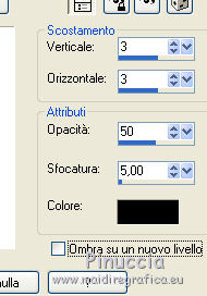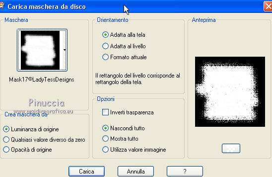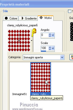 qui puoi trovare qualche risposta ai tuoi dubbi. Se l'argomento che ti interessa non è presente, ti prego di segnalarmelo. Questo tutorial è stato tradotto con CorelX, ma può essere eseguito con ogni versione di PSP. Dalla versione X4, il comando Immagine>Rifletti è stato sostituito con Immagine>Capovolgi in orizzontale, e il comando Immagine>Capovolgi con Immagine>Capovolgi in verticale. Nelle versioni X5 e X6, le funzioni sono state migliorate rendendo disponibile il menu Oggetti. Con la nuova versione X7, sono tornati Rifletti/Capovolgi, ma con nuove differenze Vedi la scheda sull'argomento qui traduzione in francese qui Occorrente: Materiale qui Elementi scrap Scrappy Expression. ![]() Metti la maschera nella cartella Maschere. 1. Apri una nuova immagine bianca 600 x 600 pixels. ![]() 2. Apri la trama Clarey-rubylicious-paper6 e minimizzala. Passa il colore di primo piano a Motivi e cerca la trama sotto la categoria Immagini aperte. Seleziona la trama con i seguenti settaggi: ![]() Livelli>Nuovo livello raster. Riempi il livello con il motivo.3. Livelli>Carica/Salva maschera>Carica maschera da disco. Cerca e carica la maschera Mask17-C-LadyTessDesigns.jpg. ![]() Livelli>Unisci>Unisci gruppo. Regola>Messa a fuoco>Metti a fuoco. 4. Apri il tube Clarey-rubylicious-fancyenvelope e vai a Modifica>Copia. Torna al tuo lavoro e vai a Modifica>Incolla come nuovo livello. ![]() 5. Apri il tube Lint-strip e vai a Modifica>Copia. Torna al tuo lavoro e vai a Modifica>Incolla come nuovo livello. Spostalo a destra.![]() 6. Apri il tube Clarey-rubylicious-glitterdoodle5 e vai a Modifica>Copia. Torna al tuo lavoro e vai a Modifica>Incolla come nuovo livello. Spostalo nell'angolo in alto a sinistra.Porta questo livello sotto il livello della busta (envelope1). ![]() 7. Livelli>Duplica. Immagine>Capovolgi. Immagine>Rifletti. 8. Apri il tube Clarey-Rubylicious-flowers1 e vai a Modifica>Copia. Torna al tuo lavoro e vai a Modifica>Incolla come nuovo livello. Decora il tuo lavoro con questi fiori, vedi il mio esempio. (ho duplicato 2 volte e ridimensionato un fiore al 120 e un fiore al 130%). ![]() 9. Scegli e apri uno dei tube forniti con il materiale e vai a Modifica>Copia. Torna al tuo lavoro e vai a Modifica>Incolla come nuovo livello. Immagine>Ridimensiona, se e quanto necessario, tutti i livelli non selezionato. Posiziona il tube come preferisci.10. Effetti>Effetti 3D>Sfalsa ombra, colore nero. ![]() 11. Applica l'Effetto Sfalsa ombra con gli stessi settaggi sui livelli degli altri tube, tranne il livello della busta. Sul livello della busta: Effetti>Effetti 3D>Sfalsa ombra, colore nero. ![]() 12. Controlla che tutto sia correttamente posizionato; se necessario, puoi ancora spostare i tuoi tubes. 13. Livelli>Unisci>Unisci tutto. 14. Immagine>Aggiungi bordatura, 1 pixel, simmetriche, con un colore verde della tua immagine. Immagine>Aggiungi bordatura, 1 pixel, simmetriche, con un colore rosso del tuo lavoro. Immagine>Aggiungi bordatura, 1 pixel, simmetriche, con il colore verde. 15. Firma il tuo lavoro su un nuovo livello. Livelli>Unisci>Unisci tutto e salva in formato jpg. Versione con il tube della scarpa. ![]() ![]() Se hai problemi o dubbi, o trovi un link non funzionante, o anche soltanto per un saluto, scrivimi. 8 Agosto 2017 |