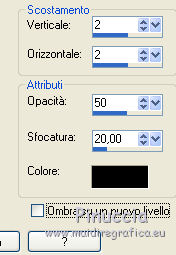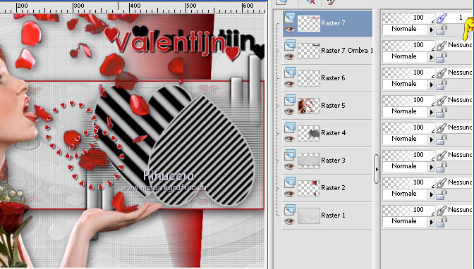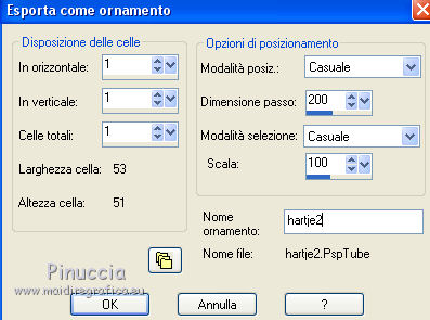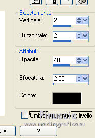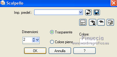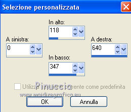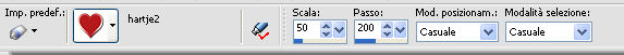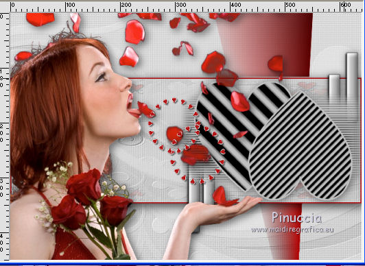 qui puoi trovare qualche risposta ai tuoi dubbi. Se l'argomento che ti interessa non è presente, ti prego di segnalarmelo. Questo tutorial è stato scritto con PSPX5 e tradotto con CorelX, ma può essere eseguito con ogni versione di PSP. Dalla versione X4, il comando Immagine>Rifletti è stato sostituito con Immagine>Capovolgi in orizzontale, e il comando Immagine>Capovolgi con Immagine>Capovolgi in verticale. Nelle versioni X5 e X6, le funzioni sono state migliorate rendendo disponibile il menu Oggetti. Con la nuova versione X7, sono tornati Rifletti/Capovolgi, ma con nuove differenze Vedi la scheda sull'argomento qui traduzione in francese qui Le vostre versioni qui Occorrente: Materiale qui Il tube della donna è di Gina. Filtri in caso di dubbi, ricorda di consultare la mia sezione filtri qui FM Tile Tools - Blend Emboss qui ![]() 1. Apri una nuova immagine trasparente 640 x 450 pixels. Selezione>Seleziona tutto. 2. Apri AG-1 e vai a Modifica>Copia. Torna al tuo lavoro e vai a Modifica>Incolla nella selezione. Selezione>Deseleziona. 3. Effetti>Plugins>FM Tile Tools - Blend Emboss, con i settaggi standard. ![]() 4. Apri il tube Deco 3 e vai a Modifica>Copia. Torna al tuo lavoro e vai a Modifica>Incolla come nuovo livello. Spostalo un po' più a destra,Vedi il mio esempio. 5. Attiva lo strumento Selezione ![]() (non importa il tipo di selezione impostato, perchè con la selezione personalizzata si ottiene sempre un rettangolo) clicca sull'icona Selezione personalizzata ![]() e imposta i seguenti settaggi. ![]() 6. Livelli>Nuovo livello raster. Imposta il colore di primo piano con un colore del tube: #b01013. Riempi il livello con il colore di primo piano #b01013.7. Selezione>Modifica>Contrai - 2 pixels. Premi sulla tastiera il tasto CANC ![]() 8. Apri AG-2 e vai a Modifica>Copia. Torna al tuo lavoro e vai a Modifica>Incolla nella selezione. 9. Di nuovo Effetti>Plugins>FM Tile Tools - Blend Emboss, con i settaggi standard. Selezione>Deseleziona. 10. Effetti>Effetti 3D>Sfalsa ombra, colore nero. ![]() 11. Apri il tube Dubbelhart e vai a Modifica>Copia. . Torna al tuo lavoro e vai a Modifica>Incolla come nuovo livello. 12. Immagine>Ridimensiona, al 90%, tutti i livelli non selezionato. Spostalo contro il bordo a destra.![]() 13. Effetti>Effetti 3D>Sfalsa ombra, colore nero. ![]() 14. Apri il tube Ginatube-Femme 885 e vai a Modifica>Copia. Torna al tuo lavoro e vai a Modifica>Incolla come nuovo livello. Immagine>Ridimensiona, al 90%, tutti i livelli non selezionato. Spostalo questo tube a sinistra, un po' fuori dal bordo.15. Effetti>Effetti 3D>Sfalsa ombra, colore nero. ![]() 16. Apri il tube Rondje e vai a Modifica>Copia. Torna al tuo lavoro e vai a Modifica>Incolla come nuovo livello. Spostalo dove preferisci, o vedi il mio esempio.![]() 17. Effetti>Effetti 3D>Sfalsa ombra, colore nero. ![]() 18. Apri Tekst e vai a Modifica>Copia. Torna al tuo lavoro e vai a Modifica>Incolla come nuovo livello. Spostalo in alto a destra.19. Effetti>Effetti 3D>Sfalsa ombra, colore nero, ombra su nuovo livello selezionato. ![]() Disattiva il collegamento del livello e sposta l'ombra un po' più in alto e a destra![]() Attiva il livello superiore. 20. Apri il tube hartjePlaatjespenseel. File>Esporta>Ornamento, assegna un nome al tube e ok. ![]() Attiva lo strumento Ornamento ![]() cerca e seleziona l'ornamento che hai appena esportato, con i seguenti settaggi: ![]() 21. Livelli>Nuovo livello raster. Applica l'ornamento a tuo piacimento e con dimensioni a tua scelta. Applicando l'ornamento su un proprio livello, potrai posizionarlo e cambiarne l'opacità.Su ciascun livello: Effetti>Effetti 3D>Sfalsa ombra, colore nero. ![]() 22. Attiva il livello inferiore. Modifica>Copia. 23. Immagine>Aggiungi bordatura, 1 pixel, simmetriche, colore rosso. Immagine>Aggiungi bordatura, 20 pixels, simmetriche, colore bianco. Attiva lo strumento Bacchetta magica , tolleranza e sfumatura 0,e clicca nel bordo da 20 pixels per selezionarlo. Modifica>Incolla nella selezione. Effetti>Effetti di bordo>Aumenta. 24. Selezione>Inverti. Effetti>Effetti 3D>Scalpello. ![]() 25. Immagine>Aggiungi bordatura, 1 pixel, simmetriche, colore rosso. Selezione>Deseleziona. 26. Firma il tuo lavoro su un nuovo livello. Salva in formato jpg. ![]() Se hai problemi o dubbi, o trovi un link non funzionante, o anche soltanto per un saluto, scrivimi. 8 Agosto 2016 |