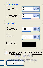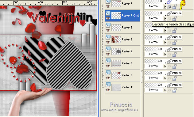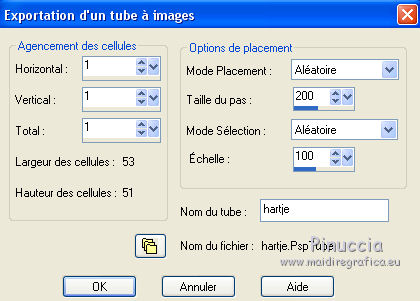 Ce tutoriel a été créé avec CorelX5, mais il peut également être exécuté avec les autres versions. Pour traduire le tutoriel j'ai utilisé CorelX pour l'italien et CorelX17 pour le français. Suivant la version utilisée, vous pouvez obtenir des résultats différents. Depuis la version X4, la fonction Image>Miroir a été remplacée par Image>Renverser horizontalement, et Image>Renverser avec Image>Renverser verticalement. Dans les versions X5 et X6, les fonctions ont été améliorées par la mise à disposition du menu Objets. Dans la nouvelle version X7, nous avons à nouveau Miroir/Renverser, mais avec autres différences. Voir plus les détails à ce sujet ici Certaines dénominations ont changées entre les versions de PSP. Les plus frequentes dénominations utilisées: ![]() Traduction en italien ici Vos versions ici Nécessaire pour réaliser ce tutoriel: Matériel qui Le tube est de Gina. Modules Externes. consulter, si nécessaire, ma section de filtre ici FM Tile Tools - Blend Emboss ici ![]() 1. Ouvrir une nouvelle image transparente 640 x 450 pixels. Sélections>Sélectionner tout. 2. Ouvrir AG-1 - Édition>Copier. Revenir sur votre travail et Édition>Coller dans la sélection. Sélections>Désélectionner tout. 3. Effets>Modules Externes>FM Tile Tools - Blend Emboss, par défaut. ![]() 4. Ouvrir le tube Deco 3 - Édition>Copier. Revenir sur votre travail et Édition>Coller comme nouveau calque. Déplacer le tube un peu plus à droite,voir mon exemple. 5. Activer l'outil Sélection ![]() (peu importe le type de sélection, parce que avec la sélection personnalisée vous obtenez toujours un rectangle), cliquer sur Sélection personnalisée ![]() et setter ces paramètres. ![]() 6. Calques>Nouveau calque raster. Placer en avant plan une couleur du tube: #b01013. Remplir le calque avec la couleur d'avant plan #b01013.7. Sélections>Modifier>Contracter - 2 pixels. Presser CANC sur le clavier ![]() 8. Apri AG-2 - Édition>Copier. Revenir sur votre travail et Édition>Coller dans la sélection. 9. À nouveau Effets>Modules Externes>FM Tile Tools - Blend Emboss, par défaut. Sélections>Désélectionner tout. 10. Effets>Effets 3D>Ombre portée, couleur noire. ![]() 11. Ouvrir le tube Dubbelhart - Édition>Copier. . Revenir sur votre travail et Édition>Coller comme nouveau calque. 12. Image>Redimensionner, à 90%, redimensionner tous les calques décoché. Déplacer contre le bord à droite.![]() 13. Effets>Effets 3D>Ombre portée, couleur noire. ![]() 14. Ouvrir le tube Ginatube-Femme 885 - Édition>Copier. Revenir sur votre travail et Édition>Coller comme nouveau calque. Image>Redimensionner, à 90%, redimensionner tous les calques décoché. Déplacer ce tube à gauche, un peu au dehors de l'image.15. Effets>Effets 3D>Ombre portée, couleur noire. ![]() 16. Ouvrir le tube Rondje - Édition>Copier. Revenir sur votre travail et Édition>Coller comme nouveau calque. Déplacer à votre convenance, ou voir mon exemple.![]() 17. Effets>Effets 3D>Ombre portée, couleur noire. ![]() 18. Ouvrir Tekst - Édition>Copier. Revenir sur votre travail et Édition>Coller comme nouveau calque. Déplacer le texte en haut à droite.19. Effets>Effets 3D>Ombre portée, couleur noire, ombre sur le nouveau calque coché. ![]() Basculer la liaison du calque et déplacer l'ombre un peu plus en haut et à droite.![]() Vous positionner sur le calque du haut de la pile. 20. Ouvrir le tube hartjePlaatjespenseel. Fichier>Exporter>Tubes à image, donner un nom au tube et ok. ![]() Activer l'outil Tube à images ![]() chercher et sélectionner le tube que vous avez exporté: ![]() 21. Calques>Nouveau calque raster. Appliquer le tube à votre convenance et avec différentes tailles. Si vour appliquer le tube sur son propre calque, vous pourrez le positionner et changer l'opacité.Sur chaque calque: Effets>Effets 3D>Ombre portée, couleur noire. ![]() 22. Vous positionner sur le calque du bas de la pile. Édition>Copier. 23. Image>Ajouter des bordures, 1 pixel, symétrique, couleur rouge. Image>Ajouter des bordures, 20 pixels, symétrique, couleur blanche. Activer l'outil Baguette magique , tolérance et progressivité 0,et cliquer dans le bord de 20 pixels pour le sélectionner. Édition>Coller dans la sélection. Effets>Effets de bords>Accentuer. 24. Sélections>Inverser. Effets>Effets 3D>Ciselage. ![]() 25. Image>Ajouter des bordures, 1 pixel, symétrique, couleur rouge. Sélections>Désélectionner tout. 26. Signer votre travail sur un nouveau calque. Enregistrer en jpg. ![]() Si vous avez des problèmes, ou des doutes, ou vous trouvez un link modifié, ou seulement pour me dire que ce tutoriel vous a plu, vous pouvez m'écrire. 28 Août 2016 |