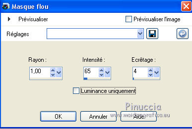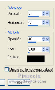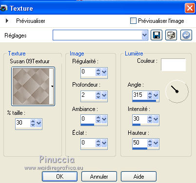 Ce tutoriel a été créé avec CorelX15 et traduit avec CorelX12, mais peut également être exécuté avec les autres versions. Pour traduire le tutoriel j'ai utilisé CorelX pour l'italien et CorelX17 pour le français. Suivant la version utilisée, vous pouvez obtenir des résultats différents. Depuis la version X4, la fonction Image>Miroir a été remplacée par Image>Renverser horizontalment, et Image>Renverser avec Image>Renverser verticalemente. Dans les versions X5 et X6, les fonctions ont été améliorées par la mise à disposition du menu Objets. Dans la nouvelle version X7, nous avons à nouveau Miroir/Renverser, mais avec autres différences. Voir plus les détails à ce sujet ici Certaines dénominations ont changées entre les versions de PSP. Les plus frequentes dénominations utilisées: ![]() Traduction en italien ici Vos versions ici Nécessaire pour réaliser ce tutoriel: Matériel qui ![]() Placer la texture Susan 09 dans le dossier Textures. 1. Ouvrir une nouvelle image noire 650 x 650 pixels. ![]() 2. Ouvrir RondMB - Édition>Copier. Revenir sur votre travail et Édition>Coller comme nouveau calque. 3. Ouvrir Ribbon - Édition>Copier. REvenir sur votre travail et Édition>Coller comme nouveau calque. 4. Ouvrir Strik - Édition>Copier. Revenir sur votre travail et Édition>Coller comme nouveau calque. Déplacer le ruban en haut.Voir mon exemple. 5. Réglage>Netteté>Masque flou. ![]() 6. Effets>Effets de textures>Texture - sélectionner la texture Susan 09. ![]() 7. Effets>Effets 3D>Ombre portée, couleur noire. ![]() 8. Ouvrir le tube Bloem - Édition>Copier. Revenir sur votre travail et Édition>Coller comme nouveau calque. Déplacer en haut, sur le ruban.![]() 9. Effets>Effets 3D>Ombre portée, comme précédemment. ![]() 10. Réglage>Netteté>Masque flou, comme précédemment. ![]() 11. Ouvrir le tube Kirsty-Multi-Hair - Édition>Copier. Revenir sur votre travail et Édition>Coller comme nouveau calque. Positionner bien le tube.12. Effets>Effets 3D>Ombre portée, couleur noire. ![]() 13. Ouvrir Siertak - Édition>Copier. Revenir sur votre travail et Édition>Coller comme nouveau calque. Image>Redimensionner, à 95%, redimensionner tous les calques décoché. Positionner bien le tube.14. Image>Ajouter des bordures, 1 pixel, symétrique, avec une couleur foncée de votre image. Image>Ajouter des bordures, 1 pixel, symétrique, avec une couleur claire de votre image. 15. Signer votre travail sur un nouveau calque. 16. Calques>Fusionner>Tous et enregistrer en jpg. ![]() Si vous avez des problèmes, ou des doutes, ou vous trouvez un link modifié, ou seulement pour me dire que ce tutoriel vous a plu, vous pouvez m'écrire. 2 Juillet 2016 |