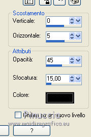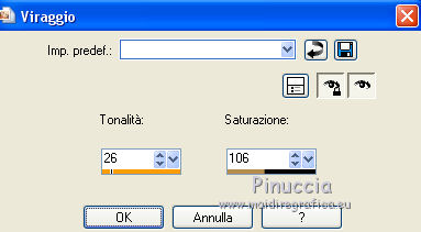 qui puoi trovare qualche risposta ai tuoi dubbi. Se l'argomento che ti interessa non è presente, ti prego di segnalarmelo. Per tradurre il tutorial ho usato Corel X, ma può essere eseguito con ogni versione di PSP. Dalla versione X4, il comando Immagine>Rifletti è stato sostituito con Immagine>Capovolgi in orizzontale, e il comando Immagine>Capovolgi con Immagine>Capovolgi in verticale. Nelle versioni X5 e X6, le funzioni sono state migliorate rendendo disponibile il menu Oggetti. Con la nuova versione X7, sono tornati Rifletti/Capovolgi, ma con nuove differenze Vedi la scheda sull'argomento qui traduction en français qui Le vostre versioni qui Occorrente: Materiale qui Il tube della donna è di Jet. ![]() Metti il pennello nella cartella Pennelli. Attenzione, il pennello è composto da due files che non devono essere separati. Vedi gli appunti sui pennelli qui 1. Apri una nuova immagine bianca 600 x 600 pixels. ![]() 2. Imposta il colore di primo piano con un colore del tuo tube. Per l'esempio #ca547e. 3. Livelli>Nuovo livello raster. Attiva lo strumento Pennello ![]() cerca e seleziona il pennello Spots, dimensioni 500, e applicalo più volte cliccando con il tasto sinistro del mouse per usare il colore di primo piano. Abbassa l'opacità di questo livello al 50%. 4. Apri il tube Lijst16 e vai a Modifica>Copia. Torna al tuo lavoro e vai a Modifica>Incolla come nuovo livello. 5. Immagine>Ridimensiona, 2 volte al 120%, tutti i livelli non selezionato. Regola>Messa a fuoco>Metti a fuoco. 6. Regola>Tonalità e saturazione>Viraggio. ![]() 7. Attiva lo strumento Bacchetta magica , sfumatura e tolleranza 0,e clicca nella cornice per selezionarla. 8. Selezione>Modifica>Espandi - 15 pixels. 9. Livelli>Nuovo livello raster. Imposta il colore di primo piano con #ecbece, e riempi il livello con questo colore.10. Livelli>Disponi>Sposta giù. Selezione>Deseleziona. 11. Apri il tube jet-woman21-mei-2008. Attiva lo strumento Selezione , rettangolo,e traccia una selezione della testa. 12. Modifica>Copia, e minimizza il tube. Torna al tuo lavoro e vai a Modifica>Incolla come nuovo livello. Selezione>Deseleziona. 13. Immagine>Ridimensiona, al 90%, tutti i livelli non selezionato. Sposta il tube un po' più a destra.![]() Abbassa l'opacità di questo livello al 50%. 14. Attiva il livello superiore (la cornice). Livelli>Unisci>Unisci giù - 2 volte. 15. Effetti>Effetti 3D>Sfalsa ombra, colore nero. ![]() 16. Sposta la cornice un po' più in alto e a destra.17. Apri il tube fresh-flower e vai a Modifica>Copia. Torna al tuo lavoro e vai a Modifica>Incolla come nuovo livello. Sposta il tube nell'angolo in basso a destra.Vedi il mio esempio. 18. Effetti>Effetti 3D>Sfalsa ombra, con i settaggi precedenti. ![]() 19. Attiva nuovamente il tube jet-woman21. Selezione>Deseleziona. Immagine>Rifletti. Modifica>Copia. Torna al tuo lavoro e vai a Modifica>Incolla come nuovo livello. 20. Immagine>Ridimensiona, al 95%, tutti i livelli non selezionato. Sposta il tube a sinistra, vedi il mio esempio.21. Effetti>Effetti 3D>Sfalsa ombra, con i settaggi precedenti. 22. Apri il tube SS-Siobhan - Beaded Hanger evai a Modifica>Copia. Torna al tuo lavoro e vai a Modifica>Incolla come nuovo livello. 23. Immagine>Ridimensiona, 4 volte al 90%, tutti i livelli non selezionato. Regola>Messa a fuoco>Metti a fuoco. Sposta il tube in alto a destra, nella cornice.24. Effetti>Effetti 3D>Sfalsa ombra, colore nero. ![]() Regola>Messa a fuoco>Metti a fuoco. 25. Attiva lo strumento Gomma ![]() e cancella la parte superiore del tube. ![]() 26. Controlla che tutto sia correttamente posizionato. 27. Immagine>Aggiungi bordatura, 1 pixel, simmetriche, con un colore scuro dell'immagine. Immagine>Aggiungi bordatura, 15 pixels, simmetriche, colore bianco. 28. Firma il tuo lavoro su un nuovo livello. Livelli>Unisci>Unisci tutto e salva in formato jpg. ![]() Se hai problemi o dubbi, o trovi un link non funzionante, o anche soltanto per un saluto, scrivimi. 2 Luglio 2016 |