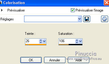 Ce tutoriel a été créé avec CorelX15 et traduit avec CorelX12, mais il peut également être exécuté avec les autres versions. Pour traduire le tutoriel j'ai utilisé CorelX pour l'italien et CorelX17 pour le français. Suivant la version utilisée, vous pouvez obtenir des résultats différents. Depuis la version X4, la fonction Image>Miroir a été remplacée par Image>Renverser horizontalement, et Image>Renverser avec Image>Renverser verticalement . Dans les versions X5 et X6, les fonctions ont été améliorées par la mise à disposition du menu Objets. Dans la nouvelle version X7, nous avons à nouveau Miroir/Renverser, mais avec autres différences. Voir plus les détails à ce sujet ici Certaines dénominations ont changées entre les versions de PSP. Les plus frequentes dénominations utilisées: ![]() Traduction en italien ici Vos versions ici Nécessaire pour réaliser ce tutoriel: Matériel qui Le tube de la femme est de Jet ![]() Placer le pinceau dans le dossier Pinceaux. Attention, le pinceau se compose de deux files qui on ne doit séparer. Consulter, si vous voulez, les notes sur les pinceaux ici 1. Ouvrir une nouvelle image blanche 600 x 600 pixels. ![]() 2. Placer en avant plan une couleur de votre tube; pour moi #ca547e. 3. Calques>Nouveau calque raster. Activer l'outil Pinceau ![]() chercher et sélectionner le pinceau Spots, taille 500, et appliquer le pinceau plusieurès fois, en cliquant avec la touche gauche de la souris, pour utiliser la couleur d'avant plan. Réduire l'opacité de ce calque à 50%. 4. Ouvrir le tube Lijst16 - Édition>Copier. Revenir sur votre travail et Édition>Coller comme nouveau calque. 5. Image>Redimensionner, 2 fois à 120%, redimensionner tous les calques décoché. Réglage>Netteté>Netteté. 6. Réglage>Teinte et Saturation>Coloriser. ![]() 7. Activer l'outil Baguette magique , tolérance et progressivité 0,et cliquer dans le cadre pour le sélectionner. 8. Sélections>Modifier>Agrandir - 15 pixels. 9. Calques>Nouveau calque raster. Placer en avant plan la couleur #ecbece, et remplir le calque avec cette couleur.10. Calques>Agencer>Déplacer vers le bas. Sélections>Désélectionner tout. 11. Ouvrir le tube jet-woman21-mei-2008. Activer l'outil Sélection , rectangle,et tracer une sélection autour de la tête. 12. Édition>Copier, et minimiser le tube. Revenir sur votre travail et Édition>Coller comme nouveau calque. 13. Image>Redimensionner, à 90%, redimensionner tous les calques décoché. Déplacer le tube un peu plus à droite.![]() Réduire l'opacité de ce calque à 50%. 14. Vous positionner sur le calque du haut de la pile (le cadre). Calques>Fusionner>Fusionner le calque de dessous - 2 fois. 15. Effets>Effets 3D>Ombre portée, couleur noire. ![]() 16. Déplacer le cadre un peu plus en haut à droite.17. Ouvrir le tube fresh-flower - Édition>Copier. Revenir sur votre travail et Édition>Coller comme nouveau calque. Déplacer le tube dans le coin en bas à droite.Voir mon exemple. 18. Effets>Effets 3D>Ombre portée, comme précédemment. ![]() 19. Activer à nouveau le tube jet-woman21. Sélections>Désélectionner tout. Image>Miroir. Édition>Copier. Revenir sur votre travail et Édition>Coller comme nouveau calque. 20. Image>Redimensionner, à 95%, redimensionner tous les calques décoché. Déplacer le tube à gauche, voir mon exemple.21. Effets>Effets 3D>Ombre portée, comme précédemment. 22. Ouvrir le tube SS-Siobhan - Beaded Hanger - Édition>Copier. Revenir sur votre travail et Édition>Coller comme nouveau calque. 23. Image>Redimensionner, 4 fois à 90%, redimensionner tous les calques décoché. Réglage>Netteté>Netteté. Déplacer le tube en haut à droite.24. Activer l'outil Gomme ![]() et effacer la partie supérieure du tube. ![]() 25. Effets>Effets 3D>Ombre portée, couleur noire. ![]() Réglage>Netteté>Netteté. 26. Contrôler que tout soit bien positionné. 27. Image>Ajouter des bordures, 1 pixel, symétrique, avec une couleur foncée de votre image. Image>Ajouter des bordures, 15 pixels, symétrique, couleur blanche. 28. Signer votre travail sur un nouveau calque. Calques>Fusionner>Tous et enregistrer en jpg. ![]() Si vous avez des problèmes, ou des doutes, ou vous trouvez un link modifié, ou seulement pour me dire que ce tutoriel vous a plu, vous pouvez m'écrire. 2 Juillet 2016 |