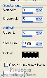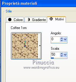 qui puoi trovare qualche risposta ai tuoi dubbi. Se l'argomento che ti interessa non è presente, ti prego di segnalarmelo. Questo tutorial è stato creato con CorelX15 e tradotto con Corel X, ma può essere eseguito con ogni versione di PSP. Dalla versione X4, il comando Immagine>Rifletti è stato sostituito con Immagine>Capovolgi in orizzontale, e il comando Immagine>Capovolgi con Immagine>Capovolgi in verticale. Nelle versioni X5 e X6, le funzioni sono state migliorate rendendo disponibile il menu Oggetti. Con la nuova versione X7, sono tornati Rifletti/Capovolgi, ma con nuove differenze Vedi la scheda sull'argomento qui traduzione in francese qui Occorrente: Materiale qui Il materiale fa parte dello scrap Coffee Scrap small. ![]() se stai usando altri colori, sperimenta le modalità di miscelatura e opacità più adatte ai tuoi colori 1. Apri una nuova immagine trasparente 600 x 600 pixels. 2. Selezione>Seleziona tutto. Apri achtergrond1psp e vai a Modifica>Copia. Torna al tuo lavoro e vai a Modifica>Incolla come nuovo livello. Selezione>Deseleziona. 3. Apri il tube mimi-brush.psp e vai a Modifica>Copia. Torna al tuo lavoro e vai a Modifica>Incolla come nuovo livello. Spostalo nell'angolo in alto a sinistra.![]() 4. Apri il tube Coffee1roundframeSM.psp e vai a Modifica>Copia. Torna al tuo lavoro e vai a Modifica>Incolla come nuovo livello. 5. Attiva lo strumento Bacchetta magica , tolleranza e sfumatura 0,e clicca al centro della cornice per selezionarla. 6. Selezione>Modifica>Espandi - 2 pixels. 7. Livelli>Nuovo livello raster. 8. Apri Coffee 1sm.psp e minimizzalo. Passa il colore di primo piano a Motivi e cerca l'immagine, sotto la categoria Immagini aperte, seleziona l'immagine con i seguenti settaggi. ![]() Riempi il livello con il motivo.9. Abbassa l'opacità di questo livello al 75%. Selezione>Deseleziona. Livelli>Disponi>Sposta giù. 10. Attiva il livello superiore. Effetti>Effetti 3D>Sfalsa ombra, colore nero. ![]() 11. Apri il tube Coffee2 frame, e vai a Modifica>Copia. Torna al tuo lavoro e vai a Modifica>Incolla come nuovo livello. Sposta la cornice un po' più in basso, vedi il mio esempio.12. Attiva lo strumento Bacchetta magica , sfumatura e tolleranza 0,modalità Aggiungi ![]() clicca nelle tre cornici per selezionarle. ![]() 13. Selezione>Modifica>Espandi - 4 pixels. 14. Livelli>Nuovo livello raster. Riempi il livello con il motivo.15. Abbassa l'opacità di questo livello al 75%. Livelli>Disponi>Sposta giù. Selezione>Deseleziona. 16. Effetti>Effetti 3D>Sfalsa ombra, con i settaggi precedenti. ![]() 17. Attiva il livello delle cornici. Seleziona la cornice a destra con la bacchetta magica ![]() Selezione>Modifica>Espandi - 2 pixels. 18. Apri il tube S205-MAI2008-creativeloves-1.psp e vai a Modifica>Copia. Torna al tuo lavoro e vai a Modifica>Incolla come nuovo livello. Posiziona il tube sulla selezione,lasciando visibile la parte che preferisci Selezione>Inverti. Premi sulla tastiera il tasto CANC ![]() Selezione>Deseleziona. 19. Attiva nuovamente il livello delle cornici. Clicca nella cornice centrale con la bacchetta magica ![]() Selezione>Modifica>Espandi - 2 pixels. Modifica>Incolla come nuovo livello (il tube è ancora in memoria). Posiziona il tube sulla selezione.Selezione>Inverti. Premi sulla tastiera il tasto CANC. Selezione>Deseleziona. 20. Attiva nuovamente il livello delle cornici, e seleziona la cornice a sinistra con la bacchetta magica ![]() Selezione>Modifica>Espandi - 2 pixels. 21. Attiva il tube della donna. Immagine>Rifletti. Modifica>Copia. 22. Torna al tuo lavoro e vai a Modifica>Incolla come nuovo livello. Posiziona il tube sull'area selezionata.Selezione>Inverti. Premi sulla tastiera il tasto CANC. Selezione>Deseleziona. 23. Chiudi i 4 livelli inferiori e rimani posizionato su un livello visibile. ![]() Livelli>Unisci>Unisci visibile. 24. Riapri i livelli e rimani posizionato sul livello superiore. Se necessario, posiziona correttamente le cornici.![]() 25. Effetti>Effetti 3D>Sfalsa ombra, con i settaggi precedenti. ![]() 26. Attiva il livello dei fiori - Raster 2. ![]() Livelli>Disponi>Sposta su. Controlla che tutto sia ben posizionato. Chiudi il livello superiore delle cornici. ![]() Livelli>Unisci>Unisci visibile. Riapri il livello chiuso e rimani posizionato sul livello inferiore. 27. Attiva nuovamente il tube S205-MAI2008-creativeloves.psp. Modifica>Annulla azione Rifletti. Modifica>Copia. Torna al tuo lavoro e vai a Modifica>Incolla come nuovo livello. 28. Con lo strumento Gomma ![]() cancella la parte del tube che non deve vedersi sotto le cornici. Se preferisci, seleziona la parte con lo strumento Selezione ![]() e premi sulla tastiera il tasto CANC. Selezione>Deseleziona. 29. Effetti>Effetti 3D>Sfalsa ombra, con i settaggi precedenti. 30. Immagine>Aggiungi bordatura, 1 pixel, simmetriche, con un colore scuro del tube. Immagine>Aggiungi bordatura, 20 pxiels, simmetriche, colore bianco. 31. Attiva lo strumento Bacchetta magica , tolleranza e sfumatura 0,e clicca nel bordo bianco per selezionarlo. Riempi il livello con il motivo di primo piano.32. Immagine>Aggiungi bordatura, 1 pixel, simmetriche, con il colore scuro scelto dal tube. Selezione>Deseleziona. 33. Firma il tuo lavoro su un nuovo livello. Salva in formato jpg. Il tube di questo esempio è di Isa ![]() ![]() Se hai problemi o dubbi, o trovi un link non funzionante, o anche soltanto per un saluto, scrivimi. 15 Giugno 2016 Le mie traduzioni sono regolarmente registrate |