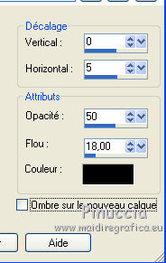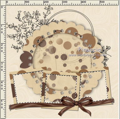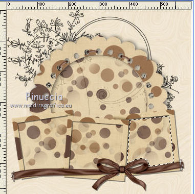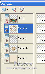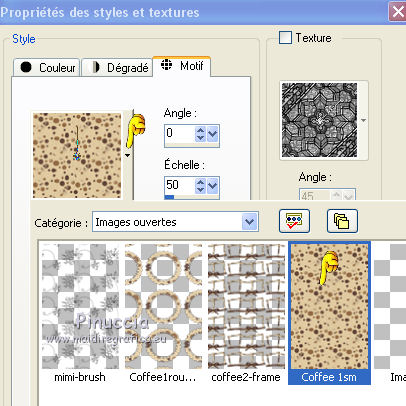 Ce tutoriel a été créé avec CorelX15 et traduit avec CorelX12, mais peut également être exécuté avec les autres versions. Pour traduire le tutoriel j'ai utilisé CorelX pour l'italien et CorelX17 pour le français. Suivant la version utilisée, vous pouvez obtenir des résultats différents. Depuis la version X4, la fonction Image>Miroir a été remplacée par Image>Renverser horizontalment, et Image>Renverser avec Image>Renverser verticalemente. Dans les versions X5 et X6, les fonctions ont été améliorées par la mise à disposition du menu Objets. Dans la nouvelle version X7, nous avons à nouveau Miroir/Renverser, mais avec autres différences. Voir plus les détails à ce sujet ici Certaines dénominations ont changées entre les versions de PSP. Les plus frequentes dénominations utilisées: ![]() Traduction en italien ici Vos versions ici Nécessaire pour réaliser ce tutoriel: Matériel qui Le matériel vient du scrap Coffee Scrap small. ![]() Si vous voulez utiliser vos propres couleurs, n'hésitez pas à changer le mode et l'opacité des calques 1. Ouvrir une nouvelle image transparente 600 x 600 pixels. 2. Sélections>Sélectionner tout. Ouvrir achtergrond1psp - Édition>Copier. Revenir sur votre travail et Édition>Coller comme nouveau calque. Sélections>Désélectionner tout. 3. Ouvrir le tube mimi-brush.psp - Édition>Copier. Revenir sur votre travail et Édition>Coller comme nouveau calque. Déplacer le tube dans le coin en haut à gauche.![]() 4. Ouvrir le tube Coffee1roundframeSM.psp - Édition>Copier. Revenir sur votre travail et Édition>Coller comme nouveau calque. 5. Activer l'outil Baguette magique , tolérance et progressivité 0,et cliquer dans le cadre pour le sélectionner. 6. Sélections>Modifier>Agrandir - 2 pixels. 7. Calques>Nouveau calque raster. 8. Ouvrir Coffee 1sm.psp et le minimiser. Place en avant plan Motif et chercher l'image, sous la catégorie Images ouvertes, sélectionner l'image avec ces réglages. ![]() Remplir le calque avec ce motif.9. Réduire l'opacité de ce calque à 75%. Sélections>Désélectionner tout. Calques>Agencer>Déplacer vers le bas. 10. Vous positionner sur le calque du haut de la pile. Effets>Effets 3D>Ombre portée, couleur noire. ![]() 11. Ouvrir il tube Coffee2 frame, - Édition>Copier. Revenir sur votre travail et Édition>Coller comme nouveau calque. Déplacer le cadre un peu plus en bas, voir mon exemple.12. Activer l'outil Baguette magique , tolérance et progressivité 0,mode Ajouter ![]() cliquer dans le trois cadres pour les sélectionner. ![]() 13. Sélections>Modifier>Agrandir - 4 pixels. 14. Calques>Nouveau calque raster. Remplir le calque avec le motif d'avant plan.15. Réduire l'opacité de ce calque à 75%. Calques>Agencer>Déplacer vers le bas. Sélections>Désélectionner tout. 16. Effets>Effets 3D>Ombre portée, comme précédemment. ![]() 17. Vous positionner sur le calque des trois cadres. Sélectionner le cadre à droite avec la baguette magique ![]() ![]() Sélections>Modifier>Agrandir - 2 pixels. 18. Ouvrir le tube S205-MAI2008-creativeloves-1.psp - Édition>Copier. Revenir sur votre travail et Édition>Coller comme nouveau calque. Positionner sur la sélection la partie du tube que vous voulez.Sélections>Inverser. Presser CANC sur le clavier ![]() Sélections>Désélectionner tout. 19. Vous positionner à nouveau sur le calque des cadres. Cliquer dans le cadre central avec la baguette magique pour la sélectionner.Sélections>Modifier>Agrandir - 2 pixels. Édition>Coller comme nouveau calque (le tube est toujours en mémoire). Positionner le tube sur la sélection.Sélections>Inverser. Presser CANC Sur le clavier. Sélections>Désélectionner tout. 20. Encore une fois vous positionner sur le calque des cadres et sélectionner le cadre à gauche avec la baguette magique ![]() Sélections>Modifier>Agrandir - 2 pixels. 21. Activer le tube de la femme. Image>Miroir. Édition>Copier. 22. Revenir sur votre travail et Édition>Coller comme nouveau calque. Positionner le tube sur la sélection.Sélections>Inverser. Presser CANC sur le clavier. Sélections>Désélectionner tout. 23. Fermer les 4 calques du bas de la pile et rester positionné su un des calques visibles. ![]() Calques>Fusionner>Calques visibles. 24. Re-ouvrir les calques et rester positionné sur le calque des cadres. Si nécessaire, positionner mieux les cadres.![]() 25. Effets>Effets 3D>Ombre portée, comme précédemment. ![]() 26. Vous positionner sur le calque du déco - Raster 2. ![]() Calques>Agencer>Déplacer vers le haut. Controler que tout soit bien positionné. Fermer le calque du haut de la pile des cadres. ![]() Calques>Fusionner>Calques visibles. Re-ouvrir le calque fermé et rester positionné sur le calque du bas de la pile. 27. Activer à nouveau le tube S205-MAI2008-creativeloves.psp. Édition>Annuler Miroir. Édition>Copier. Revenir sur votre travail et Édition>Coller comme nouveau calque. Positionner bien le tube.28. Avec l'outil Gomme ![]() et effacer la partie du tube qui ne doit être visible. ou, si vous préférez sélectionner la partie avec l'outil Sélection ![]() et presser CANC sur le clavier. Sélections>Désélectionner tout. 29. Effets>Effets 3D>Ombre portée, comme précédemment. 30. Image>Ajouter des bordures, 1 pixel, symétrique, avec une couleur foncée du tube. Image>Ajouter des bordures, 20 pixels, symétrique, couleur blanche. 31. Activer l'outil Baguette magique , tolérance et progressivité 0,et cliquer dans le bord blanc pour le sélectionner. Remplir le calque avec le motif de premier plan.32. Image>Ajouter des bordures, 1 pixel, symétrique, avec la couleur foncée choisie du tube. Sélections>Désélectionner tout. 33. Signer votre travail sur un nouveau calque. Enregistrer en jpg. Le tube di cette version est de Isa ![]() ![]() Si vous avez des problèmes, ou des doutes, ou vous trouvez un link modifié, ou seulement pour me dire que ce tutoriel vous a plu, vous pouvez m'écrire. 16