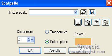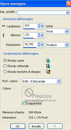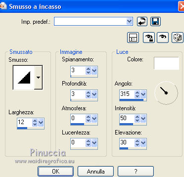 qui puoi trovare qualche risposta ai tuoi dubbi. Se l'argomento che ti interessa non è presente, ti prego di segnalarmelo. Questo tutorial è stato creato con Corel X15 e tradotto con Corel X, ma può essere eseguito con ogni versione di PSP. Dalla versione X4, il comando Immagine>Rifletti è stato sostituito con Immagine>Capovolgi in orizzontale, e il comando Immagine>Capovolgi con Immagine>Capovolgi in verticale. Nelle versioni X5 e X6, le funzioni sono state migliorate rendendo disponibile il menu Oggetti. Con la nuova versione X7, sono tornati Rifletti/Capovolgi, ma con nuove differenze Vedi la scheda sull'argomento qui traduzione in francese qui Occorrente: Materiale qui Il tube della donna è di Jet. Filtri in caso di dubbi, ricorda di consultare la mia sezione filtri qui Filters Unlimited 2.0 qui Graphics Plus - Cross Shadow qui Bordermania qui I filtri Graphics Plus si possono usare da soli o importati in Filters Unlimited (come fare vedi qui) Se un filtro fornito appare con questa icona ![]() se stai usando altri colori, sperimenta le modalità di miscelatura e opacità più adatte ai tuoi colori 1. Ouvrir une nouvelle image transparente 315 x 170 pixels. ![]() 2. Selezione>Seleziona tutto. Apri il tube Achtergrond1-jpg e vai a Modifica>Copia. Torna al tuo lavoro e vai a Modifica>Incolla nella selezione. 3. Selezione>Modifica>Contrai - 10 pixels. Premi sulla tastiera il tasto CANC ![]() 4. Selezione>Inverti. Effetti>Effetti 3D>Smusso a incasso. ![]() 5. Selezione>Inverti. Modifica>Incolla nella selezione (l'immagine è ancora in memoria). 6. Livelli>Nuovo livello raster. Imposta il colore di primo piano con il colore bianco, e riempi il livello con il colore bianco.Abbassa l'opacità di questo livello al 35%. Selezione>Deseleziona. 7. Livelli>Unisci>Unisci tutto. Metti da parte l'immagine, per il momento. 8. Apri una nuova immagine trasparente 650 x 450 pixels. 9. Selezione>Seleziona tutto. Apri Achtergrond2 e vai a Modifica>Copia. Torna al tuo lavoro e vai a Modifica>Incolla nella selezione. Selezione>Deseleziona. . 10. Attiva il primo lavoro che hai minimizzato al punto 7 e vai a Modifica>Copia. Torna al tuo lavoro e vai a Modifica>Incolla come nuovo livello. 11. Sposta l'immagine un po' più in alto e a destra (vedi il mio esempio).12. Livelli>Duplica. Immagine>Rifletti. Spostalo sotto il primo quadro.![]() 13. Apri il tube Zilveren-tak e vai a Modifica>Copia. Torna al tuo lavoro e vai a Modifica>Incolla come nuovo livello. Spostalo a destra, vedi il mio esempio.Cambia la modalità di miscelatura di questo livello in Luminanza (esistente). 14. Apri il tube Jet-woman25-maart-2008-psp e vai a Modifica>Copia. Torna al tuo lavoro e vai a Modifica>Incolla come nuovo livello. Immagine>Rifletti. Immagine>Ridimensiona, 3 volte al 90%, tutti i livelli non selezionato. Sposta il tube a sinistra.15. Immagine>Aggiungi bordatura, 2 pixels, simmetriche, colore nero. Immagine>Aggiungi bordatura, 30 pixels, simmetriche, colore bianco. Immagine>Aggiungi bordatura, 2 pixels, simmetriche, colore nero. 16. Attiva lo strumento Bacchetta magica , sfumatura e tolleranza 0,e clicca nel bordo bianco per selezionarlo. 17. Livelli>Nuovo livello raster. Apri il tube "Nummer 3" e vai a Modifica>Copia. Torna al tuo lavoro e vai a Modifica>Incolla nella selezione. 18. Effetti>Effetti 3D>Scalpello, colore #f1b561. ![]() 19. Effetti>Plugins>Bordermania - Frame#2. ![]() 20. Effetti>Plugins>Graphics Plus - Cross Shadow. ![]() Selezione>Deseleziona. . 21. Firma il tuo lavoro su un nuovo livello. Livelli>Unisci>Unisci tutto e salva in formato jpg. Il tube di questo esempio è di Yoka. ![]() ![]() Se hai problemi o dubbi, o trovi un link non funzionante, o anche soltanto per un saluto, scrivimi. 28 Maggio 2016 |