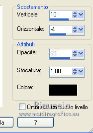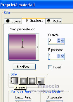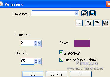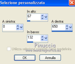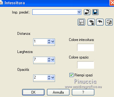 qui puoi trovare qualche risposta ai tuoi dubbi. Se l'argomento che ti interessa non è presente, ti prego di segnalarmelo. Per tradurre il tutorial ho usato Corel X, ma può essere eseguito con ogni versione di PSP. Dalla versione X4, il comando Immagine>Rifletti è stato sostituito con Immagine>Capovolgi in orizzontale, e il comando Immagine>Capovolgi con Immagine>Capovolgi in verticale. Nelle versioni X5 e X6, le funzioni sono state migliorate rendendo disponibile il menu Oggetti. Con la nuova versione X7, sono tornati Rifletti/Capovolgi, ma con nuove differenze Vedi la scheda sull'argomento qui traduzione in francese qui Le vostre versioni qui Occorrente: Materiale qui Il tube della donna è di Hanne. Filtri in caso di dubbi, ricorda di consultare la mia sezione filtri qui Alien Skin Eye Candy 5 Impact - Perspective Shadow qui ![]() se stai usando altri colori, sperimenta le modalità di miscelatura e opacità più adatte ai tuoi colori Nelle ultime versioni di PSP non c'è il gradiente di primo piano/sfondo (Corel_06_029) Trovi i gradienti delle versioni precedenti qui Metti le maschere nella cartella Maschere. 1. Apri una nuova immagine trasparente 650 x 450 pixels. Imposta il colore di primo piano con #79297c, e il colore di sfondo con #e3d2cb. ![]() Passa il colore di primo piano a Gradiente di primo piano/sfondo, stile Lineare. ![]() Riempi l'immagine trasparente con il gradiente.2. Effetti>Effetti di trama>Intessitura, entrambi i colori: bianco. ![]() 3. Riporta il colore di primo piano a Colore. Livelli>Nuovo livello raster. Riempi con il colore scuro di primo piano #79297c.4. Livelli>Carica/Salva maschera>Carica maschera da disco. Cerca e carica la maschera MaskCameron F21. ![]() Livelli>Unisci>Unisci gruppo. 5. Effetti>Effetti di trama>Veneziana, colore nero. ![]() 6. Effetti>Plugins>Alien Skin Eye Candy 5 Impact - Perspective Shadow. Seleziona il preset Drop Shadow High e ok. ![]() (o se preferisci Effetti>Effetti 3D>Sfalsa ombra, colore nero. )7. Attiva lo strumento Selezione ![]() (non importa il tipo di selezione impostato, perchè con la selezione personalizzata si ottiene sempre un rettangolo) clicca sull'icona Selezione personalizzata ![]() e imposta i seguenti settaggi. ![]() 8. Livelli>Nuovo livello raster. Riempi con il colore chiaro di sfondo.Selezione>Deseleziona. 9. Effetti>Effetti geometrici>Cerchio. ![]() 10. Effetti>Effetti di trama>Veneziana - colore #79297c. ![]() 11. Effetti>Effetti 3D>Sfalsa ombra, colore nero. ![]() 12. Effetti>Effetti 3D>Sfalsa ombra, colore nero. ![]() 13. Livelli>Duplica. Immagine>Capovolgi. 14. Livelli>Nuovo livello raster. Riempi con il colore chiaro di primo piano.15. Livelli>Carica/Salva maschera>Carica maschera da disco. Cerca e carica la maschera MaskerMB49. ![]() Livelli>Unisci>Unisci gruppo. 16. Effetti>Plugins>Alien Skin Eye Candy 5 Impact - Perspective Shadow. Seleziona il preset Drop Shadow,Low e ok. ![]() 17. Livelli>Duplica. Immagine>Capovolgi. 18. Apri il tube gieter e vai a Modifica>Copia. Torna al tuo lavoro e vai a Modifica>Incolla come nuovo livello. Spostalo nella piccola cornice a destra.19. Apri il tube Gieter 2 e vai a Modifica>Copia. Torna al tuo lavoro e vai a Modifica>Incolla come nuovo livello. Spostalo nella piccola cornice a sinistra.![]() 20. Apri il tube Hanne-Girl32- Sept2008. Immagine>Rifletti. Immagine>Ridimensiona, 2 volte all'80%, tutti i livelli non selezionato. Spostalo in basso a destra.21. Effetti>Effetti 3D>Sfalsa ombra, colore nero. ![]() 22. Apri il tube klein-bleom 1 e vai a Modifica>Copia. Torna al tuo lavoro e vai a Modifica>Incolla come nuovo livello. Livelli>Duplica - 3 volte. Posiziona i fiori come nell'esempio.![]() 23. Immagine>Aggiungi bordatura, 1 pixel, simmetriche, colore chiaro. Immagine>Aggiungi bordatura, 45 pixels, simmetriche, colore scuro. Immagine>Aggiungi bordatura, 1 pixel, simmetriche, colore chiaro. 24. Attiva lo strumento Bacchetta magica , sfumatura e tolleranza 0,e clicca nel bordo da 45 pixels per selezionarlo. 25. Livelli>Nuovo livello raster. Riporta il colore di primo piano a Gradiente, e riempi la selezione con il gradiente.26. Firma il tuo lavoro su un nuovo livello. Livelli>Unisci>Unisci tutto e salva in formato jpg. Il tube di questo esempio è di kTs ![]() ![]() Se hai problemi o dubbi, o trovi un link non funzionante, o anche soltanto per un saluto, scrivimi. 28 Maggio 2016 |