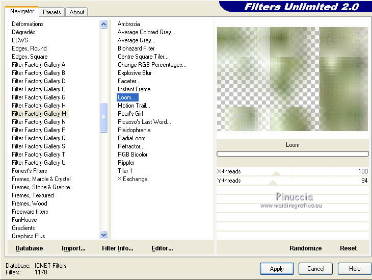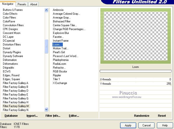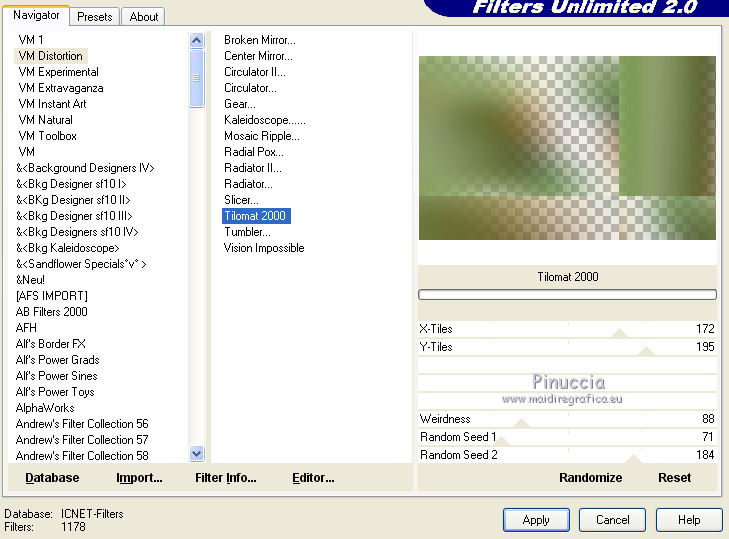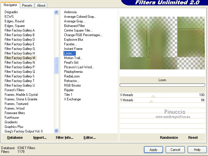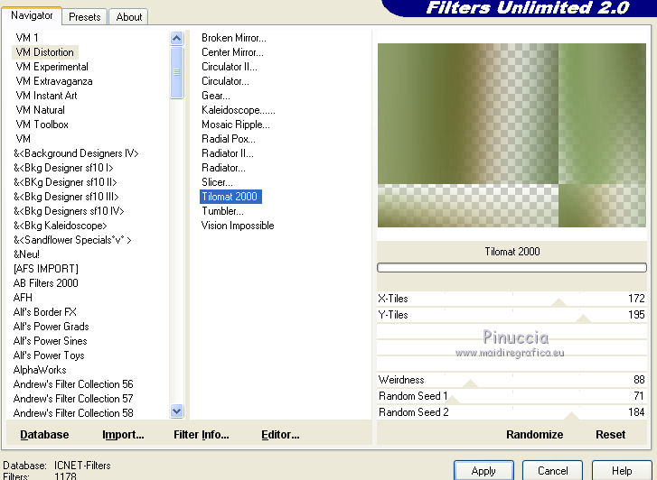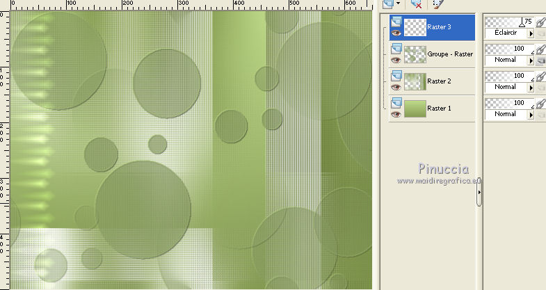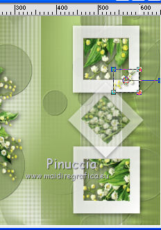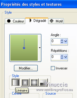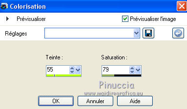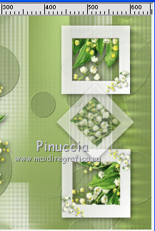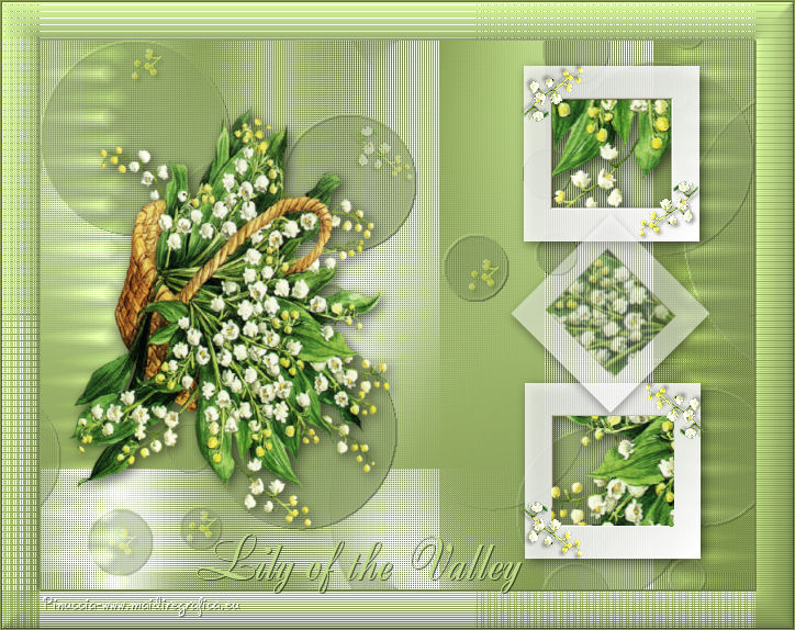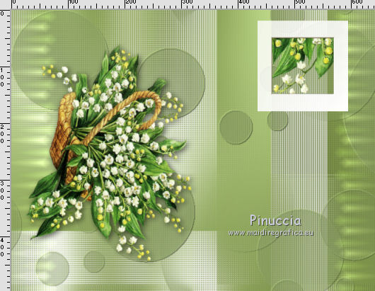 Ce tutoriel a été créé avec CorelX4 et traduit avec CorelX2, mais il peut également être exécuté avec les autres versions. Suivant la version utilisée, vous pouvez obtenir des résultats différents. Depuis la version X4, la fonction Image>Miroir a été remplacée par Image>Renverser horizontalement, et Image>Renverser avec Image>Renverser verticalement. Dans les versions X5 et X6, les fonctions ont été améliorées par la mise à disposition du menu Objets. Dans la nouvelle version X7, nous avons à nouveau Miroir/Renverser, mais avec autres différences. Voir plus les détails à ce sujet ici Certaines dénominations ont changées entre les versions de PSP. Les plus frequentes dénominations utilisées: ![]() Traduction en italien ici Vos versions ici Nécessaire pour réaliser ce tutoriel: Matériel qui Modules Externes consulter, si nécessaire, ma section de filtre ici Filters Unlimited 2.0 ici VM Distortion - Tilomat ici Filter Factory Gallery M - Loom ici Filtres VM Distortion et Factory Gallery peuvent être utilisés seuls ou importés dans Filters Unlimited. voir comment le faire ici). Si un filtre est fourni avec cette icône, ![]() Si vous voulez utiliser vos propres couleurs, n'hésitez pas à changer le mode et l'opacité des calques Dans les plus récentes versions de PSP, vous ne trouvez pas le dégradé d'avant plan/arrière plan ou Corel_06_029. Vous pouvez utiliser le dégradé des versions antérieures. Ici le dossier Dégradés de CorelX. Ouvrez la police et le minimiser. Vous la trouverez dans la liste des polices disponibles lorsque vous en avez besoin. Avec les nouveaux s.o. ce n'est plus possible. Pour utiliser une police, vous devez le copier dans le dossier Fonts de Windows. La style de ligne Corel_13_020 est standard dans PSP et correspond à la ligne Losange des versions précédentes. Si vous ne la trouvez pas dans votre PSP, placer la ligne fournie dans le dossier Styles de Lignes. Placer le masque dans le dossier Masques. 1. Ouvrir une nouvelle image transparente 650 x 500 pixels. 2. Placer en avant plan la couleur #839951, et en arrière plan la couleur #bfdb8a. ![]() Préparer en avant plan un dégradé de premier plan/arrière plan, style Linéaire. ![]() Remplir l'image transparente du dégradé.3. Ouvrir le tube Lily of the valley01, - Édition>Copier. ne pas fermer le tube; on va s'en servir plus tard Revenir sur votre travail et Édition>Coller comme nouveau calque. 4. Réglage>Flou>Flou gaussien - rayon 30. ![]() Déplacer l'image à gauche.5. Calques>Dupliquer. Image>Miroir. Image>Renverser. Calques>Fusionner>Fusionner le calque de dessous. 6. Effets>Modules Externes>Filter Unlimited 2.0. - VM Distortion - Tilomat 2000. ![]() Sur le net il est partagé une version du filtre sans installation, qui se compose de files en format .8bf. Parfois, il arrive que le résultat est différent, mais il n'y a pas de règles codifiées. C'est le cas de cet effet. Pour avoir un résultat comme celui du tutoriel original, j'ai utilisé la versione en file 8bf, que vous pouvez trouver qui Avec la version software de Unlimited le résultat à été ce-ci. ![]() 7. Effets>Modules Externes> - Filter Unlimited 2.0. - Filter Factory Gallery M - Loom. ![]() également dans ce cas, le résultat sera different: avec le filtre Unlimited en version software: ![]() 8. Réglage>Teinte et Saturation>Coloriser. ![]() 9. Calques>Nouveau calque raster. Remplir avec la couleur claire d'arrière plan.10. Calques>Charger/Enregistrer un masque>Charger à partir du disque. Chercher et charger le masque Masker MB55. ![]() Calques>Fusionner>Fusionner le groupe. 11. Effets>Effets 3D>Ombre portée, couleur noire. ![]() 12. Calques>Dupliquer. Effets>Effets d'image>Mosaïque sans jointures, par défaut. ![]() Calques>Fusionner>Fusionner le calque de dessous. 13. Placer à nouveau la couleur foncée en avant plan. Activer l'outil Style ![]() style de ligne Losange, largeur 20. ![]() Tenir enfoncée la touche shift, et tracer une ligne droite de gauche à droite. Calques>Convertir en calque raster. 14. Image>Rotation libre - 90 degrés à droite. ![]() 15. Effets>Effets de distorsion>Vent - vers la gauche, intensité 100. ![]() Déplacer la ligne à gauche, contre le bord.![]() 16. Placer en avant plan la couleur blanche #ffffff. Tracer une nouvelle ligne avec cette couleur. Calques>Convertir en calque raster. Image>Rotation libre - 90 degrés à droite. Effets>Effets de distorsion>Vent, comme précédemment. Déplacer cette ligne à gauche, un peu plus en bas, comme ci-dessous.![]() 17. Calques>Fusionner>Fusionner le calque de dessous. Placer le calque en mode Éclaircir et réduire l'opacité à 75%. ![]() 18. Calques>Dupliquer. Image>Miroir. 19. Activer à nouveau le tube Lily of the valley01, - Édition>Copier. ne pas fermer le tube Revenir sur votre travail et Édition>Coller comme nouveau calque. Image>Miroir. 20. Image>Redimensionner, à 80%, redimensionner tous les calques décoché. Déplacer le tube à gauche.21. Effets>Effets 3D>Ombre portée, couleur noire. ![]() 22. Activer à nouveau le tube. Nous travaillons sur le tube. Activer l'outil Sélection ![]() (peu importe le type de sélection, parce que avec la sélection personnalisée vous obtenez toujours un rectangle), cliquer sur Sélection personnalisée ![]() et setter ces paramètres. ![]() Tenir enfoncée la touche droite de la souris sur la selection, et déplacer la sélection sur la partie du tube que vous voulez copier. Pour moi: ![]() 23. Édition>Copier et garder le tube en attente. Ouvrir le tube Lijstje. Sur ce tube: Activer l'outil Baguette magique , tolérance et progressivité 0,et cliquer au centre du cadre pour le sélectionner. Sélections>Modifier>Agrandir - 2 pixels. Calques>Nouveau calque raster. Calques>Agencer>Déplacer vers le bas. Édition>Coller dans la sélection. Sélections>Désélectionner tout. 24. Édition>Copie Spéciale>Copier avec fusione, et minimiser le cadre. si vous voules le f