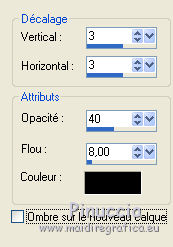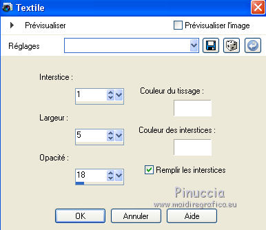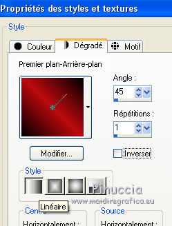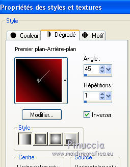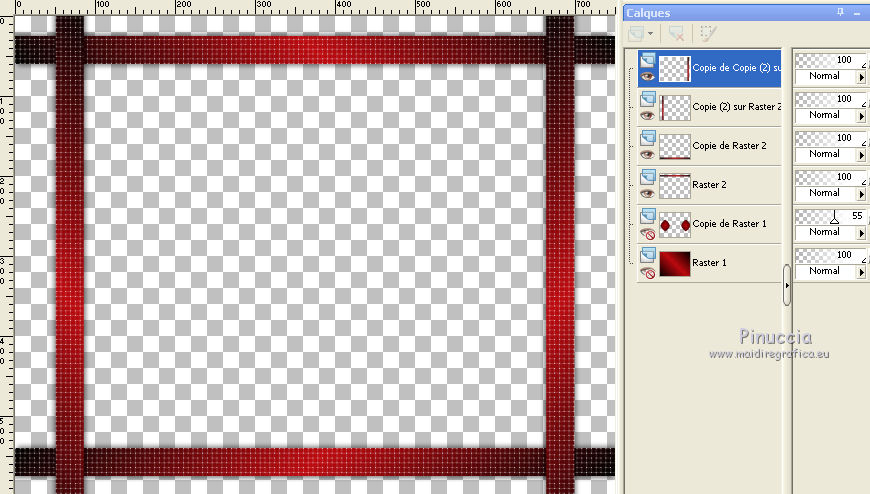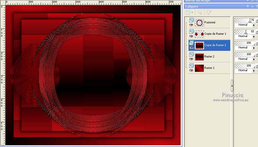 Pour traduire ce tutoriel j'ai utilisé Corel X2, mais il peut également être exécuté avec les autres versions. Suivant la version utilisée, vous pouvez obtenir des résultats différents. Depuis la version X4, la fonction Image>Miroir a été remplacée par Image>Renverser horizontalement, et Image>Renverser avec Image>Renverser verticalement. Dans les versions X5 et X6, les fonctions ont été améliorées par la mise à disposition du menu Objets. Dans la nouvelle version X7, nous avons à nouveau Miroir/Renverser, mais avec autres différences. Voir plus les détails à ce sujet ici Certaines dénominations ont changées entre les versions de PSP. Les plus frequentes dénominations utilisées: ![]() Traduction en italien ici Vos versions ici Nécessaire pour réaliser ce tutoriel: Matériel qui Pour le tube merci Claudia Viza. Modules Externes consulter, si nécessaire, ma section de filtre ici Filters Unlimited 2.0 ici ECWS - Tile Maker 1.0 ici VM Distortion - Tumbler, Vision impossible ici Filtres ECWS et VM Distortion peuvent être utilisés seuls ou importés dans Filters Unlimited. voir comment le faire ici). Si un filtre est fourni avec cette icône, ![]() Si vous voulez utiliser vos propres couleurs, n'hésitez pas à changer le mode et l'opacité des calques Dans les plus récentes versions de PSP, vous ne trouvez pas le dégradé d'avant plan/arrière plan ou Corel_06_029. Vous pouvez utiliser le dégradé des versions antérieures. Ici le dossier Dégradés de CorelX. 1. Placer en avant plan la couleur #000000, et en arrière plan la couleur #bc0b10. ![]() Préparer en avant plan un dégradé de premier plan/arrière plan, style Linéaire. ![]() 2. Ouvrir une nouvelle image transparente 750 x 600 pixels, et remplir l'image transparente du dégradé.3. Calques>Dupliquer. Image>Redimensionner, à 90%, redimensionner tous les calques décoché. 4. Effets>Effets géométriques>Cercle. ![]() 5. Effets>Modules Externes>Filters Unlimited 2.0 - VM Distortion - Tumbler. ![]() 6. Répéter Effets>Effets géométriques>Cercle. ![]() 7. Effets>Effets 3D>Ombre portée, couleur noire. ![]() Répéter Ombre portée, mais vertical et horizontal -3. 8. Image>Redimensionner, à 50%, redimensionner tous les calques décoché. Activer l'outil Déplacer ![]() et cliquer sur le clavier 5 fois la touche de la flèche à gauche. sur l'utilisation de l'outil Déplacer avec les flèches du clavier, voir ici 9. Calques>Dupliquer. Image>Miroir. Calques>Fusionner>Fusionner le calque de dessous. 10. Réglage>Netteté>Netteté. Réduire l'opacité de ce calque à 55%. 11. Calques>Nouveau calque raster. Activer l'outil Sélection ![]() (peu importe le type de sélection, parce que avec la sélection personnalisée vous obtenez toujours un rectangle), cliquer sur Sélection personnalisée ![]() et setter ces paramètres. ![]() Remplir la sélection du dégradé.Sélections>Désélectionner tout. 12. Effets>Effets de textures>Textile, les deux couleurs: blanche. ![]() 13. Effets>Effets 3D>Ombre portée, couleur noire. ![]() Répéter Ombre portée, mais vertical et horizontal -3. 14. Calques>Dupliquer. Image>Renverser. 15. Calques>Dupliquer. Image>Rotation libre - 90 degrés à gauche. ![]() 16. Déplacer la ligne à gauche, à 50 pixels![]() 17. Calques>Dupliquer. Image>Miroir. 18. Fermer les deux calques du bas de la pile, et rester positionné sur le calque du haut de la pile. ![]() Calques>Fusionner>Calques visibles. 19. Re-ouvrir les deux calques du bas de la pile et rester positionné sur le calque fusionné. 20. Effets>Effets géométriques>Cercle. ![]() 21. Image>Redimensionner, à 90%, redimensionner tous les calques décoché. 22. Effets>Effets 3D>Ombre portée, couleur noire. ![]() 23. Calques>Dupliquer. Image>Redimensionner, à 90%, redimensionner tous les calques décoché. Réduire l'opacité de ce calque à 65%. 24. Calques>Dupliquer. Image>Redimensionner, à 90%, redimensionner tous les calques décoché. 25. Calques>Fusionner>Fusionner le calque de dessous - 2 fois. Réglage>Netteté>Netteté. Réduire l'opacité de ce calque à 75%. 26. Vous positionner sur le calque du bas de la pile, Raster 1. Calques>Nouveau calque raster. 27. Changer les règlages du dégradé, et sélectionner Inverser. ![]() 28. Sélections>Sélectionner tout. Sélections>Modifier>Contracter - 35 pixels. Remplir du dégradé.29. Effets>Modules Externes>Filters Unlimited 2.0 - VM Distortion - Vision Impossible. ![]() Effets>Effets de bords>Accentuer. Réglage>Netteté>Netteté. Sélections>Désélectionner tout. 30. Effets>Effets 3D>Ombre portée, couleur noire. ![]() Répéter Ombre portée, mais vertical et horizontal -5. 31. Calques>Dupliquer. Image>Redimensionner, à 90%, redimensionner tous les calques décoché. Image>Renverser. 32. Vous devriez avoir ce-ci. ![]() 33. Calques>Fusionner>Tous. 34. Ouvrir le tube Siertakje - Édition>Copier. Revenir sur votre travail et Édition>Coller comme nouveau calque. Déplacer le tube dans le coin en bas à droite.35. Effets>Effets 3D>Ombre portée, couleur noire. ![]() 36. Image>Ajouter des bordures, 25 pixels, symétrique, couleur blanche. Activer l'outil Baguette magique , tolérance et progressivité 0,et cliquer sur le bord blanc pour le sélectionner. Changer à nouveau les règlages du dégrade, et désélectionner Inverser. ![]() Remplir la sélection du dégradé.37. Effets>Modules Externes>Filters Unlimited 2.0 - ECWS - Tile Maker 1.0. ![]() 38. Sélections>Inverser. Effets>Effets 3D>Ombre portée, couleur noire. ![]() Répéter Ombre portée, mais vertical et horizontal -5. Sélections>Désélectionner tout. 39. Ouvrir le tube tubeclaudiaviza-mujer245, - Édition>Copier. Revenir sur votre travail et Édition>Coller comme nouveau calque. Image>Redimensionner, 1 fois à 80% et 1 fois à 85%, redimensionner tous les calques décoché. 40. Effets>Effets 3D>Ombre portée, couleur noire. ![]() 41. Signer votre travail sur un nouveau calque. 42. Image>Ajouter des bo