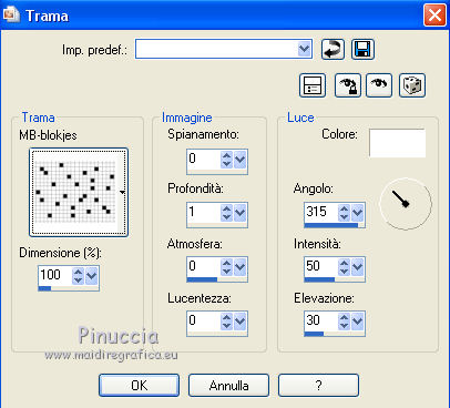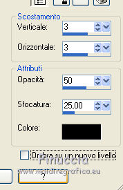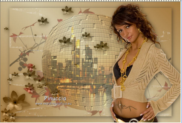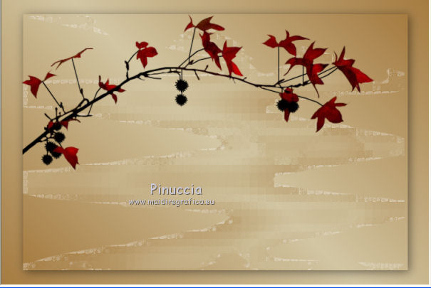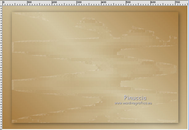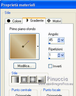 qui puoi trovare qualche risposta ai tuoi dubbi. Se l'argomento che ti interessa non è presente, ti prego di segnalarmelo. Per tradurre questo tutorial ho usato CorelX, ma può essere eseguito con ogni versione di PSP. Dalla versione X4, il comando Immagine>Rifletti è stato sostituito con Immagine>Capovolgi in orizzontale, e il comando Immagine>Capovolgi con Immagine>Capovolgi in verticale. Nelle versioni X5 e X6, le funzioni sono state migliorate rendendo disponibile il menu Oggetti. Con la nuova versione X7, sono tornati Rifletti/Capovolgi, ma con nuove differenze Vedi la scheda sull'argomento qui traduction en français qui Le vostre versioni qui Occorrente: Materiale qui Per il tube grazie Guta Milo. Filtri in caso di dubbi, ricorda di consultare la mia sezione filtri qui Adjust - Variations qui ![]() se stai usando altri colori, sperimenta le modalità di miscelatura e opacità più adatte ai tuoi colori Nelle ultime versioni di PSP non c'è il gradiente di primo piano/sfondo (Corel_06_029) Trovi i gradienti delle versioni precedenti qui Metti la trama MB-blokjes nella cartella Trame. 1. Apri una nuova immagine trasparente 750 x 500 pixels. Imposta il colore di primo piano con #a57b41, e il colore di sfondo con #d2c6a3. ![]() Passa il colore di primo piano a Gradiente di primo piano/sfondo, stile Lineare. ![]() Riempi l'immagine trasparente con il gradiente.2. Livelli>Duplica. Immagine>Ridimensiona, al 90%, tutti i livelli non selezionato. 3. Livelli>Duplica. Chiudi questo livello e attiva il livello sottostante - copia di Raster 1. 4. Effetti>Effetti 3D>Sfalsa ombra, colore nero. ![]() 5. Apri il tube Deco-MB-1, e vai a Modifica>Copia. Torna al tuo lavoro e vai a Modifica>Incolla come nuovo livello. Spostalo in alto a sinistra.Abbassa l'opacità di questo livello al 40%. ![]() 6. Apri il tube di Alies Bloemen, e vai a Modifica>Copia. Torna al tuo lavoro e vai a Modifica>Incolla come nuovo livello. Posiziona correttamente il tube.![]() Abbassa l'opacità di questo livello al 40%. Livelli>Duplica. Immagine>Capovolgi. Immagine>Rifletti. 7. Riapri e attiva il livello superiore. Effetti>Effetti di trama>Trama - seleziona la trama MB-blokjes. ![]() 8. Effetti>Effetti geometrici>Cerchio. ![]() 9. Immagine>Ridimensiona, al 90%, tutti i livelli non selezionato. . 10. Selezione>Seleziona tutto. Selezione>Mobile. Selezione>Immobilizza. 11. Livelli>Nuovo livello raster. Apri il tube city_in_the_evening_109_TbS, e vai a Modifica>Copia. Torna al tuo lavoro e vai a Modifica>Incolla nella selezione. 12. Cambia la modalità di miscelatura di questo livello in Luce netta, e abbassa l'opacità al 46%. Selezione>Deseleziona. 13. Livelli>Unisci>Unisci tutto. 14. Apri il tube PHtube_woman_5c65_10_2-, e vai a Modifica>Copia. Torna al tuo lavoro e vai a Modifica>Incolla come nuovo livello. Immagine>Rifletti. Sposta il tube a destra, vedi il mio esempio.15. Effetti>Effetti 3D>Sfalsa ombra, colore nero. ![]() 16. Apri il tube deco-bloem-2015, e vai a Modifica>Copia. Torna al tuo lavoro e vai a Modifica>Incolla come nuovo livello. 17. Effetti>Effetti 3D>Sfalsa ombra, colore nero. ![]() Sposta il tube in basso a sinistra, vedi il mio esempio.Cambia la modalità di miscelatura di questo livello in luminanza (esistente). ![]() 18. Apri il tube licoregm, e vai a Modifica>Copia. Torna al tuo lavoro e vai a Modifica>Incolla come nuovo livello. Immagine>Ridimensiona, 1 volta al 50% e una volta all'80%, tutti i livelli non selezionato. 19. Effetti>Plugins> - Adjust - Variations un clic su Original per annullare eventuali precedenti settaggi memorizzati dal filtro, due clic su Darker e ok. 20. Livelli>Duplica. Immagine>Ridimensiona, al 75%, tutti i livelli non selezionato. Spostalo nell'angolo in basso a sinistra.21. Ripeti sul livello del vaso piccolo: Effetti>Plugins>Adjust - Variations, un clic su Lighter e ok. 22. Su entrambi i livelli dei vasi: Effetti>Effetti 3D>Sfalsa ombra, colore nero, con i settaggi precedenti. 23. Firma il tuo lavoro. Immagine>Aggiungi bordatura, 2 pixels, simmetriche, colore nero. Salva in formato jpg. ![]() Se hai problemi o dubbi, o trovi un link non funzionante, o anche soltanto per un saluto, scrivimi. 3 Ottobre 2015 |