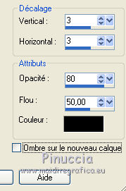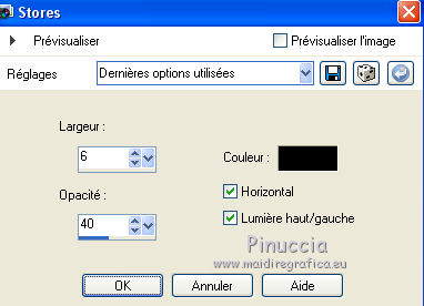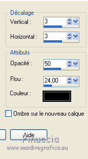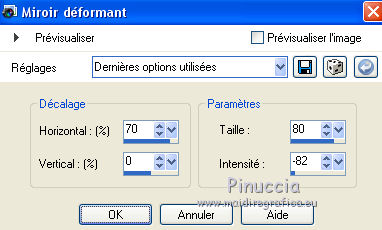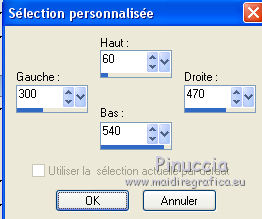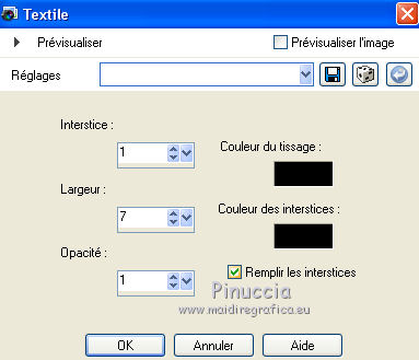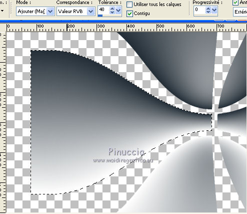 Ce tutoriel a été créé avec CorelX17, mais il peut également être exécuté avec les autres versions. Pour traduire le tutoriel j'ai utilisé CorelX et CorelX2. Suivant la version utilisée, vous pouvez obtenir des résultats différents. Depuis la version X4, la fonction Image>Miroir a été remplacée par Image>Renverser horizontalement, et Image>Renverser avec Image>Renverser verticalement. Dans les versions X5 et X6, les fonctions ont été améliorées par la mise à disposition du menu Objets. Dans la nouvelle version X7, nous avons à nouveau Miroir/Renverser, mais avec autres différences. Voir plus les détails à ce sujet ici Certaines dénominations ont changées entre les versions de PSP. Les plus frequentes dénominations utilisées: ![]() Traduction en italien ici Nécessaire pour réaliser ce tutoriel: Matériel qui Tube de Nara Pamplona. Modules Externes consulter, si nécessaire, ma section de filtre ici Lotis Filter qui AAA Frames - Foto Frame qui ![]() Si vous voulez utiliser vos propres couleurs, n'hésitez pas à changer le mode et l'opacité des calques Dans les plus récentes versions de PSP, vous ne trouvez pas le dégradé d'avant plan/arrière plan ou Corel_06_029. Vous pouvez utiliser le dégradé des versions antérieures. Ici le dossier Dégradés de CorelX. 1. Placer en avant plan la couleur #ffffff, et en arrière plan la couleur #253039. ![]() Préparer en avant plan un dégradé de premier plan/arrière plan, style Linéaire. ![]() Ouvrir une nouvelle image transparente 800 x 600 pixels. Remplir du dégradé.2. Calques>Dupliquer. Image>Renverser. 3. Image>Redimensionner, à 80%, redimensionner tous les calques décoché. 4. Calques>Dupliquer. Effets>Effets de distorsion>Miroir déformant. ![]() 5. Activer l'outil Baguette magique , tolérance 40,fermer les autres calques pour voir mieux la forme à sélectionner, ![]() et cliquer sur la forme à gauche pour la sélectionner (vous devrez cliquer plusieurs fois). ![]() 6. Sélections>Inverser. Presser CANC sur le clavier ![]() Sélections>Désélectionner tout. Re-ouvrir les calques fermés et rester positionner sur le calque du haut de la pile. 7. Effets>Modules Externes>Lotis Filters - Mosaic Toolkit - Quilt. ![]() 8. Image>Redimensionner, à 80%, redimensionner tous les calques décoché. Déplacer la forme contre le bord à gauche.9. Calques>Dupliquer. Image>Miroir. Positionner les calques une contre l'autre.![]() 10. Assurez-vous d'être positionner sur le calque de dessus. Calques>Fusionner>Fusionner le calque de dessous. 11. Effets>Effets 3D>Ombre portée, couleur noire. ![]() Réduire l'opacité de ce calque à 46% (ou en fonction de vos couleurs). 12. Vous positionner sur le calque du bas de la pile Raster 1. Effets>Effets de textures>Stores, couleur noire #000000. ![]() 13. Vous positionner sur le calque Raster 1. Effets>Effets de textures>Textile, les deux couleurs #000000. ![]() 14. Effets>Effets 3D>Ombre portée, couleur noire. ![]() 15. Vous positionner sur le calque du haut de la pile. Calques>Nouveau calque raster. Activer l'outil Sélection ![]() (peu importe le type de sélection, parce que avec la sélection personnalisée vous obtenez toujours un rectangle), cliquer sur Sélection personnalisée ![]() et setter ces paramètres. ![]() Remplir le calque du dégradé.Sélections>Désélectionner tout. 16. Effets>Effets de distorsion>Miroir déformant, comme précédemment. ![]() 17. Effets>Effets de textures>Textile, comme précédemment. 18. Calques>Dupliquer. Image>Miroir. Calques>Fusionner>Fusionner le calque de dessous. 19. Effets>Effets 3D>Ombre portée, couleur noire. ![]() Réduire l'opacité de ce calque à 60%. 20. Activer l'outil Sélection , cercle,et tracer un cercle au centre de l'image. ![]() 21. Calques>Nouveau calque raster. Remplir le calque du dégradé.Effets>Effets de textures>Stores, comme précédemment, mais horizontal décoché. ![]() Sélections>Désélectionner tout. 22. Positionner le cercle au centre.Pour être sûr d'avoir le cercle au centre: Édition>Couper. Édition>Coller comme nouveau calque, et le cercle sera au centré. (le calque original du cercle sera vide). 23. Effets>Effets 3D>Ombre portée, couleur noire. ![]() Réduire l'opacité de ce calque à 55% (ou selon vos couleurs). 24. Calques>Fusionner>Calques visibles. 25. Ouvrir le tube 0_7ae71_4c070e4f_L.png, Édition>Copier. Revenir sur votre travail et Édition>Coller comme nouveau calque. Image>Redimensionner, à 120%, redimensionner tous les calques décoché. Image>Miroir. Réglage>Netteté>Netteté. 26. Effets>Effets 3D>Ombre portée, couleur noire. ![]() Déplacer le tube en bas à gauche.Voir le résultat final. 27. Ouvrir le tube TubeNP 1277, Édition>Copier. Revenir sur votre travail et Édition>Coller comme nouveau calque. Image>Redimensionner, à 70%, redimensionner tous les calques décoché. Réglage>Netteté>Netteté. 28. Effets>Effets 3D>Ombre portée, couleur noire. ![]() 29. Image>Ajouter des bordures, 2 pixels, couleur foncée. 30. Calques>Nouveau calque raster. Activer l'outil Sélection , cercle, mode Ajouter,et tracer des cercles de différentes tailles. ![]() Remplir du dégradé.31. Effets>Effets de textures>Textile, comme précédemment. Sélections>Désélectionner tout. 32. Effets>Effets 3D>Ombre portée, couleur noire. ![]() Réduire l'opacité de ce calque à 45%, ou selon vos couleurs. 33. Calques>Fusionner>tous. 34. Effets>Modules Externes>AAA Frames - Foto Frame. ![]() 35. Sélections>Sélectionner tout. Image>Ajouter des bordures, 50 pixels, symétrique, couleur blanche. 36. Effets>Effets 3D>Ombre portée, couleur noire. ![]() Sélections>Désélectionner tout. 37. Effets>Modules Externes>AAA Frames - Foto Frame, comme précédemment. 38. Signer votre travail sur un nouveau calque. Calques>Fusionner>Tous et enregistrer en jpg. Version avec les autres tubes fournis de Lori Rhae et Gina. ![]() ![]() Si vous avez des problèmes, ou des doutes, ou vous trouvez un link