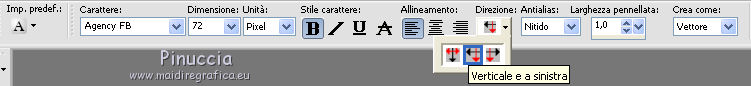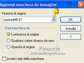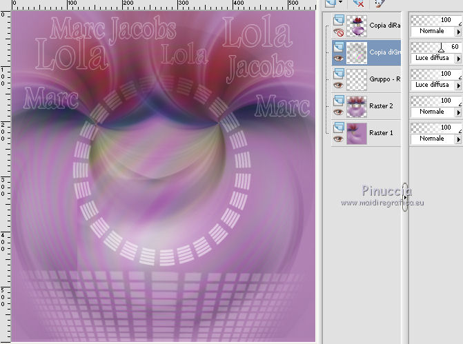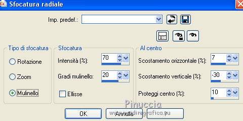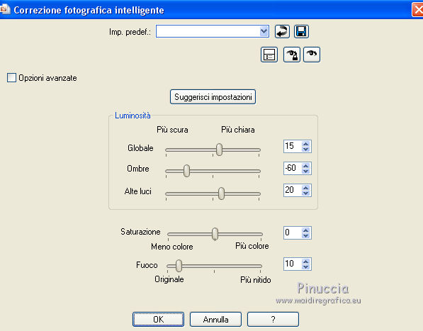qui puoi trovare qualche risposta ai tuoi dubbi. Se l'argomento che ti interessa non è presente, ti prego di segnalarmelo. Per tradurre questo tutorial ho usato CorelX, ma può essere eseguito con ogni versione di PSP. Dalla versione X4, il comando Immagine>Rifletti è stato sostituito con Immagine>Capovolgi in orizzontale, e il comando Immagine>Capovolgi con Immagine>Capovolgi in verticale. Nelle versioni X5 e X6, le funzioni sono state migliorate rendendo disponibile il menu Oggetti. Con la nuova versione X7, sono tornati Rifletti/Capovolgi, ma con nuove differenze Vedi la scheda sull'argomento qui traduction en français qui Occorrente: Materiale qui Il tube del profumo è di Karine. Filtri in caso di dubbi, ricorda di consultare la mia sezione filtri qui Simple - Zoom out and flip qui FM Tile Tools - Blend Emboss qui Filters Unlimited 2.0 qui I filtri Simple si possono usare da soli o importati in Filters Unlimited (come fare vedi qui) Se un filtro fornito appare con questa icona ![]() se stai usando altri colori, sperimenta le modalità di miscelatura e opacità più adatte ai tuoi colori Nelle ultime versioni di PSP non c'è il gradiente di primo piano/sfondo (Corel_06_029) Trovi i gradienti delle versioni precedenti qui Metti il preset Preset_BallAndBubbles_mb-66 nella cartella Impostazioni predefinite. Apri la maschera in PSP e minimizzala con il resto del materiale. 1. Apri una nuova immagine trasparente 550 x 600 pixels. Imposta il colore di primo piano con #b183b4, e il colore di sfondo con #982123. ![]() Riempi l'immagine trasparente con il colore di primo piano.2. Apri il tube k@rine_ dreams _Lola_903_janvier 2010, e vai a Modifica>Copia. Torna al tuo lavoro e vai a Modifica>Incolla come nuovo livello. 3. Livelli>Duplica. Chiudi il livello superiore e attiva il livello inferiore - Raster 2. Regola>Sfocatura>Sfocatura radiale. ![]() Sposta l'immagine a sinistra.4. Livelli>Duplica. Immagine>Rifletti. Posiziona l'immagine a destra.![]() 5. Assicurati di essere posizionato sul livello superiore. Livelli>Unisci>Unisci giù. 6. Livelli>Nuovo livello raster. Imposta il colore di primo piano con il colore bianco. Riempi il livello con il colore bianco.7. Livelli>Nuovo livello maschera>Da immagine. Apri il menu sotto la finestra di origine e vedrai la lista dei files aperti. Seleziona la maschera maskerMB-66, con i seguenti settaggi. ![]() Livelli>Unisci>Unisci gruppo. Cambia la modalità di miscelatura di questo livello in Luce diffusa. 8. Livelli>Duplica. Effetti>Effetti artistici>Sfere e bolle. Seleziona il preset mb66 e ok. ![]() 9. Mantieni la modalità di miscelatura in Luce diffusa e abbassa l'opacità al 60%. ![]() 10. Riapri e attiva il livello superiore (il tube di Karine). 11. Effetti>Effetti 3D>Sfalsa ombra, colore nero. ![]() 12. Spostalo un po' più a sinistra e in basso.Vedi il mio esempio. 13. Livelli>Unisci>Unisci tutto. 14. Immagine>Aggiungi bordatura, 2 pixels, simmetriche, colore #982123. 15. Modifica>Copia. 16. Immagine>Aggiungi bordatura, simmetriche non selezionato, colore bianco #ffffff. ![]() Immagine>Aggiungi bordatura, 2 pixels, simmetriche, colore #982123. 17. Attiva lo strumento Bacchetta magica ![]() e clicca nel bordo bianco per selezionarlo. 18. Livelli>Nuovo livello raster. Modifica>Incolla nella selezione. 19. Regola>Sfocatura>Sfocatura radiale, con i settaggi precedenti. ![]() 20. Effetti>Plugins>FM Tile Tools - Blend Emboss. ![]() 21. Mantieni selezionato. Livelli>Duplica. Ripeti Effetti>Plugins> - FM Tile Tools - Blend Emboss. 22. Effetti>Plugins>Simple - zoom out and flip. 23. Effetti>Plugins>FM Tile Tools - Blend Emboss - 2 volte. 24. Effetti>Effetti di bordo>Aumenta. Selezione>Deseleziona. 25. Livelli>Unisci>Unisci tutto. 26. Riporta il colore di primo piano al colore iniziale #b183b4, e inverti i colori della paletta: ![]() 27. Attiva lo strumento Testo ![]() Font Agency FB, dimensioni 72, direzione verticale. ![]() Scrivi il tuo testo in lettere maiuscole. Usa la griglia dello strumento per allargare il testo, pressappoco come nell'esempio. ![]() Livelli>Converti in livello raster. Cambia la modalità di miscelatura di questo livello in Luce diffusa. 28. Effetti>Effetti 3D>Sfalsa ombra, colore nero. ![]() 29. Attiva il livello Raster 1. Regola>Correzione fotografica intelligente. ![]() 30. Livelli>Unisci>Unisci tutto. 31. Firma il tuo lavoro su un nuovo livello. Salva in formato jpg. ![]() Se hai problemi o dubbi, o trovi un link non funzionante, o anche soltanto per un saluto, scrivimi. 3 Ottobre 2015 |