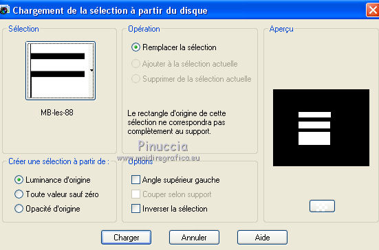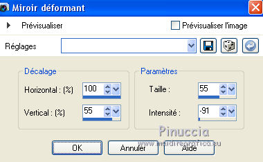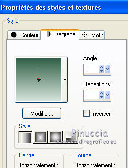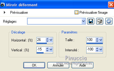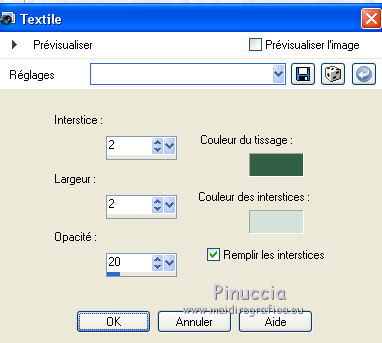 Ce tutoriel a été créé avec CorelX17, mais il peut également être exécuté avec les autres versions. Pour traduire le tutoriel j'ai utilisé CorelX et CorelX2. Suivant la version utilisée, vous pouvez obtenir des résultats différents. Depuis la version X4, la fonction Image>Miroir a été remplacée par Image>Renverser horizontalement, et Image>Renverser avec Image>Renverser verticalement. Dans les versions X5 et X6, les fonctions ont été améliorées par la mise à disposition du menu Objets. Dans la nouvelle version X7, nous avons à nouveau Miroir/Renverser, mais avec autres différences. Voir plus les détails à ce sujet ici Certaines dénominations ont changées entre les versions de PSP. Les plus frequentes dénominations utilisées: ![]() Traduction en italien ici Vos versions ici Nécessaire pour réaliser ce tutoriel: Matériel qui Le tube est de Anna.br. Modules Externes consulter, si nécessaire, ma section de filtre ici Xero - Porcelain ici Bordemania - Frame#2 ici Mura's Meister - Perspective Tiling ici ![]() Si vous voulez utiliser vos propres couleurs, n'hésitez pas à changer le mode et l'opacité des calques Dans les plus récentes versions de PSP, vous ne trouvez pas le dégradé d'avant plan/arrière plan ou Corel_06_029. Vous pouvez utiliser le dégradé des versions antérieures. Ici le dossier Dégradés de CorelX. Placer les sélections dans le dossier Sélections. Ouvrir le masque dans PSP et le minimiser avec le reste du matériel. 1. Ouvrir une nouvelle image transparente 750 x 600 pixels. Placer en avant plan la couleur #326046, et en arrière plan la couleur #d4e2da. ![]() Préparer en avant plan un dégradé de premier plan/arrière plan, style Linéaire. ![]() Remplir l'image transparente du dégradé.2. Calques>Dupliquer. Effets>Modules Externes>Mura's Meister - Perspective Tiling. ![]() 4. Effets>Effets de distorsion>Miroir déformant. ![]() 5. Calques>Dupliquer. Image>Renverser. Déplacer un peu les deux calques,de façon que les trous soient remplis, comme ci-dessous. ![]() 6. Assurez-vous d'être positionné sur le calque du haut. Calques>Fusionner>Fusionner le calque de dessous. Placer le calque en mode Lumière douce. 7. Calques>Nouveau calque raster. Remplir avec la couleur claire.8. Calques>Nouveau calque de masque>A partir d'une image. Ouvrir le menu deroulant sous la fenêtre d'origine et vous verrez la liste des images ouvertes. Sélectionner le masque sq-blast-border. ![]() Calques>Fusionner>Fusionner le groupe. 9. Calques>Dupliquer. Calques>Fusionner>Fusionner le calque de dessous. 10. Calques>Nouveau calque raster. Sélections>Charger/Enregistrer une sélection>Charger à partir du disque. Chercher et charger la sélection MB-les-88. ![]() 11. Changer les règlages du dégradé, et sélectionner Inverser. ![]() Remplir la sélection du dégradé.12. Effets>Effets de textures>Textile couleur du tissage: couleur foncée; couleur des interstices: couleur claire. ![]() Sélections>Désélectionner tout. 13. Effets>Effets de distorsion>Miroir déformant. ![]() 14. Activer l'outil Sélection , rectangle,et sélectionner la forme en bas. ![]() Presser CANC sur le clavier ![]() Sélections>Désélectionner tout. 15. Déplacer la figure contre le bord à gauche,la pointe sur le bouton en bas au centre. ![]() 16. Calques>Dupliquer. Image>Renverser. Déplacer les image en bas à gauche, une contre l'autre.![]() 17. Calques>Fusionner>Fusionner le calque de dessous. 18. Calques>Dupliquer. Image>Miroir. Déplacer en haut à droite, avec la pointe sur le cercle.![]() 19. Calques>Fusionner>Fusionner le calque de dessous. Placer le calque en mode Assombrir davantage. 20. Calques>Fusionner>Tous. 21. Édition>Copier. 22. Calques>Nouveau calque raster. Réduire l'opacité de l'outil Pot de peinture à 30 ![]() et remplir le calque avec la couleur claire.Placer à nouveau l'opacité de l'outil Pot de Peinture à 100. 23. Activer l'outil Sélection ![]() (peu importe le type de sélection, parce que avec la sélection personnalisée vous obtenez toujours un rectangle), cliquer sur Sélection personnalisée ![]() et setter ces paramètres. ![]() 24. Calques>Nouveau calque raster. Remplir avec la couleur claire.25. Sélections>Modifier>Contracter - 1 pixel. Remplir du dégradé.26. Sélections>Modifier>Contracter - 15 pixels. Édition>Coller dans la sélection. Sélections>Désélectionner tout. 27. Effets>Effets 3D>Ombre portée, couleur noire. ![]() 28. Activer le tube KTS Collectie-Botanique, - Édition>Copier. Revenir sur votre travail et Édition>Coller comme nouveau calque. Image>Redimensionner, 3 fois à 75%, redimensionner tous les calques décoché. Déplacer le tube dans le coin en haut à gauche.29. Effets>Modules Externes>Xero - Porcelain, par défaut. ![]() 30. Effets>Effets 3D>Ombre portée, couleur noire. ![]() 31. Activer le tube Anna.brfeminina, - Édition>Copier. Revenir sur votre travail et Édition>Coller comme nouveau calque. Image>Redimensionner, à 90%, redimensionner tous les calques décoché. Déplacer le tube à droite.Voir mon exemple. 32. Calques>Dupliquer. Vous positionner sur le calque de dessous de l'original. Réglage>Flou>Flou gaussien - rayon 30. ![]() 33. Image>Ajouter des bordures, 2 pixels, symétrique, couleur claire. Image>Ajouter des bordures, 15 pixels, symétrique, couleur foncée. 34. Effets>Modules Externes>Bordermania - Frame#2. ![]() 35. Sélections>Sélectionner tout. Sélections>Modifier>Contracter - 15 pixels. Répéter Effets>Modules Externes>Bordermania - Frame#2. 36. Signer votre travail sur un nouveau calque. Calques>Fusionner>Tous et enregistrer en jpg. ![]() Si vous avez des problèmes, ou des doutes, ou vous trouvez un link modifié, ou seulement pour me dire que ce tutoriel vous a plu, vous pouvez m'écrire. 3 Octobre 2015 |