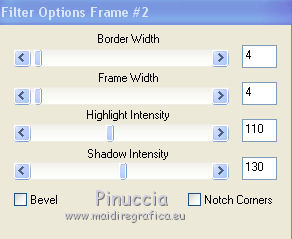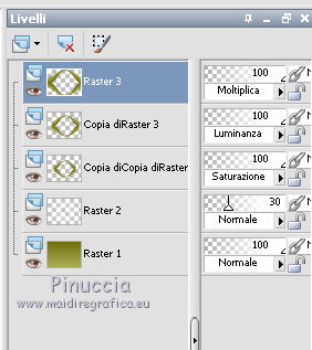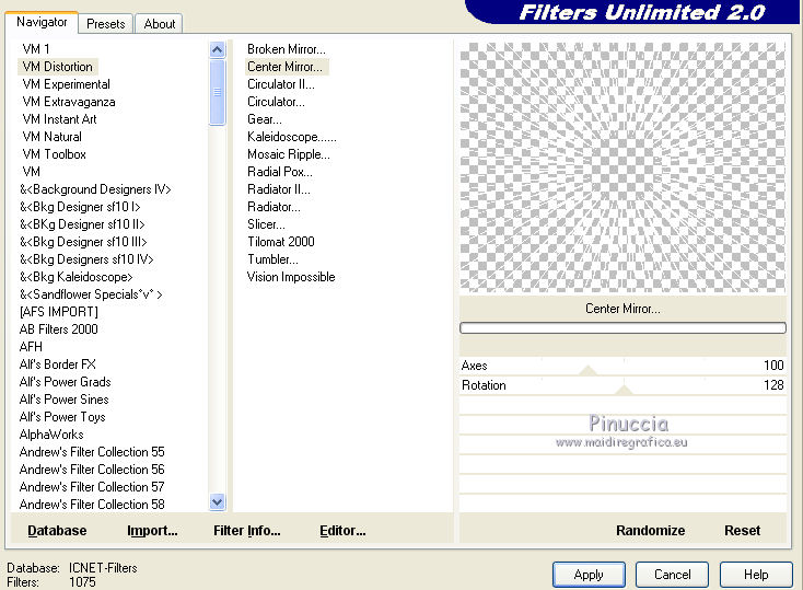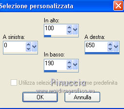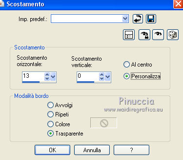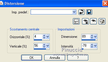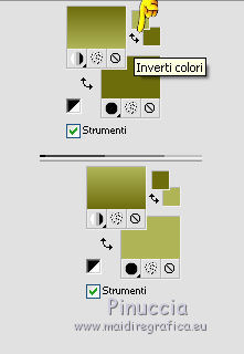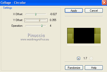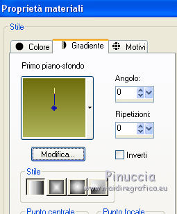 qui puoi trovare qualche risposta ai tuoi dubbi. Se l'argomento che ti interessa non è presente, ti prego di segnalarmelo. Questo tutorial è stato creato con CorelX3 e tradotto con CorelX, ma può essere eseguito con ogni versione di PSP. Dalla versione X4, il comando Immagine>Rifletti è stato sostituito con Immagine>Capovolgi in orizzontale, e il comando Immagine>Capovolgi con Immagine>Capovolgi in verticale. Nelle versioni X5 e X6, le funzioni sono state migliorate rendendo disponibile il menu Oggetti. Con la nuova versione X7, sono tornati Rifletti/Capovolgi, ma con nuove differenze Vedi la scheda sull'argomento qui traduction en français qui Le vostre versioni qui Occorrente: Materiale qui Il tube è di Kitty Filtri in caso di dubbi, ricorda di consultare la mia sezione filtri qui Filters Unlimited 2.0 qui Bordemania - Frame#2 qui FM Tile Tools - Collage Circular qui VM Distortion - Center Mirror qui I filtri VM Distortion si possono usare da soli o importati in Filters Unlimited (come fare vedi qui) Se un filtro fornito appare con questa icona ![]() se stai usando altri colori, sperimenta le modalità di miscelatura e opacità più adatte ai tuoi colori Nelle ultime versioni di PSP non c'è il gradiente di primo piano/sfondo (Corel_06_029) Trovi i gradienti delle versioni precedenti qui 1. Apri una nuova immagine trasparente 650 x 500 pixels. Imposta il colore di primo piano con il colore chiaro #afb458, e il colore di sfondo con il colore scuro #6e6d0e. ![]() Passa il colore di primo piano a Gradiente di primo piano/sfondo, stile Lineare. ![]() Riempi l'immagine trasparente con il gradiente.2. Livelli>Nuovo livello raster. Attiva lo strumento Selezione ![]() (non importa il tipo di selezione impostato, perchè con la selezione personalizzata si ottiene sempre un rettangolo) clicca sull'icona Selezione personalizzata ![]() e imposta i seguenti settaggi. ![]() 3. Imposta il colore di sfondo con il colore bianco. Riempi la selezione con il colore bianco.Selezione>Deseleziona. Riporta il colore di sfondo al colore iniziale #6e6d0e. Effetti>Plugins>Filters Unlimited 2.0 - VM Distortion - Center Mirror. ![]() Abbassa l'opacità di questo livello al 30%. 4. Livelli>Nuovo livello raster. Selezione personalizzata , con i settaggi precedenti.![]() Riempi la selezione con il colore scuro di sfondo.5. Selezione>Modifica>Contrai - 2 pixels. Riempi la selezione con il gradiente.Selezione>Deseleziona. Effetti>Effetti di distorsione>Distorsione. ![]() 6. Sposta il livello un po' più in basso,vedi il mio esempio. 7. Livelli>Duplica. Immagine>Capovolgi. 8. Livelli>Unisci>Unisci giù. 9. Effetti>Effetti 3D>Sfalsa ombra, colore nero. ![]() 10. Livelli>Duplica. Immagine>Ridimensiona, all'80%, tutti i livelli non selezionato. 11. Livelli>Disponi>Sposta giù. Di nuovo Livelli>Duplica. Immagine>Ridimensiona, all'80%, tutti i livelli non selezionato. Livelli>Disponi>Sposta giù. 12. Sul livello Copia di Copia di Raster 3. Cambia la modalità di miscelatura in Saturazione. 13. Attiva il livello soprastante Copia di Raster 3. cambia la modalità di miscelatura in Luminanza. 14. Effetti>Effetti di immagine>Scostamento. ![]() 15. Attiva il livello superiore - Raster 1. Cambia la modalità di miscelatura in Moltiplica. ![]() 16. Livelli>Unisci>Unisci visibile. 17. Immagine>Dimensioni tela - 1000 x 466 pixels. ![]() 18. Attiva lo strumento Bacchetta magica , tolleranza e sfumatura 0,e clicca nelle parti trasparenti per selezionarle. 19. Livelli>Nuovo livello raster. Inverti i colori del gradiente: clicca sulla freccia tra le due palette più piccole, e avrai il nuovo gradiente. ![]() Riempi la selezione con il gradiente.Selezione>Deseleziona. 20. Livelli>Duplica. 21. Effetti>Plugins>FM Tile Tools - Collage Circular. Se hai problemi a usare il cursore per impostare i settaggi, puoi usare le frecce della tastiera. ![]() 22. Effetti>Effetti di immagine>Motivo unico, con i settaggi standard. ![]() 23. Effetti>Effetti di trama>Veneziana. ![]() Cambia la modalità di miscelatura di questo livello in Moltiplica. Livelli>Unisci>Unisci tutto. 24. Apri il tube KS-24-2-2009-Clowns, e vai a Modifica>Copia. Torna al tuo lavoro e vai a Modifica>Incolla come nuovo livello. Immagine>Ridimensiona, al 90%, tutti i livelli non selezionato. Posiziona correttamente il tube.26. Effetti>Effetti 3D>Sfalsa ombra, con i settaggi precedenti. 27. Apri il tube Randje, e vai a Modifica>Copia. Torna al tuo lavoro e vai a Modifica>Incolla come nuovo livello. 28. Effetti>Effetti di immagine>Scostamento. ![]() 29. Livelli>Duplica. Immagine>Rifletti. 30. Apri il tube Rondjes wit, e vai a Modifica>Copia. Torna al tuo lavoro e vai a Modifica>Incolla come nuovo livello. 31. Effetti>Effetti di immagine>Scostamento. ![]() Abbassa l'opacità di questo livello al 50%. 32. Livelli>Duplica. Immagine>Rifletti. 33. Immagine>Aggiungi bordatura, 4 pixels, simmetriche, colore chiaro. Attiva lo strumento Bacchetta magica , sfumatura e tolleranza 0,e clicca nel bordo chiaro per selezionarlo. Riempi la selezione con il gradiente.Selezione>Deseleziona. 34. Effetti>Plugins>Bordermania - Frame#2. ![]() 35. Firma il tuo lavoro e salva in formato jpg. ![]() Se hai problemi o dubbi, o trovi un link non funzionante, o anche soltanto per un saluto, scrivimi. 3 Ottobre 2015 |