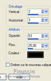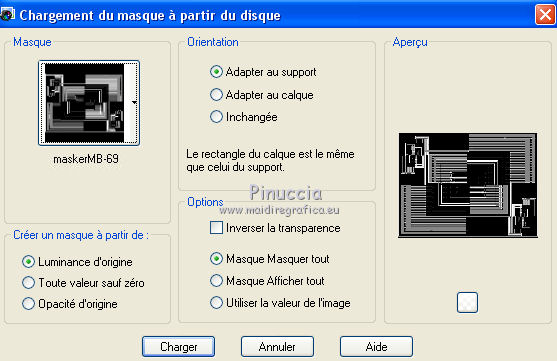 Ce tutoriel a été créé avec CorelX17, mais il peut également être exécuté avec les autres versions. Pour traduire le tutoriel j'ai utilisé CorelX et CorelX2. Suivant la version utilisée, vous pouvez obtenir des résultats différents. Depuis la version X4, la fonction Image>Miroir a été remplacée par Image>Renverser horizontalement, et Image>Renverser avec Image>Renverser verticalement. Dans les versions X5 et X6, les fonctions ont été améliorées par la mise à disposition du menu Objets. Dans la nouvelle version X7, nous avons à nouveau Miroir/Renverser, mais avec autres différences. Voir plus les détails à ce sujet ici Certaines dénominations ont changées entre les versions de PSP. Les plus frequentes dénominations utilisées: ![]() Traduction en italien ici Vos versions ici Nécessaire pour réaliser ce tutoriel: Matériel qui Le tube est Lori Rhae. Modules Externes consulter, si nécessaire, ma section de filtre ici Filters Unlimited 2.0 ici AAA Frames - Foto Frame ici Graphics Plus - Cross Shadow ici Filtres Graphics Plus peuvent être utilisés seuls ou importés dans Filters Unlimited. voir comment le faire ici). Si un filtre est fourni avec cette icône, ![]() Si vous voulez utiliser vos propres couleurs, n'hésitez pas à changer le mode et l'opacité des calques Dans les plus récentes versions de PSP, vous ne trouvez pas le dégradé d'avant plan/arrière plan ou Corel_06_029. Vous pouvez utiliser le dégradé des versions antérieures. Ici le dossier Dégradés de CorelX. Placer le masque dans le dossier Masques. 1. Placer en avant plan la couleur #4c2426, et en arrière plan la couleur #5d5f23. ![]() Préparer en avant plan un Dégradé de premier plan/arrière plan, style Linéaire. ![]() 2. Ouvrir une nouvelle image transparente 800 x 600 pixels, et remplir l'image du dégradé.2. Calques>Nouveau calque raster. Remplir avec la couleur d'arrière plan.3. Calques>Charger/Enregistrer un masque>Charger à partir du disque. Chercher et charger le masque mascherMB69. ![]() Calques>Fusionner>Fusionner le groupe. 4. Effets>Effets de bords>Accentuer davantage. Réduire l'opacité de ce calque à 23%. 5. Calques>Nouveau calque raster. Remplir avec la couleur d'arrière plan.6. Vous positionner sur le calque du masque. Calques>Dupliquer. 7. Calques>Agencer>Placer en haut de la pile. Calques>Fusionner>Fusionner le calque de dessous. 8. Effets>Effets géométriques>Cercle. ![]() 9. Image>Redimensionner, à 80%, redimensionner tous les calques décoché. 10. Effets>Effets 3D>Ombre portée, couleur noire. ![]() Placer le calque en mode Luminance (héritée). 11. Effets>Modules Externes>FM Tile Tools - Blend Emboss, par défaut. ![]() 12. Calques>Dupliquer. Image>Redimensionner, à 75%, redimensionner tous les calques décoché. Placer le calque en mode Éclaircir. 13. Calques>Dupliquer. Image>Redimensionner, à 75%, redimensionner tous les calques décoché. Placer le calque en mode Écran. 14. Activer le tube Natures Treasure_LR, Édition>Copier. Revenir sur votre travail et Édition>Coller comme novueau calque. Déplacer le tube en bas.Voir mon exemple. 15. Effets>Effets 3D>Ombre portée, comme précédemment. 16. Image>Ajouter des bordures, 60 pixels, symétrique, couleur d'arrière plan. 17. Effets>Modules Externes>AAA Frames - Foto Frame. ![]() 18. Sélections>Désélectionner tout. Sélections>Modifier>Contracter - 42 pixels. Sélections>Inverser. Répéter Effets>Modules Externes>AAA Frames - Foto Frame. 19. Effets>Effets de textures>Stores, couleur noire. ![]() 20. Effets>Modules Externes>Graphics plus - Cross Shadow. ![]() Sélections>Désélectionner tout. 21. Image>Ajouter des bordures, 1 pixel, symétrique, couleur foncée. 22. Signer votre travail et enregistrer en jpg. ![]() Si vous avez des problèmes, ou des doutes, ou vous trouvez un link modifié, ou seulement pour me dire que ce tutoriel vous a plu, vous pouvez m'écrire. 3 Octobre 2015 |
