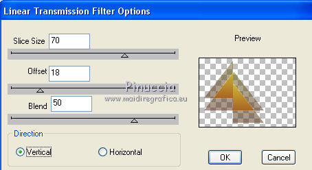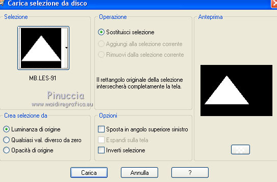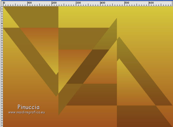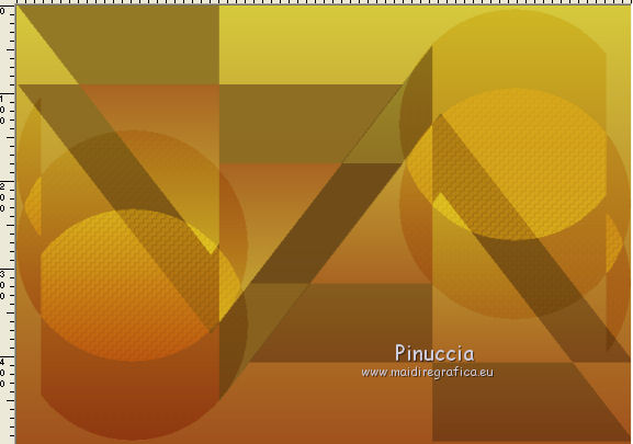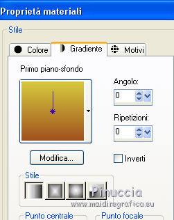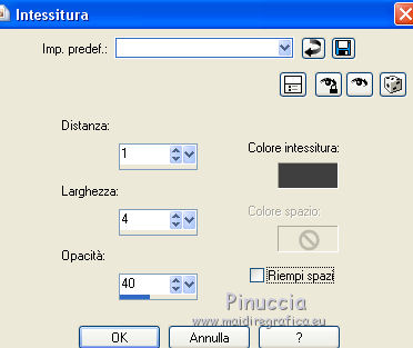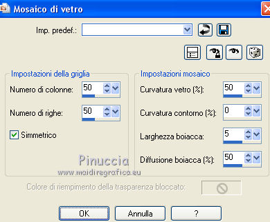 qui puoi trovare qualche risposta ai tuoi dubbi. Se l'argomento che ti interessa non è presente, ti prego di segnalarmelo. Questo tutorial è stato creato con CorelX4 e tradotto con CorelX, ma può essere eseguito con ogni versione di PSP. Dalla versione X4, il comando Immagine>Rifletti è stato sostituito con Immagine>Capovolgi in orizzontale, e il comando Immagine>Capovolgi con Immagine>Capovolgi in verticale. Nelle versioni X5 e X6, le funzioni sono state migliorate rendendo disponibile il menu Oggetti. Con la nuova versione X7, sono tornati Rifletti/Capovolgi, ma con nuove differenze Vedi la scheda sull'argomento qui traduction en français qui Le vostre versioni qui Occorrente: Materiale qui Per il tube grazie Anna.br. Filtri in caso di dubbi, ricorda di consultare la mia sezione filtri qui DSB Flux - Linear Transmission qui FM Tile Tools - Blend Emboss qui ![]() se stai usando altri colori, sperimenta le modalità di miscelatura e opacità più adatte ai tuoi colori Nelle ultime versioni di PSP non c'è il gradiente di primo piano/sfondo (Corel_06_029) Trovi i gradienti delle versioni precedenti qui Metti le selezioni nella cartella selezioni. 1. Apri una nuova immagine trasparente 700 x 500 pixels. Imposta il colore di primo piano con #a0521e, e il colore di sfondo con #d6c93d. ![]() Passa il colore di primo piano a Gradiente di primo piano/sfondo, stile Lineare. ![]() Riempi l'immagine trasparente con il gradiente.2. Selezione>Carica/Salva selezione>Carica selezione da disco. Cerca e carica la selezione MB.les-91. ![]() 3. Livelli>Nuovo livello raster. Riempi con il gradiente.Selezione>Deseleziona. 4. Effetti>Plugins>DSB Flux - Linear Transmission. ![]() 5. Livelli>Duplica. Immagine>Capovolgi. Immagine>Rifletti. Posiziona le due figure come nell'esempio.![]() 6. Assicurati di essere posizionato sul livello superiore. Livelli>Nuovo livello raster. Selezione>Carica/Salva selezione>Carica selezione da disco. Cerca e carica la selezione MB.les-91a. ![]() Riempi con il gradiente.Selezione>Deseleziona. 7. Effetti>Plugins>DSB Flux - Linear Transmission, con i settaggi precedenti. ![]() 8. Effetti>Effetti di trama>Intessitura. colore intessitura #404040. ![]() 9. Cambia la modalità di miscelatura di questo livello in Sovrapponi, e abbassa l'opacità al 70%, o secondo i tuoi colori. 10. Spostalo in basso a sinistra.11. Livelli>Duplica. Immagine>Capovolgi. Immagine>Rifletti. 12. Spostalo in alto a destra.![]() 13. Attiva lo strumento Selezione ![]() (non importa il tipo di selezione impostato, perchè con la selezione personalizzata si ottiene sempre un rettangolo) clicca sull'icona Selezione personalizzata ![]() e imposta i seguenti settaggi. ![]() Livelli>Nuovo livello raster. Riempi con il gradiente.Selezione>Deseleziona. 14. Effetti>Effetti di distorsione>Vento - da sinistra, intensità 100. ![]() Ripeti l'Effetto Vento, questa volta da destra. ![]() 15. Sposta la striscia un po' più in alto a sinistra.Vedi il mio esempio. 16. Cambia la modalità di miscelatura di questo livello in Luminanza (esistente) e abbassa l'opacità al 65%. 17. Livelli>Duplica. Immagine>Rifletti. Immagine>Capovolgi. 18. Apri il tube DI_tube1451, e vai a Modifica>Copia. Torna al tuo lavoro e vai a Modifica>Incolla come nuovo livello. 19. Immagine>Ridimensiona, all'80%, tutti i livelli non selezionato. Spostalo nell'ovale a destra.20. Livelli>Duplica. 21. Effetti>Effetti di trama>Mosaico di vetro. ![]() Livelli>Disponi>Sposta giù. 22. Attiva il livello superiore. Effetti>Effetti 3D>Sfalsa ombra, colore nero. ![]() 23. Apri il tube anna.br-1111_roses, e vai a Modifica>Copia. Torna al tuo lavoro e vai a Modifica>Incolla come nuovo livello. Immagine>Rifletti. 24. Immagine>Ridimensiona, 2 volte all'80%, tutti i livelli non selezionato. 25. Effetti>Effetti 3D>Sfalsa ombra, colore nero. ![]() Sposta il tube in basso a sinistra.26. Livelli>Unisci>Unisci tutto. 27. Modifica>Copia. 28. Immagine>Aggiungi bordatura, 1 pixel, simmetriche, colore scuro. 29. Selezione>Seleziona tutto. 30. Immagine>Aggiungi bordatura, 35 pixels, simmetriche, colore chiaro. 31. Selezione>Inverti. Modifica>Incolla nella selezione. 32. Ripeti Effetti>Effetti di trama>Mosaico di vetro, con i settaggi precedenti. ![]() 33. Selezione>Inverti. Effetti>Effetti 3D>Sfalsa ombra, colore nero. ![]() Selezione>Deseleziona. 34. Firma il tuo lavoro su un nuovo livello. Salva in formato jpg. ![]() Se hai problemi o dubbi, o trovi un link non funzionante, o anche soltanto per un saluto, scrivimi. 3 Ottobre 2015 |