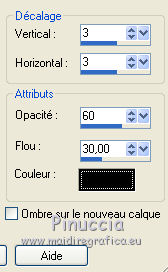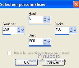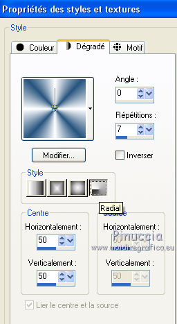 Pour traduire ce tutoriel j'ai utilisé Corel X2, mais il peut également être exécuté avec les autres versions. Suivant la version utilisée, vous pouvez obtenir des résultats différents. Depuis la version X4, la fonction Image>Miroir a été remplacée par Image>Renverser horizontalement, et Image>Renverser avec Image>Renverser verticalement . Dans les versions X5 et X6, les fonctions ont été améliorées par la mise à disposition du menu Objets. Dans la nouvelle version X7, nous avons à nouveau Miroir/Renverser, mais avec autres différences. Voir plus les détails à ce sujet ici Certaines dénominations ont changées entre les versions de PSP. Les plus frequentes dénominations utilisées: ![]() Traduction en italien ici Vos versions ici Nécessaire pour réaliser ce tutoriel: Matériel qui Le tube est de Nini. Modules Externes consulter, si nécessaire, ma section de filtre ici Filters Unlimited 2.0 ici AAA Frames - Foto Frame ici &<Background Designers IV> - @Frame Gradient Switcher (da importare in Unlimited) ici &<Bkg Designer sf10I> - Cruncher (da importare in Unlimited) ici ![]() Si vous voulez utiliser vos propres couleurs, n'hésitez pas à changer le mode et l'opacité des calques 1. Placer en avant plan la couleur #ffffff, et en arrière plan la couleur #27547e. ![]() Préparer un dégradé de premier plan/arrière plan, style Radial. ![]() 2. Ouvrir une nouvelle image transparente 700 x 500 pixels Remplir l'image du dégradé.3. Calques>Dupliquer. Image>Redimensionner, à 80%, redimensionner tous les calques décoché. 4. Effets>Effets 3D>Ombre Portée, couleur noire. ![]() Répéter Ombre portée, mais vertical et horizontal -3. 5. Calques>Fusionner>Calques visibles. 6. Calques>Nouveau calque raster. Activer l'outil Sélection ![]() (peu importe le type de sélection, parce que avec la sélection personnalisée vous obtenez toujours un rectangle), cliquer sur Sélection personnalisée ![]() et setter ces paramètres. ![]() 7. Calques>Nouveau calque raster. Remplir la sélection avec la couleur d'arrière plan.Sélections>Modifier>Contracter - 3 pixels. Remplir du dégradé.Sélections>Désélectionner tout. 8. Effets>Modules Externes>Filters Unlimited 2.0 &<Background Designer sf10I> - Cruncher, par défaut. ![]() Effets>Effets de bords>Accentuer. 9. Activer le tube Belletjes Blauw, Édition>Copier. Revenir sur votre travail et Édition>Coller comme nouveau calque. Calques>Agencer>Déplacer vers le bas. 10. Vous positionner sur le calque du haut de la pile. Effets>Modules Externes>Filters Unlimited 2.0 - &<Background Designer IV> - Frame Gradient Switcher. ![]() 11. Vous positionner sur le calque du bas de la pile. Effets>Modules Externes>AAA Frames - Foto Frame, par défaut. ![]() 12. Effets>Modules Externes>Filters Unlimited 2.0 - ECWS - Tile Maker 1.0. ![]() 13. Vous positionner sur le calque du haut de la pile. Activer le tube deco-2, Édition>Copier. Revenir sur votre travail et Édition>Coller comme nouveau calque. Déplacer le tube en bas au centre.![]() 14. Effets>Effets 3D>Ombre portée, couleur noire. ![]() 15. Calques>Dupliquer. Image>Renverser. 16. Activer le tube Labelle_Nini_Tube.psp, Édition>Copier. Revenir sur votre travail et Édition>Coller comme nouveau calque. Image>Miroir. Image>Redimensionner, 3 fois à 80%, redimensionner tous les calques décoché. Déplacer à gauche.17. Effets>Effets 3D>Ombre portée, couleur noire. ![]() 18. Calques>Fusionner>Calques visibles. 19. Effets>Modules Externes>AAA Frames - Foto Frame. ![]() 20. Signer votre travail sur un nouveau calque. Calques>Fusionner>Tous et enregistrer en jpg. Le tube de cette version est de Min@. ![]() ![]() Si vous avez des problèmes, ou des doutes, ou vous trouvez un link modifié, ou seulement pour me dire que ce tutoriel vous a plu, vous pouvez m'écrire. 20 Juin 2015 |