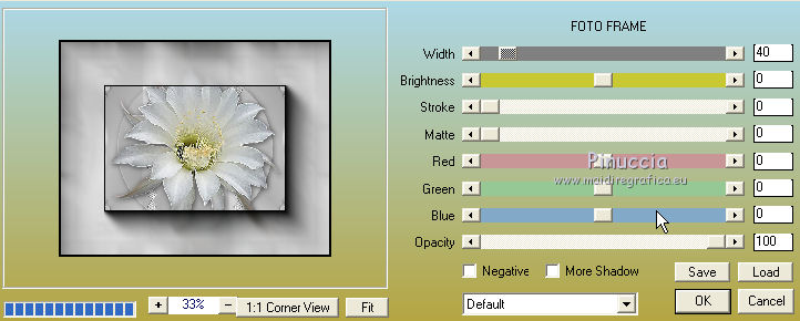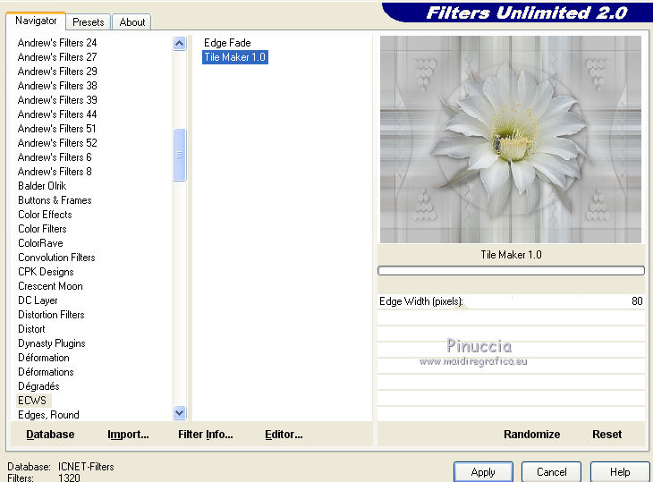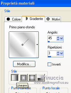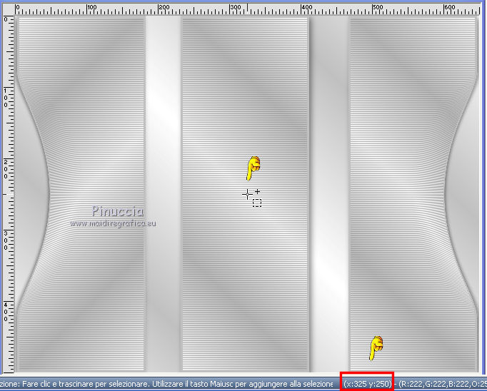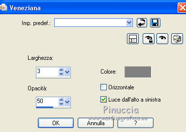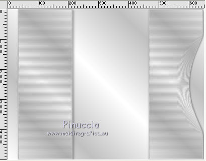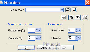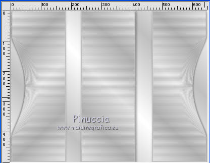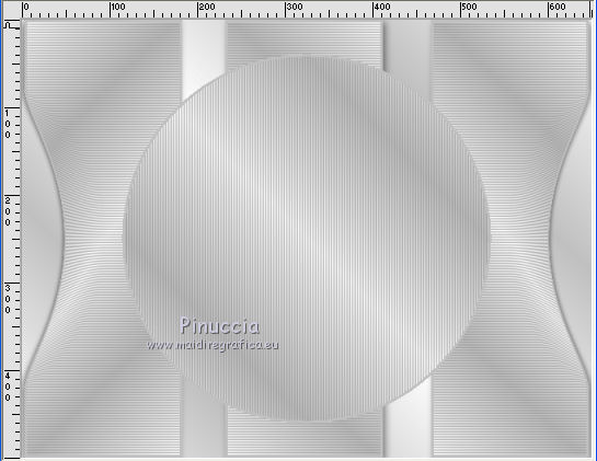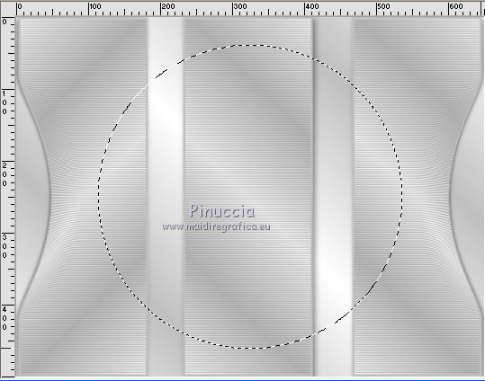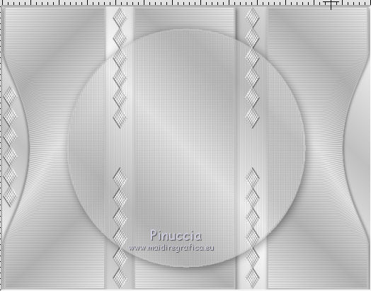 qui puoi trovare qualche risposta ai tuoi dubbi. Se l'argomento che ti interessa non è presente, ti prego di segnalarmelo. Per tradurre questo tutorial ho usato CorelX, ma può essere eseguito con ogni versione di PSP. Dalla versione X4, il comando Immagine>Rifletti è stato sostituito con Immagine>Capovolgi in orizzontale, e il comando Immagine>Capovolgi con Immagine>Capovolgi in verticale. Nelle versioni X5 e X6, le funzioni sono state migliorate rendendo disponibile il menu Oggetti. Con la nuova versione X7, sono tornati Rifletti/Capovolgi, ma con nuove differenze Vedi la scheda sull'argomento qui traduction en français qui Le vostre versioni qui Occorrente: Materiale qui Filtri in caso di dubbi, ricorda di consultare la mia sezione filtri qui AAA Frames - Foto Frame qui ECWS - Tile Maker 1.0 qui Filters Unlimited 2.0 qui I filtri ECWS si possono usare da soli o importati in Filters Unlimited (come fare vedi qui) Se un filtro fornito appare con questa icona ![]() se stai usando altri colori, sperimenta le modalità di miscelatura e opacità più adatte ai tuoi colori 1. Imposta il colore di primo piano con #ffffff, e il colore di sfondo con #c0c0c0. ![]() Passa il colore di primo piano a Gradiente di primo piano/sfondo, stile Lineare. ![]() 2. Apri una nuova immagine trasparente 650 x 500 pixels, e riempila con il gradiente.3. Livelli>Nuovo livello raster. Attiva lo strumento Selezione ![]() (non importa il tipo di selezione impostato, perchè con la selezione personalizzata si ottiene sempre un rettangolo) clicca sull'icona Selezione personalizzata ![]() e imposta i seguenti settaggi. ![]() Riempi la selezione con il colore di sfondo.4. Selezione>Modifica>Contrai - 3 pixels. Riempi con il gradiente.Mantieni selezionato. 5. Effetti>Effetti di trama>Veneziana, colore grigio scuro #808080. ![]() Selezione>Deseleziona. 6. Effetti>Effetti 3D>Sfalsa ombra, colore nero. ![]() 7. Livelli>Duplica, e rimani su questo livello. Effetti>Effetti di distorsione>Distorsione. ![]() 7. Sposta il livello a destra, contro il bordo.![]() 8. Livelli>Duplica. Immagine>Rifletti. 9. Attiva il livello Raster 2. ![]() Sposta il livello al centro.![]() 10. Attiva lo strumento Selezione , cerchio,e traccia un cerchio al centro dell'immagine. Per partire dal centro, punta il mouse alle coordinate X:325 Y:250 ![]() e traccia un cerchio pressappoco di queste dimensioni ![]() 11. Livelli>Nuovo livello raster. Livelli>Disponi>Porta in alto. Riempi con il colore grigio di sfondo.12. Selezione>Modifica>Contrai - 3 pixels. Riempi con il gradiente.Mantieni selezionato. 13. Effetti>Effetti di trama>Veneziana - colore grigio scuro #808080. ![]() Selezione>Deseleziona. 14. Se necessario, posiziona il cerchio al centro.![]() 15. Effetti>Effetti 3D>Sfalsa ombra, colore nero. ![]() Abbassa l'opacità di questo livello al 66%. 16. Apri il tube wit randje, e vai a Modifica>Copia. Torna al tuo lavoro e vai a Modifica>Incolla come nuovo livello. Spostalo sulla striscia a sinistra.![]() 17. Livelli>Duplica. Immagine>Rifletti. Livelli>Unisci>Unisci giù. 18. Livelli>Duplica. Immagine>Capovolgi. 19. Modifica>Incolla come nuovo livello (il tube wit randje è ancora in memoria). Spostalo a sinistra.![]() Livelli>Duplica. Immagine>Rifletti. 20. Apri il tube Cactusbloem, e vai a Modifica>Copia. Torna al tuo lavoro e vai a Modifica>Incolla come nuovo livello. Immagine>Ridimensiona, al 90%, tutti i livelli non selezionato. Spostalo al centro del cerchio.21. Effetti>Effetti 3D>Sfalsa ombra, colore nero. ![]() 22. Apri il tube Deco balletjes, e vai a Modifica>Copia. Torna al tuo lavoro e vai a Modifica>Incolla come nuovo livello. Spostalo dove preferisci o vedi il mio esempio.23. Effetti>Effetti 3D>Sfalsa ombra, colore nero. ![]() 24. Livelli>Duplica. Immagine>Rifletti. Livelli>Unisci>Unisci giù. 25. Livelli>Duplica. Immagine>Capovolgi. 26. Immagine>Aggiungi bordatura, 2 pixels, simmetriche, colore #808080. Immagine>Aggiungi bordatura, 40 pixels, simmetriche, colore #c0c0c0. Immagine>Aggiungi bordatura, 2 pixels, simmetriche, colore #808080. 27. Attiva lo strumento Bacchetta magica , sfumatura e tolleranza 0,e clicca nel bordo chiaro per selezionarlo. 28. Effetti>Plugins>ECWS - Tile Maker 1.0. ![]() 29. Effetti>Plugins>AAA Frames - Foto frame, con i settaggi standard. ![]() 30. Firma il tuo lavoro su un nuovo livello. Livelli>Unisci>Unisci tutto e salva in formato jpg. Il tube di questo esempio è di Kikirou ![]() ![]() Se hai problemi o dubbi, o trovi un link non funzionante, o anche soltanto per un saluto, scrivimi. 20 Giugno 2015 |