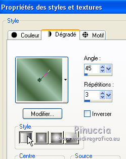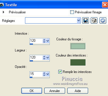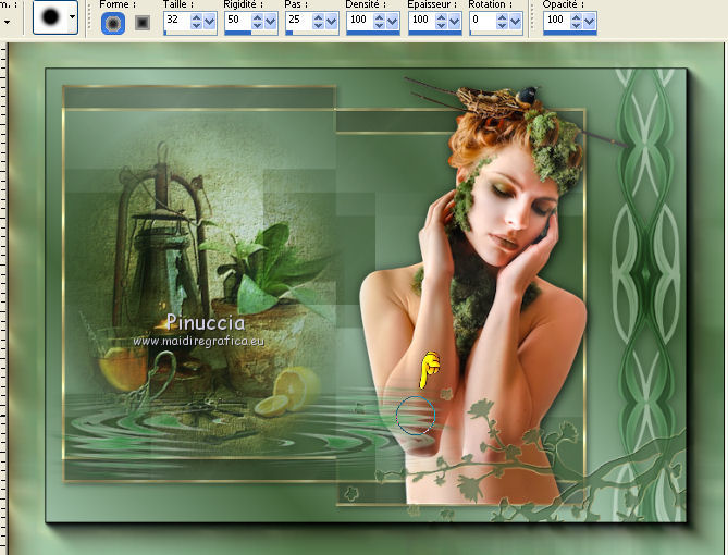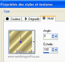 Pour traduire ce tutoriel j'ai utilisé Corel X2, mais il peut également être exécuté avec les autres versions. Suivant la version utilisée, vous pouvez obtenir des résultats différents. Depuis la version X4, la fonction Image>Miroir a été remplacée par Image>Renverser horizontalement, et Image>Renverser avec Image>Renverser verticalement. Dans les versions X5 et X6, les fonctions ont été améliorées par la mise à disposition du menu Objets. Dans la nouvelle version X7, nous avons à nouveau Miroir/Renverser, mais avec autres différences. Voir plus les détails à ce sujet ici Certaines dénominations ont changées entre les versions de PSP. Les plus frequentes dénominations utilisées: ![]() Traduction en italien ici Vos versions ici Nécessaire pour réaliser ce tutoriel: Matériel qui Les tubes sont de K@rine et Merydesigns. Modules Externes consulter, si nécessaire, ma section de filtre ici FM Tile Tools - Blend Emboss qui AAA Frames - Foto Frame qui DSB Flux - Linear Transmission qui ECWS - Tile Maker 1.0 qui Filters Unlimited 2.0 qui Filtres ECWS peuvent être utilisés seuls ou importés dans Filters Unlimited. voir comment le faire ici). Si un filtre est fourni avec cette icône, ![]() Si vous voulez utiliser vos propres couleurs, n'hésitez pas à changer le mode et l'opacité des calques 1. Placer en avant plan la couleur #a0c2a9, et en arrière plan la couleur #44643c. ![]() Préparer un dégradé de premier plan/arrière plan/style Linéaire. ![]() Préparer en arrière plan un motif or à choix. ![]() 2. Ouvrir une nouvelle image transparente 700 x 500 pixels Remplir l'image du dégradé.3. Calques>Dupliquer. Image>Redimensionner, à 80%, redimensionner tous les calques décoché. 4. Déplacer ce calque un peu plus à gauche.![]() 5. Effets>Effets de textures>Textile. couleur du tissage: couleur claire; couleur des interstices: couleur foncée. ![]() Réduire l'opacité de ce calque à 50%. 6. Sélections>Sélectionner tout. Sélections>Flottante. Sélections>Statique. 7. Calques>Nouveau calque raster. Remplir avec le motif or (touche droite de la souris).8. Sélections>Modifier>Contracter - 3 pixels. Presser CANC sur le clavier ![]() Sélections>Désélectionner tout. 9. Calques>Fusionner>Fusionner le calque de dessous. 10. Effets>Modules Externes>DSB Flux - Linear Transmission. ![]() 11. Sélections>Sélectionner tout. Sélections>Flottante. Sélections>Statique. 12. Calques>Nouveau calque raster. Rremplir avec le motif or.13. Sélections>Modifier>Contracter - 3 pixels. Presser 3-4 fois CANC sur le clavier, de façon que le calque or ne soit plus visible. Sélections>Désélectionner tout. 14. Réglage>Netteté>Netteté. Calques>Fusionner>Fusionner le calque de dessous. 15. Effets>Effets 3D>Ombre portée, couleur noire. ![]() 16. Activer le tube merydesign_divers195, Édition>Copier. Revenir sur votre travail et Édition>Coller comme nouveau calque. Image>Redimensionner, 2 fois à 80%, redimensionner tous les calques décoché. Déplacer le tube à gauche.Placer le calque en mode Lumière dure, et réduire l'opacité à 80%. 17. Effets>Modules Externes>FM Tile Tools - Blend Emboss, par défaut. ![]() 18. Activer le tube rand 13, Édition>Copier. Revenir sur votre travail et Édition>Coller comme nouveau calque. Déplacer le tube à droite.Pour mon exemple j'ai placé le calque en mode Lumière douce. 19. Effets>Effets 3D>Ombre portée, couleur noire. ![]() 20. Activer le tube K@rine_ dreams _Pretty_Woman1246_septembre_2010, Édition>Copier. Revenir sur votre travail et Édition>Coller comme nouveau calque. Image>Redimensionner, 2 fois à 70%, redimensionner tous les calques décoché. Réglage>Netteté>Netteté. Déplacer le tube à droite sur le bord or.21. Effets>Effets 3D>Ombre portée, couleur noire. optionnel, pour pouvoir ensuite supprimer l'ombre visible sous le tube: ombre sur un nouveau calque coché. ![]() Répéter Ombre portée, mais vertical et horizontal à -3. Sélectionner l'ombre sous le tube avec l'outil Sélection , rectangle,ou, si vous préférez, utiliser l'outil Gomme ,et effacer l'ombre sous le tube (ne pas oublier d'effacer l'ombre sur le deuxième calque). ![]() Résultat. ![]() 22. Activer le tube Deco-24, Édition>Copier. Revenir sur votre travail et Édition>Coller comme nouveau calque. Image>Redimensionner, 80%, redimensionner tous les calques décoché. Déplacer en bas à droite, un peu au dehors du bord.![]() Réduire l'opacité de ce calque à 60%. 23. Image>Ajouter des bordures, 2 pixels, symétrique, couleur foncée. 24. Calques>Nouveau calque raster. Sélections>Sélectionner tout. Remplir avec le motif or.25. Sélections>Modifier>Contracter - 2 pixels. Presser CANC sur le clavier. Sélections>Désélectionner tout. 26. Image>Ajouter des bordures, 30 pixels, symétrique, couleur claire. Activer l'outil Baguette magique ![]() et cliquer sur le bord clair pour le sélectionner. Remplir la sélection du dégradé.27. Effets>Modules Externes>ECWS - Tile Maker 1.0. ![]() Sélections>Désélectionner tout. 28. Image>Ajouter des bordures, 1 pixel, symétrique, couleur foncée. 29. Calques>Nouveau calque raster. Sélections>Sélectionner tout. Remplir avec le motif or.Sélections>Modifier>Contracter - 2 pixels. Presser CANC sur le clavier. 30. Calques>Fusionner>Fusionner le calque de dessous. Sélections>Désélectionner tout. 31. Effets>Modules Externes>AAA Frames - Foto Frame, par défaut. ![]() 32. Activer le tube deco 25, Édition>Copier. Revenir sur votre travail et Édition>Coller comme nouveau calque. Déplacer le tube en bas à gauche.33. Effets>Effets 3D>Ombre portée, couleur noire. ![]() 34. Activer l'outil Gomme , taille 32, rigidité 50et effacer la partie du tube qui déborde sur le tube de la femme. ![]() 35. Signer votre travail sur un nouveau calque. Calques>Fusionner>Tous et enregistrer en jpg. Le tube de cette version est de Celeste. ![]() ![]() Si vous avez des problèmes, ou des doutes, ou vous trouvez un l