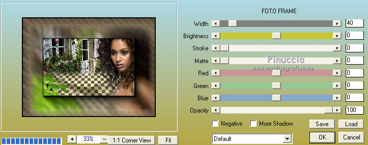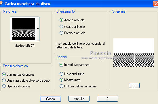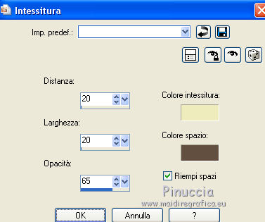 qui puoi trovare qualche risposta ai tuoi dubbi. Se l'argomento che ti interessa non è presente, ti prego di segnalarmelo. Per tradurre questo tutorial ho usato CorelX, ma può essere eseguito con ogni versione di PSP. Dalla versione X4, il comando Immagine>Rifletti è stato sostituito con Immagine>Capovolgi in orizzontale, e il comando Immagine>Capovolgi con Immagine>Capovolgi in verticale. Nelle versioni X5 e X6, le funzioni sono state migliorate rendendo disponibile il menu Oggetti. Con la nuova versione X7, sono tornati Rifletti/Capovolgi, ma con nuove differenze Vedi la scheda sull'argomento qui traduction en français qui Le vostre versioni qui Occorrente: Materiale qui Filtri in caso di dubbi, ricorda di consultare la mia sezione filtri qui FM Tile Tools - Blend Emboss qui AAA Frames - Foto Frame qui ![]() se stai usando altri colori, sperimenta le modalità di miscelatura e opacità più adatte ai tuoi colori Metti la maschera nella cartella maschere. 1. Imposta il colore di primo piano con #624f40, e il colore di sfondo con #eeebbd. ![]() 2. Apri una nuova immagine trasparente 700 x 500 pixels, e riempila con il colore di sfondo #eeebbd.3. Livelli>Carica/Salva maschera>Carica maschera da disco. Cerca e carica la maschera Masker-MB70. ![]() Livelli>Unisci>Unisci gruppo. 4. Livelli>Nuovo livello raster. Riempi con il colore scuro di primo piano.Livelli>Disponi>Porta sotto. 5. Attiva il livello della maschera. Attiva lo strumento Selezione ![]() (non importa il tipo di selezione impostato, perchè con la selezione personalizzata si ottiene sempre un rettangolo) clicca sull'icona Selezione personalizzata ![]() e imposta i seguenti settaggi. ![]() Premi sulla tastiera il tasto CANC .Selezione>Deseleziona. 6. Apri il tube 1541-luzcristina, e vai a Modifica>Copia. Torna al tuo lavoro e vai a Modifica>Incolla come nuovo livello. Spostalo in alto a sinistra.![]() 7. Apri il tube deco7, e vai a Modifica>Copia. Torna al tuo lavoro e vai a Modifica>Incolla come nuovo livello. Il livello è in modalità di miscelatura Luminanza (esistente), opacità 52. Spostalo in alto a sinistra contro il bordo,e contro il bordo inferiore. ![]() 8. Apri il tube blaetter-1-tube-17-7-08, e vai a Modifica>Copia. Torna al tuo lavoro e vai a Modifica>Incolla come nuovo livello. Spostalo in basso a sinistra, vedi il mio esempio.9. Effetti>Plugins>FM Tile Tools - Blend Emboss, con i settaggi standard. ![]() 10. Apri il tube Black-woman, e vai a Modifica>Copia. Torna al tuo lavoro e vai a Modifica>Incolla come nuovo livello. Immagine>Ridimensiona, all'80%, tutti i livelli non selezionato. Spostalo a destra.11. Effetti>Effetti 3D>Sfalsa ombra, colore nero. ![]() 12. Immagine>Aggiungi bordatura, 2 pixels, simmetriche, colore chiaro. Immagine>Aggiungi bordatura, 40 pixels, simmetriche, colore scuro. Immagine>Aggiungi bordatura, 2 pixels, simmetriche, colore chiaro. 13. Attiva lo strumento Bacchetta magica , sfumatura e tolleranza 0,e clicca nel bordo da 40 pixels per selezionarlo. 14. Effetti>Effetti di trama>Intessitura. colore intessitura: colore chiaro - colore spazio: colore scuro. ![]() Modifica>Ripeti Intessitura. 15. Effetti>Plugins>AAA Frames - Foto Frame, con i settaggi standard. ![]() Selezione>Deseleziona. 16. Firma il tuo lavoro su un nuovo livello. Livelli>Unisci>Unisci tutto e salva in formato jpg. I tubes di questo esempio sono di TalaNat e Daisy ![]() ![]() Se hai problemi o dubbi, o trovi un link non funzionante, o anche soltanto per un saluto, scrivimi. 20 Giugno 2015 |