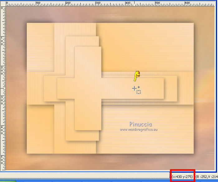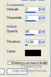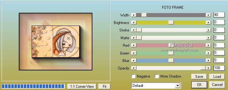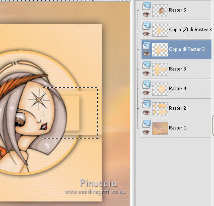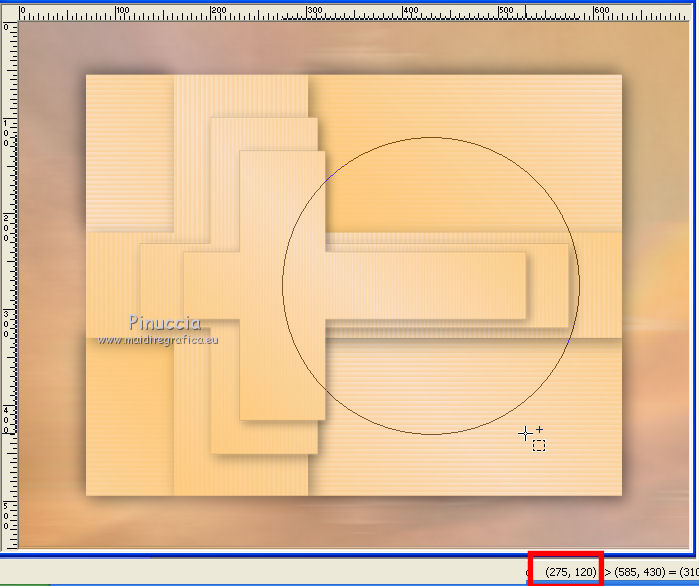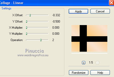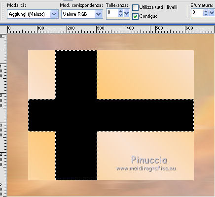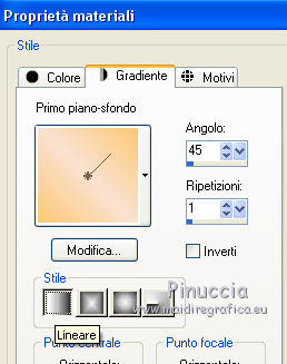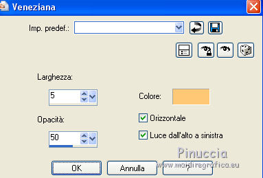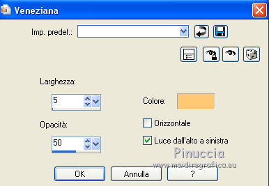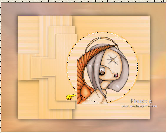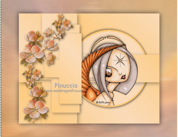 qui puoi trovare qualche risposta ai tuoi dubbi. Se l'argomento che ti interessa non è presente, ti prego di segnalarmelo. Per tradurre questo tutorial ho usato CorelX, ma può essere eseguito con ogni versione di PSP. Dalla versione X4, il comando Immagine>Rifletti è stato sostituito con Immagine>Capovolgi in orizzontale, e il comando Immagine>Capovolgi con Immagine>Capovolgi in verticale. Nelle versioni X5 e X6, le funzioni sono state migliorate rendendo disponibile il menu Oggetti. Con la nuova versione X7, sono tornati Rifletti/Capovolgi, ma con nuove differenze Vedi la scheda sull'argomento qui traduction en français qui Le vostre versioni qui Occorrente: Materiale qui Il tube è di MTM(Brigitte), ©Jeff Lyons Filtri in caso di dubbi, ricorda di consultare la mia sezione filtri qui AAA Frames - Foto Frame qui FM Tile Tools - Blend Emboss, Collage Linear qui ![]() se stai usando altri colori, sperimenta le modalità di miscelatura e opacità più adatte ai tuoi colori 1. Imposta il colore di primo piano con #fdc875, e il colore di sfondo con #f9e2d0. ![]() Passa il colore di primo piano a Gradiente di primo piano/sfondo, stile Lineare. ![]() 2. Apri una nuova immagine trasparente 700 x 550 pixels, e riempila con il gradiente.3. Selezione>Seleziona tutto. Livelli>Nuovo livello raster. 4. Apri l'immagine Autumn-34, e vai a Modifica>Copia. Torna al tuo lavoro e vai a Modifica>Incolla nella selezione. Selezione>Deseleziona. Abbassa l'opacità di questo livello al 33%. 5. Effetti>Effetti di distorsione>Vento - da destra, intensità 100. ![]() Ripeti l'Effetto Vento questa volta da sinistra. ![]() 6. Livelli>Unisci>Unisci giù. 7. Livelli>Nuovo livello raster. Riempi con il gradiente.Immagine>Ridimensiona, all'80%, tutti i livelli non selezionato. 8. Effetti>Plugins>FM Tile Tools - Collage Linear. ![]() 9. Attiva lo strumento Bacchetta magica , sfumatura e tolleranza 0,e clicca nella parte nera per selezionarla. ![]() Premi sulla tastiera il tasto CANC ![]() 10. Livelli>Nuovo livello raster. Riempi la selezione con il gradiente.11. Effetti>Effetti di trama>Veneziana, colore di primo piano #fdc875. ![]() Selezione>Deseleziona. 12. Attiva il livello sottostante Raster 2. ![]() 13. Effetti>Effetti di trama>Veneziana, colore di primo piano #fdc875. ![]() 14. Effetti>Effetti 3D>Sfalsa ombra, colore nero. ![]() Ripeti l'Effetto Sfalsa ombra, cambiando verticale e orizzontale con -5. 15. Attiva il livello superiore. Effetti>Effetti 3D>Sfalsa ombra, colore nero. ![]() 16. Livelli>Duplica. Immagine>Ridimensiona, all'80%, tutti i livelli non selezionato. 17. Di nuovo Livelli>Duplica. Immagine>Ridimensiona, all'80%, tutti i livelli non selezionato. 18. Livelli>Nuovo livello raster. Attiva lo strumento Selezione , cerchio![]() 19. Posiziona il mouse alle coordinate X: 430 Y:275 ![]() e traccia un cerchio a circa X:275 Y:120 ![]() 20. Riporta il colore di primo piano a Colore. Riempi il cerchio con il colore di primo piano.21. Selezione>Modifica>Contrai - 6 pixels. Riempi con il colore chiaro di sfondo.22. Effetti>Effetti di trama>Veneziana, con i settaggi precedenti. ![]() Mantieni selezionato. 23. Livelli>Nuovo livello raster. Apri il tube Mtm_Girlie_72_gjg_Seye.-klein-tube. Immagine>Ridimensiona, al 95%, tutti i livelli non selezionato. Modifica>Copia. Torna al tuo lavoro e vai a Modifica>Incolla come nuovo livello. 24. Posiziona il tube nella selezione,il bordo a sinistra contro l'ultima linea verticale. ![]() 25. Selezione>Inverti. Premi sulla tastiera il tasto CANC. Selezione>Deseleziona. 26. Attiva il livello del cerchio. Livelli>Disponi>Sposta giù - 3 volte. ![]() 27. Effetti>Effetti 3D>Sfalsa ombra, colore nero. ![]() Ripeti l'Effetto Sfalsa ombra, cambiando verticale e orizzontale con -3. 28. Attiva il livello superiore. Effetti>Effetti 3D>Sfalsa ombra, colore nero. ![]() 29. Attiva il livello copia di Raster 3. Attiva lo strumento Selezione , rettangolo,e seleziona la parte esterna del rettangolo, compresa l'ombra. ![]() Premi sulla tastiera il tasto CANC. Selezione>Deseleziona. 30. Attiva il livello superiore. Apri il tube Bloem-1, e vai a Modifica>Copia. Torna al tuo lavoro e vai a Modifica>Incolla come nuovo livello. Spostalo a sinistra.![]() 31. Effetti>Effetti 3D>Sfalsa ombra, con i settaggi precedenti. 32. Effetti>Plugins>FM Tile Tools, con i settaggi standard. ![]() 33. Apri il tube Bloempje-2, e vai a Modifica>Copia. Torna al tuo lavoro e vai a Modifica>Incolla come nuovo livello. Spostalo in basso a destra, come nel mio esempio.34. Effetti>Plugins>FM Tile Tools - Blend Emboss, con i settaggi standard. 35. Apri il tube Balletjes, e vai a Modifica>Copia. Torna al tuo lavoro e vai a Modifica>Incolla come nuovo livello. Spostalo a sinistra - vedi il mio esempio.36. Livelli>Unisci>Unisci tutto. 37. Effetti>Plugins>AAA Frames - Foto Frame, con i settaggi standard. ![]() 38. Firma il tuo lavoro su un nuovo livello. Salva in formato jpg. ![]() Se hai problemi o dubbi, o trovi un link non funzionante, o anche soltanto per un saluto, scrivimi. 20 Giugno 2015 |