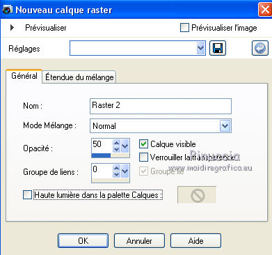 7. Calques>Nouveau calque raster et profiter de la fenêtre qui s'ouvre pour réduire l'opacité à 50