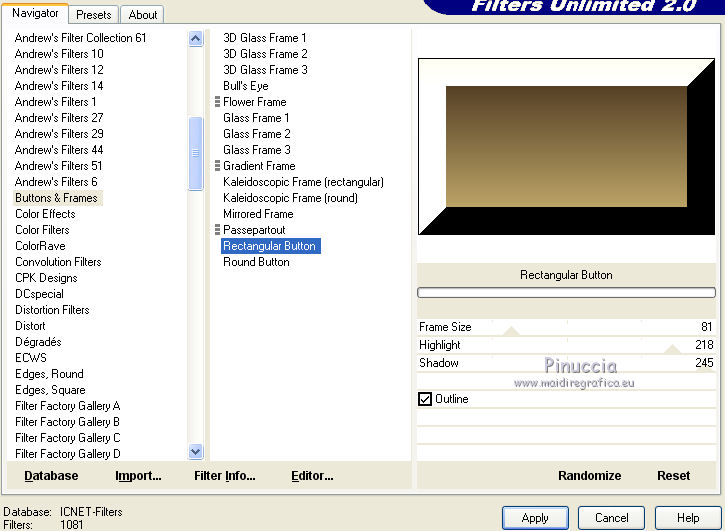 12. Effetti>Plugins>Filters Unlimited 2.0 - Buttons & Frames - Rectangular Button.