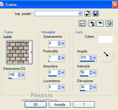 13. Effetti>Effetti di trama>Trama - seleziona la trama Ladrilho con i seguenti settaggi: