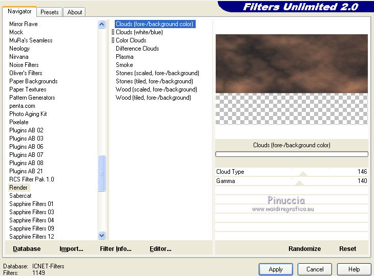 21. Effets>Modules Externes>Filters Unlimited 2.0 - Render - Cloud (fore-background color).