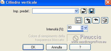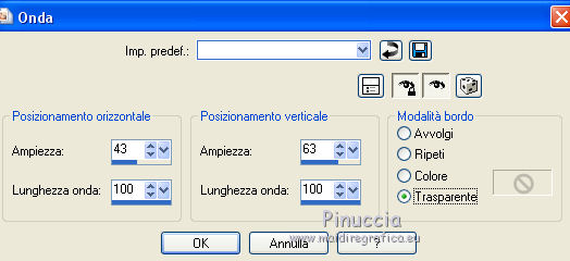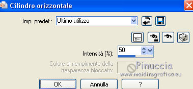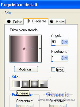 qui puoi trovare qualche risposta ai tuoi dubbi. Se l'argomento che ti interessa non è presente, ti prego di segnalarmelo. Questo tutorial è stato tradotto con CorelX7 e CorelX2, ma può essere realizzato anche con le altre versioni di PSP. Dalla versione X4, il comando Immagine>Rifletti è stato sostituito con Immagine>Capovolgi in orizzontale, e il comando Immagine>Capovolgi con Immagine>Capovolgi in verticale. Nelle versioni X5 e X6, le funzioni sono state migliorate rendendo disponibile il menu Oggetti. Con la nuova versione X7, sono tornati Rifletti>Capovolgi, ma con nuove varianti. Vedi la scheda sull'argomento qui traduzione in francese/traduction en français qui/ici Versioni/Versions quiOccorrente: Materiale qui Per i tubes grazie DWorisch e Nikita. Il deco è di Mineko. (in questa pagina trovi i links ai siti dei creatori di tubes) Filtri: se hai problemi con i filtri, consulta la mia sezione filtri qui Filters Unlimited 2.0 qui Filter Factory Gallery M - Faceter qui VM Texture - Stardust qui Graphics Plus - Button Beveler II qui Mock - Bevel qui I filtri Factory Gallery, VM Texture, Graphics plus e Mocks si possono usare da soli o importati in Filters Unlimited (come fare vedi qui) Se un filtro fornito appare con questa icona ![]() non esitare a cambiare modalità di miscelatura e opacità secondo i colori utilizzati. Nelle ultime versioni di PSP non c'è il gradiente di primo piano/sfondo (Corel_06_029) Puoi usare i gradienti delle versioni precedenti. Trovi qui i gradienti Corel X. 1. Apri una nuova immagine trasparente 850 x 600 pixels. Imposta il colore di primo piano con il colore scuro #4c2128, e il colore di sfondo con il colore chiaro #ffe1e6. ![]() Passa il colore di primo piano a Gradiente di primo piano/sfondo, stile Lineare. ![]() Riempi l'immagine trasparente con il gradiente.2. Effetti>Plugins>Filters Unlimited 2.0 - Graphics Plus - Button Beveler II. ![]() Effetti>Effetti di bordo>Aumenta. 3. Selezione>Seleziona tutto. Selezione>Modifica>Contrai - 55 pixels. Premi sulla tastiera il tasto CANC ![]() Selezione>Deseleziona. 4. Livelli>Duplica. Effetti>Effetti geometrici>Cilindro orizzontale. ![]() 5. Effetti>Effetti geometrici>Cilindro verticale. ![]() 6. Effetti>Effetti di distorsione>Onda. ![]() 7. Attiva lo strumento Bacchetta magica ![]() ![]() Clicca nella parte centrale per selezionarla. ![]() Livelli>Nuovo livello raster. Abbassa l'opacità dello strumento Riempimento a 50%. Riempi la selezione con il gradiente.Selezione>Deseleziona. Riporta l'opacità dello strumento Riempimento a 100. 8. Effetti>Plugins>Filters Unlimited 2.0 - Filter Factory Gallery M - Faceter. ![]() Livelli>Unisci>Unisci giù. 9. Livelli>Nuovo livello raster. Livelli>Disponi>Sposta giù. Riempi il livello con il gradiente.10. Apri il tube del fiore di Nikita e vai a Modifica>Copia. Torna al tuo lavoro e vai a Modifica>Incolla come nuovo livello. Spostalo in basso a sinistra, come nel mio esempio.Livelli>Unisci>Unisci giù. 11. Attiva il livello superiore. Livelli>Unisci>Unisci giù. 12. Effetti>Plugins>Filters Unlimited 2.0 - Mock - Bevel. ![]() 13. Immagine>Ridimensiona, all'84%, tutti i livelli non selezionato. Attiva lo strumento Puntatore ,