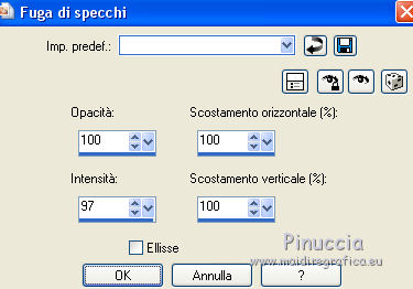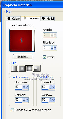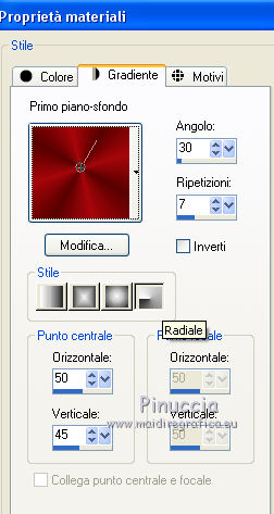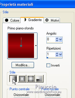qui puoi trovare qualche risposta ai tuoi dubbi. Se l'argomento che ti interessa non è presente, ti prego di segnalarmelo. Questo tutorial è stato tradotto con CorelX7 e CorelX2, ma può essere realizzato anche con le altre versioni di PSP. Dalla versione X4, il comando Immagine>Rifletti è stato sostituito con Immagine>Capovolgi in orizzontale, e il comando Immagine>Capovolgi con Immagine>Capovolgi in verticale. Nelle versioni X5 e X6, le funzioni sono state migliorate rendendo disponibile il menu Oggetti. Con la nuova versione X7, sono tornati Rifletti>Capovolgi, ma con nuove varianti. Vedi la scheda sull'argomento qui traduzione in francese/traduction en français qui/ici Versioni/Versions quiOccorrente: Materiale qui Per il tube grazie Beatriz (2393-Woman-LB TUBES) (in questa pagina trovi i links ai siti dei creatori di tubes) Filtri: se hai problemi con i filtri, consulta la mia sezione filtri qui Filters Unlimited 2.0 qui &<Bkg Designer sf10I> - Kaleidoscope 8 (da importare in Unlimited) ici Flaming Pear - Flexify 2 ici Mehdi - Kaleidoscope 2.1 ici FM Tile Tools - Blend Emboss ici ![]() non esitare a cambiare modalità di miscelatura e opacità secondo i colori utilizzati. Nelle ultime versioni di PSP non c'è il gradiente di primo piano/sfondo (Corel_06_029) Puoi usare i gradienti delle versioni precedenti. Trovi qui i gradienti Corel X. 1. Apri una nuova immagine trasparente 700 x 600 pixels Imposta il colore di primo piano con il colore scuro #580100, e il colore di sfondo con il colore chiaro #a6070c. ![]() Passa il colore di primo piano a Gradiente di primo piano/sfondo, stile Radiale. ![]() Riempi l'immagine trasparente con il gradiente.2. Effetti>Effetti di riflesso>Fuga di specchi. ![]() Effetti>Effetti di bordo>Aumenta. 3. Effetti>Plugins>Flaming Pear - Flexify ![]() 4. Effetti>Plugins>FM Tile Tools - Blend Emboss, con i settaggi standard. ![]() 5. Livelli>Duplica. Immagine>Ridimensiona, al 50%, tutti i livelli non selezionato. 6. Effetti>Plugins>Filters Unlimited 2.0 - &<Bkg Kaleidoscope> - Kaleidoscope 8. ![]() Immagine>Ridimensiona, al 50%, tutti i livelli non selezionato. 7. Effetti>Effetti 3D>Sfalsa ombra, colore #000000. ![]() Ripeti l'Effetto Sfalsa ombra verticale -2. ![]() 8. Regola>Messa a fuoco>Metti a fuoco. 9. Effetti>Effetti di immagine>Scostamento. ![]() 10. Livelli>Duplica. Abbassa l'opacità di questo livello al 50%. Livelli>Unisci>Unisci giù. 11. Attiva il livello Raster 1. Attiva lo strumento Bachetta magica , sfumatura e tolleranza 0,e clicca nel cerchio trasparente per selezionarlo. ![]() Selezione>Modifica>Espandi - 2 pixels. 12. Livelli>Nuovo livello raster. Cambia i settaggi del gradiente, stile Sprazzo di luce ![]() Riempi il livello con il gradiente.Selezione>Deseleziona. Effetti>Effetti 3D>Sfalsa ombra, colore #000000. ![]() Ripeti l'Effetto Sfalsa ombra, verticale e orizzontale -2. 13. Apri il tube della donna 2393-Woman-LB TUBES e vai a Modifica>Copia. Torna al tuo lavoro e vai a Modifica>Incolla come nuovo livello. Immagine>Ridimensiona, al 90%, tutti i livelli non selezionato. Sposta il tube a destra.Effetti>Effetti 3D>Sfalsa ombra, colore #000000. ![]() 14. Immagine>Aggiungi bordatura, 5 pixels, simmetriche, colore scuro. Immagine>Aggiungi bordatura, 35 pixels,simmetriche, colore bianco. Attiva lo strumento Bachetta magica , sfumatura e tolleranza 0,e clicca nel bordo bianco per selezionarlo. Cambia ancora i settaggi del gradiente, stile Lineare. ![]() Riempi la selezione con il gradiente.Mantieni selezionato. 15. Effetti>Plugins>Mehdi - Kaleidoscope 2.1. ![]() 16. Effetti>Effetti 3D>Smusso a incasso. ![]() Effetti>Effetti di bordo>Aumenta. 17. Immagine>Aggiungi bordatura, 3 pixels, simmetriche, colore #580100. Firma il tuo lavoro e salva in formato jpg. Altre versioni con tubes di Luz Cristina. ![]() ![]() Puoi scrivermi se hai problemi o dubbi, o trovi un link che non funziona, o soltanto per un saluto. 12 Febbraio 2021 |