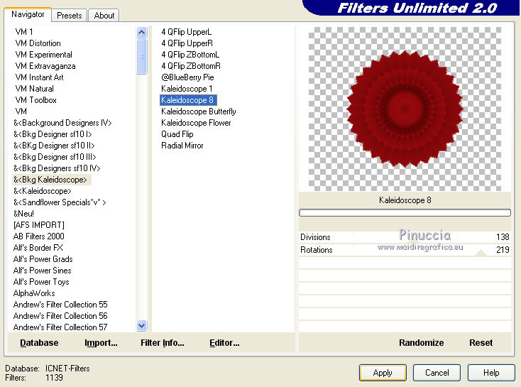 6. Effets>Modules Externes>Filters Unlimited 2.0 - &<Bkg Kaleidoscope> - Kaleidoscope 8.