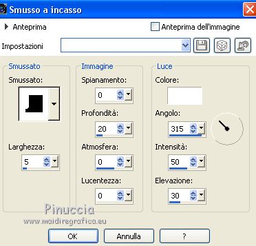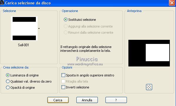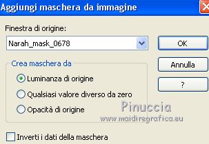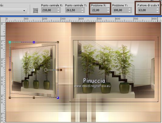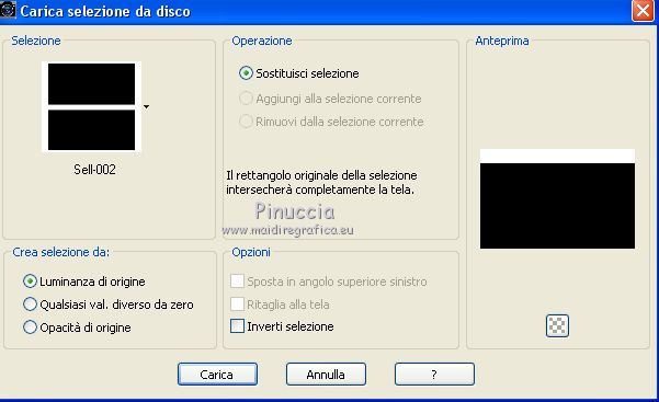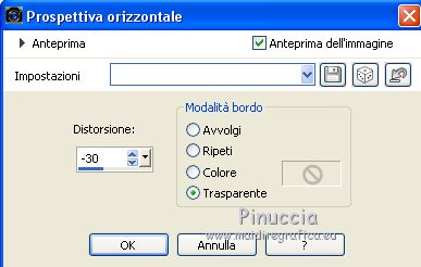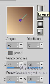 qui puoi trovare qualche risposta ai tuoi dubbi. Se l'argomento che ti interessa non è presente, ti prego di segnalarmelo. Questo tutorial è stato tradotto con CorelX7 e CorelX2, ma può essere realizzato anche con le altre versioni di PSP. Dalla versione X4, il comando Immagine>Rifletti è stato sostituito con Immagine>Capovolgi in orizzontale, e il comando Immagine>Capovolgi con Immagine>Capovolgi in verticale. Nelle versioni X5 e X6, le funzioni sono state migliorate rendendo disponibile il menu Oggetti. Con la nuova versione X7, sono tornati Rifletti>Capovolgi, ma con nuove varianti. Vedi la scheda sull'argomento qui traduzione in francese/traduction en français qui/ici Versioni/Versions quiOccorrente: Materiale qui Grazie: per i tubes Luz Cristina (3362-luzcristina) e Créaline (woman_5_bycrealine_21072011), e per la maschera Narah (Narah_mask_0678) (in questa pagina trovi i links ai siti dei creatori di tubes) Filtri: se hai problemi con i filtri, consulta la mia sezione filtri qui Filters Unlimited 2.0 qui VM Extravaganza - Holidays in Egypt qui VM - Lightsplash (da importare in Unlimited) qui Mehdi - Weaver qui Sapphire Innovation v1.5 - SilverLining qui nella lista dei filtri trovi l'effetto sotto la lettera I "innovations v1.5" I filtri VM Extravaganza si possono usare da soli o importati in Filters Unlimited (come fare vedi qui) Se un filtro fornito appare con questa icona ![]() non esitare a cambiare modalità di miscelatura e opacità secondo i colori utilizzati. Nelle ultime versioni di PSP non c'è il gradiente di primo piano/sfondo (Corel_06_029) Puoi usare i gradienti delle versioni precedenti. Trovi qui i gradienti Corel X. Metti le selezioni nella cartella Selezioni. Apri la maschera in PSP e minimizzala con il resto del materiale. 1. Apri una nuova immagine trasparente 850 x 550 pixels Imposta il colore di primo piano con il colore chiaro #ffdfad, e il colore di sfondo con il colore scuro #583326. ![]() Passa il colore di primo piano a Gradiente di primo piano/sfondo, stile Lineare. ![]() Riempi l'immagine trasparente con il gradiente.2. Effetti>Plugins>Filters Unlimited 2.0 - VM Extravaganza - Holidays in Egypt... ![]() Effetti>Effetti di bordo>Aumenta. 3. Effetti>Effetti di riflesso>Specchio rotante, con i settaggi standard. ![]() 4. Effetti>Plugins>Filters Unlimited 2.0 - VM - Lightsplash... ![]() Effetti>Effetti di bordo>Aumenta. 5. Effetti>Plugins>Mehdi - Weaver ![]() 6. Effetti>Effetti di riflesso>Specchio rotante, con i settaggi standard. ![]() 7. Selezione>Carica/Salva selezione>Carica selezione da disco. Cerca e carica la selezione sell_01 ![]() Selezione>Innalza selezione a livello. Selezione>Modifica>Contrai - 20 pixels. Premi sulla tastiera il tasto CANC ![]() Selezione>Deseleziona. 8. Effetti>Effetti 3D>Smusso a incasso. ![]() 9. Attiva lo strumento Bacchetta magica ![]() e clicca nella cornice per selezionarla. ![]() 10. Apri il tube 3362-luzcristina e vai a Modifica>Copia. Torna al tuo lavoro e vai a Modifica>Incolla come nuovo livello. Posiziona il tube sulla cornice.![]() Selezione>Inverti. Premi sulla tastiera il tasto CANC. Selezione>Deseleziona. Livelli>Unisci>Unisci giù. 11. Livelli>Duplica. Immagine>Rifletti. 12. Effetti>Effetti geometrici>Prospettiva orizzontale. ![]() 13. Attiva lo strumento Puntatore ![]() e imposta Posizione X: 22,00 e Fattore di Scala X: 63,00 ![]() 14. Su questo livello, copia di Selezione innalzata: Effetti>Effetti 3D>Sfalsa ombra, colore #000000 ![]() 15. Attiva il livello sottostante, Selezione innalzata. Effetti>Effetti 3D>Sfalsa ombra, colore #000000. ![]() 16. Attiva il livello Raster 1. Selezione>Carica/Salva selezione>Carica selezione da disco. Cerca e carica la selezione sell_02 ![]() Selezione>Innalza selezione a livello. Mantieni selezionato. 17. Effetti>Plugins>Innovation V1.5 - SilverLining ![]() Selezione>Deseleziona. 18. Effetti>Effetti 3D>Sfalsa ombra, colore #000000. ![]() 19. Attiva nuovamente il livello Raster 1. Livelli>Nuovo livello raster. Riempi il livello con il colore bianco(per il mio esempio ho usato il colore chiaro di primo piano; nella versione sotto il tutorial ho usato il colore bianco). 20. Livelli>Nuovo livello maschera>Da immagine. Apri il menu sotto la finestra di origine e vedrai la lista dei files aperti. Seleziona la maschera Narah_mask_0678 ![]() Livelli>Unisci>Unisci gruppo. 21. Effetti>Effetti 3D>Sfalsa ombra, colore #000000. ![]() Livelli>Unisci>Unisci visibile. 22. Apri il tube della donna e vai a Modifica>Copia. Torna al tuo lavoro e vai a Modifica>Incolla come nuovo livello. Immagine>Ridimensiona, all'80%, tutti i livelli non selezionato. Sposta il tube a destra.Effetti>Effetti 3D>Sfalsa ombra, colore #000000. ![]() 23. Immagine>Aggiungi bordatura, 2 pixels, simmetriche, colore scuro #583326. Immagine>Aggiungi bordatura, 30 pixels, simmetriche, colore #ffffff. Immagine>Aggiungi bordatura, 2 pixel, simmetriche, colore scuro #583326. Firma il tuo lavoro e salva in formato jpg. Versione con tubes di Gabry ![]() ![]() Puoi scrivermi se hai problemi o dubbi, o trovi un link che non funziona, o soltanto per un saluto. 14 Gennaio 2021 |