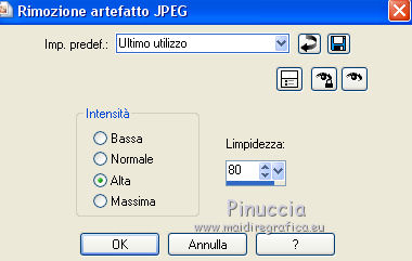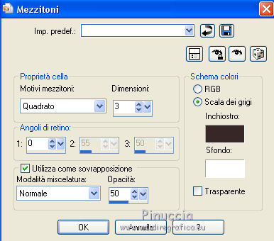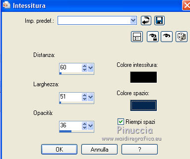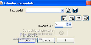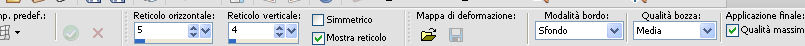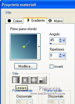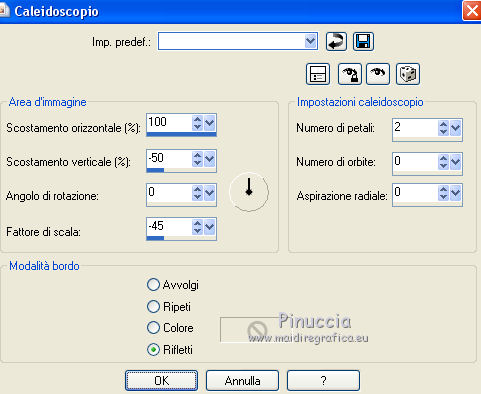 qui puoi trovare qualche risposta ai tuoi dubbi. Se l'argomento che ti interessa non è presente, ti prego di segnalarmelo. Questo tutorial è stato tradotto con CorelX7 e CorelX2, ma può essere realizzato anche con le altre versioni di PSP. Dalla versione X4, il comando Immagine>Rifletti è stato sostituito con Immagine>Capovolgi in orizzontale, e il comando Immagine>Capovolgi con Immagine>Capovolgi in verticale. Nelle versioni X5 e X6, le funzioni sono state migliorate rendendo disponibile il menu Oggetti. Con la nuova versione X7, sono tornati Rifletti>Capovolgi, ma con nuove varianti. Vedi la scheda sull'argomento qui traduzione in francese/traduction en français qui/iciVersioni/Versions qui Occorrente: Materiale qui Per i tubes grazie Guismo e Grisi. (in questa pagina trovi i links ai siti dei creatori di tubes) Filtri: se hai problemi con i filtri, consulta la mia sezione filtri qui Filters Unlimited 2.0 qui VM Distortion - Tiles a Gogo qui Carolaine and Sensibility - CS-LDots qui DSB Flux - Linear Transmission qui Mura's Meister - Perspective Tiling qui I filtri VM Distortion si possono usare da soli o importati in Filters Unlimited (come fare vedi qui) Se un filtro fornito appare con questa icona ![]() non esitare a cambiare modalità di miscelatura e opacità secondo i colori utilizzati. Nelle ultime versioni di PSP non c'è il gradiente di primo piano/sfondo (Corel_06_029) Puoi usare i gradienti delle versioni precedenti. Trovi qui i gradienti Corel X. 1. Apri una nuova immagine trasparente 1000 x 700 pixels. 2. Imposta il colore di primo piano con il colore chiaro #8bc7cd, e il colore di sfondo con il colore scuro #05284e. ![]() Passa il colore di primo piano a Gradiente di primo piano/sfondo, stile Lineare. ![]() Riempi l'immagine trasparente con il gradiente.2. Effetti>Plugins>AAA Frames - Foto Frame, con i settaggi standard. ![]() 3. Selezione>Seleziona tutto. Selezione>Modifica>Contrai - 55 pixels. Premi sulla tastiera il tasto CANC ![]() Selezione>Deseleziona. 4. Effetti>Effetti geometrici>Cilindro orizzontale. ![]() 5. Effetti>Effetti geometrici>Cilindro verticale. ![]() 6. Immagine>Ridimensiona, all'80%, tutti i livelli non selezionato. 7. Effetti>Effetti di riflesso>Caleidoscopio. ![]() 8. Attiva lo strumento Bacchetta magica ![]() e clicca nel rettangolo centrale per selezionarlo ![]() 9. Livelli>Nuovo livello raster. Abbassa l'opacità dello strumento Riempimento a 50, e riempi il livello con il gradiente.10. Effetti>Effetti artistici>Mezzitoni. ![]() Selezione>Deseleziona. Livelli>Unisci>Unisci visibile. 11. Livelli>Nuovo livello raster. Livelli>Disponi>Porta sotto. Riporta l'opacità dello strumento Riempimento a 100. Riempi il livello con il gradiente.Attiva il livello superiore, Uniti. Livelli>Duplica. 12. Effetti>Effetti di riflesso>Caleidoscopio. ![]() 13. Effetti>Effetti geometrici>Inclina. ![]() Livelli>Unisci>Unisci giù. 14. Livelli>Nuovo livello raster. Selezione>Seleziona tutto. Apri il tube del paesaggio, cancella il watermark, e vai a Modifica>Copia. Torna al tuo lavoro e vai a Modifica>Incolla nella selezione. Selezione>Deseleziona. Livelli>Disponi>Sposta giù. 15. Attiva il livello Uniti. Attiva lo strumento Puntatore ![]() in modalità Scala ![]() (se non visualizzi i righelli, vai a Visualizza>Righelli) e spingi il nodo superiore centrale verso il basso fino a 615 pixels. ![]() 16. Effetti>Effetti 3D>Sfalsa ombra, colore #000000. ![]() 17. Attiva lo strumento Distorsione con reticolo con i seguenti settaggi:![]() Spingi verso l'alto il nodo centrale fino a 570 pixels. ![]() Risultato ![]() 18. Attiva il livello Raster 1. Selezione personalizzata ![]() ![]() Selezione>Innalza seleziona a livello. Selezione>Deseleziona. 19. Effetti>Effetti 3D>Sfalsa ombra, colore #179c9f. ![]() Livelli>Disponi>Sposta su. 20. Selezione personalizzata , con i settaggi precedenti.![]() Livelli>Nuovo livello raster. Riempi il livello con il gradiente.21. Effetti>Effetti di trama>Intessitura. Colore intessitura #000000 - colore spazio #05284e. ![]() Effetti>Effetti di bordo>Aumenta. Selezione>Deseleziona. 22. Effetti>Plugins>Mura's Meister - Perspective Tiling. ![]() 23. Immagine>Aggiungi bordatura, 10 pixels, simmetriche, colore scuro #05284e. Immagine>Aggiungi bordatura, 30 pixels, simmetriche, colore bianco. Attiva lo strumento Bacchetta magica ![]() e clicca nel bordo bianco per selezionarlo. 24. Cambia i settaggi del gradiente ![]() Riempi la selezione con il gradiente.25. Regola>Aggiungi/Rimuovi disturbo>Rimozione artefatto JPEG ![]() 26. Immagine>Aggiungi bordatura, 5 pixels, simmetriche, colore #000000. 27. Apri il tube della donna e vai a Modifica>Copia. Torna al tuo lavoro e vai a Modifica>Incolla come nuovo livello. Ridimensiona e posiziona a tuo piacimento. Effetti>Effetti 3D>Sfalsa ombra, colore #000000. ![]() Decora il lavoro a tuo piacimento. 28. Firma il tuo lavoro su un nuovo livello. Livelli>Unisci>Unisci tutto e salva in formato jpg. Versione con tubes di Valy e Thafs ![]() ![]() Puoi scrivermi se hai problemi o dubbi, o trovi un link che non funziona, o soltanto per un saluto. 5 Luglio 2019 |
