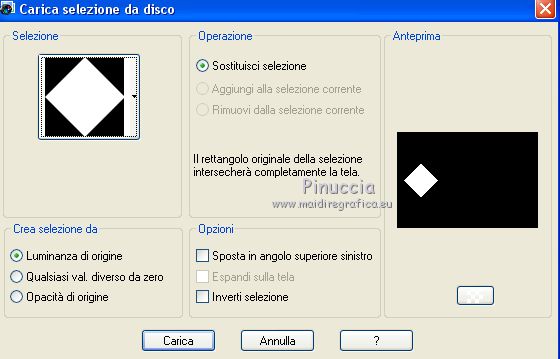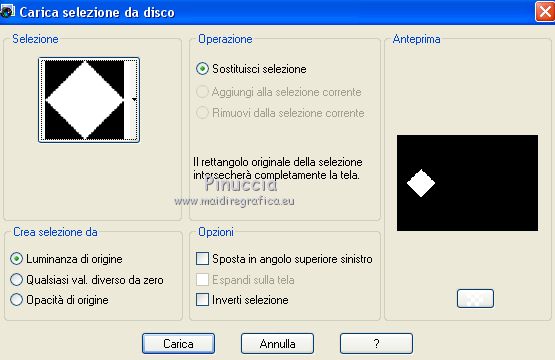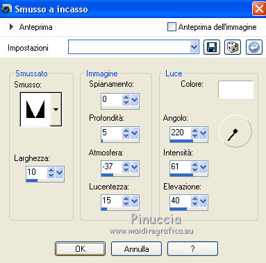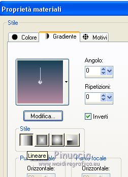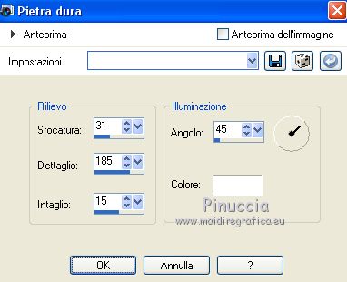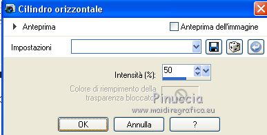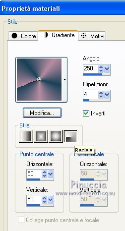 qui puoi trovare qualche risposta ai tuoi dubbi. Se l'argomento che ti interessa non è presente, ti prego di segnalarmelo. Questo tutorial è stato tradotto con CorelX7 e CorelX2, ma può essere realizzato anche con le altre versioni di PSP. Dalla versione X4, il comando Immagine>Rifletti è stato sostituito con Immagine>Capovolgi in orizzontale, e il comando Immagine>Capovolgi con Immagine>Capovolgi in verticale. Nelle versioni X5 e X6, le funzioni sono state migliorate rendendo disponibile il menu Oggetti. Con la nuova versione X7, sono tornati Rifletti>Capovolgi, ma con nuove varianti. Vedi la scheda sull'argomento qui traduzione in francese/traduction en français qui/ici Versioni/Versions quiOccorrente: Materiale qui Per i tubes grazie Gabry e Luz Cristina. (in questa pagina trovi i links ai siti dei creatori di tubes) Filtri: se hai problemi con i filtri, consulta la mia sezione filtri qui Filters Unlimited 2.0 qui Filter Factory Gallery G - Bevel 1.5 qui Toadies - Blast'em qui AP16 [Power Blend] - Distort-GridEdge - nel materiale Sapphire Innovation v1.5 - SilverLining qui nella lista dei filtri trovi l'effetto sotto la lettera I "innovations v1.5 VanDerLee - Unplugged-X qui Mura's Meister - Copies qui I filtri Factory Gallery e Toadies si possono usare da soli o importati in Filters Unlimited (come fare vedi qui) Se un filtro fornito appare con questa icona ![]() non esitare a cambiare modalità di miscelatura e opacità secondo i colori utilizzati. Nelle ultime versioni di PSP non c'è il gradiente di primo piano/sfondo (Corel_06_029) Puoi usare i gradienti delle versioni precedenti. Trovi qui i gradienti Corel X. Metti le selezioni nella cartella Selezioni. 1. Apri una nuova immagine trasparente 950 x 650 pixels. Imposta il colore di primo piano con il colore scuro #194157, e il colore di sfondo con il colore chiaro #b68ba0. ![]() Passa il colore di primo piano a Gradiente di primo piano/sfondo, stile Radiale. ![]() Riempi l'immagine trasparente con il gradiente.2. Selezione>Seleziona tutto. Apri il tube 5400-luzcristina e vai a Modifica>Copia. Torna al tuo lavoro e vai a Modifica>Incolla nella selezione. Selezione>Deseleziona. 3. Effetti>Effetti di immagine>Motivo unico, con i settaggi standard. ![]() 4. Regola>Sfocatura>Sfocatura gaussiana - raggio 32. ![]() 5. Effetti>Plugins>Toadies - Blast'em!... ![]() 6. AP16 [Power Blend] - Distort-GridEdge, con i settaggi standard. ![]() Effetti>Effetti di bordo>Aumenta. Livelli>Duplica. 7. Effetti>Plugins>Filters Unlimited 2.0 - Filter Factory Gallery G - Bevel 1.5 ![]() 8. Selezione>Seleziona tutto. Selezione>Modifica>Contrai - 100 pixels. Premi sulla tastiera il tasto CANC ![]() Selezione>Inverti. 9. Effetti>Effetti 3D>Smusso a incasso. ![]() 10. Effetti>Effetti geometrici>Cilindro orizzontale. ![]() 11. Effetti>Effetti geometrici>Cilindro verticale. ![]() 12. Attiva il livello Raster 1. Selezione>Carica/Salva selezione>Carica selezione da disco. Cerca e carica la selezione Sell-001. ![]() 13. Cambia i settaggi del gradiente, stile Lineare. ![]() Livelli>Nuovo livello raster. Riempi la selezione con il gradiente.Selezione>Deseleziona. 14. Effetti>Effetti di trama>Pietra dura, colore bianco. ![]() 15. Livelli>Duplica. Immagine>Capovolgi. Livelli>Unisci>Unisci giù. 16. Selezione>Carica/Salva selezione>Carica selezione da disco. Cerca e carica la selezione Sell-002. ![]() 17. Livelli>Nuovo livello raster. Riempi con il colore chiaro di sfondo.Selezione>Deseleziona. 18. Effetti>Plugins>VanDerLee - Unplugged-X - Defocus ![]() 19. Effetti>Plugins>Innovations v.1.5 - SilverLining ![]() Effetti>Effetti di bordo>Aumenta. 20. Selezione>Carica/Salva selezione>Carica selezione da disco. Cerca e carica la selezione Sell-003. ![]() Premi sulla tastiera il tasto CANC. 21. Livelli>Nuovo livello raster. Apri il tube Gabry-tube 206-17 e vai a Modifica>Copia. Torna al tuo lavoro e vai a Modifica>Incolla nella selezione. Selezione>Deseleziona. Livelli>Unisci>Unisci giù. 22. Effetti>Plugins>Mura's Meister - Copies. ![]() Effetti>Effetti 3D>Sfalsa ombra, colore #000000. ![]() 23. Apri il tube della donna e vai a Modifica>Copia. Torna al tuo lavoro e vai a Modifica>Incolla come nuovo livello. Immagine>Ridimensiona, all'85%, tutti i livelli non selezionato. Sposta il tube a destra.Effetti>Effetti 3D>Sfalsa ombra, colore #000000. ![]() 24. Immagine>Aggiungi bordatura, 1 pixels, simmetriche, colore scuro. Immagine>Aggiungi bordatura, 25 pixels, simmetriche, colore bianco. Immagine>Aggiungi bordatura, 1 pixel, simmetriche, colore scuro. Firma il tuo lavoro e salva in formato jpg. Versione con tubes di Gabry ![]() ![]() Puoi scrivermi se hai problemi o dubbi, o trovi un link che non funziona, o soltanto per un saluto. 5 Gennaio 2021 |