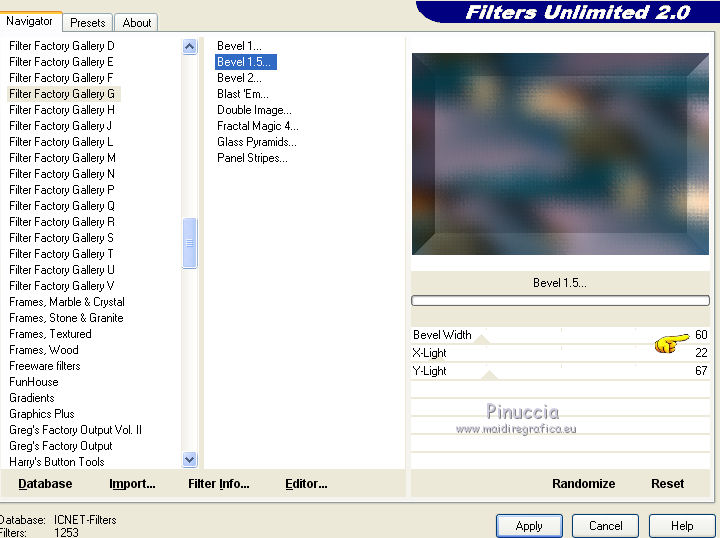 7. Effets>Modules Externes>Filters Unlimited 2.0 - Filter Factory Gallery G - Bevel 1.5