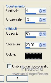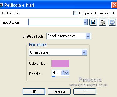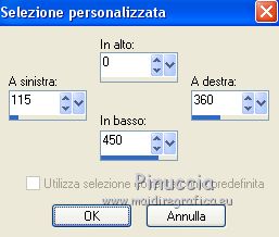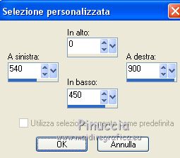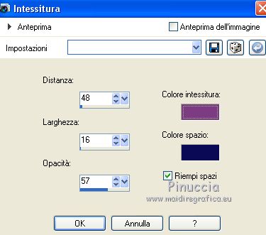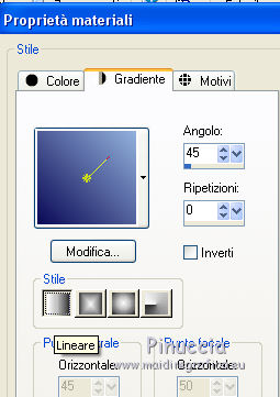 qui puoi trovare qualche risposta ai tuoi dubbi. Se l'argomento che ti interessa non è presente, ti prego di segnalarmelo. Questo tutorial è stato tradotto con CorelX7 e CorelX2, ma può essere realizzato anche con le altre versioni di PSP. Dalla versione X4, il comando Immagine>Rifletti è stato sostituito con Immagine>Capovolgi in orizzontale, e il comando Immagine>Capovolgi con Immagine>Capovolgi in verticale. Nelle versioni X5 e X6, le funzioni sono state migliorate rendendo disponibile il menu Oggetti. Con la nuova versione X7, sono tornati Rifletti>Capovolgi, ma con nuove varianti. Vedi la scheda sull'argomento qui traduzione in francese/traduction en français qui/ici Versioni/Versions quiOccorrente: Materiale qui Per il tube grazie Luz Cristina. (in questa pagina trovi i links ai siti dei creatori di tubes) Filtri: se hai problemi con i filtri, consulta la mia sezione filtri qui Filters Unlimited 2.0 qui &<Bkg Designer sf10I> - 4 Way Average (da importare in Unlimited) qui VM Extravaganza - Holidays in Egypt qui Filter Factory Gallery G - Panel Stripes qui Mehdi - Sorting Tiles qui L&K's - L&K's Palmyre qui I filtri VM Extravaganza e Factory Gallery si possono usare da soli o importati in Filters Unlimited (come fare vedi qui) Se un filtro fornito appare con questa icona ![]() non esitare a cambiare modalità di miscelatura e opacità secondo i colori utilizzati. Nelle ultime versioni di PSP non c'è il gradiente di primo piano/sfondo (Corel_06_029) Puoi usare i gradienti delle versioni precedenti. Trovi qui i gradienti Corel X. Metti il preset Emboss 3 nella cartella Impostazioni predefinite. 1. Apri una nuova immagine trasparente 950 x 600 pixels Imposta il colore di primo piano con il colore scuro #0b0a56, e il colore di sfondo con il colore chiaro #92b1dc. ![]() Passa il colore di primo piano a Gradiente di primo piano/sfondo, stile Lineare. ![]() Riempi l'immagine trasparente con il gradiente.2. Effetti>Plugins>Filters Unlimited 2.0 - VM Extravaganza - Holidays in Egypt ![]() Effetti>Effetti di bordo>Aumenta. 3. Effetti>Plugins>Mehdi - Sorting Tiles. ![]() 4. Attiva lo strumento Selezione ![]() (non importa il tipo di selezione impostato, perchè con la selezione personalizzata si ottiene sempre un rettangolo) clicca sull'icona Selezione personalizzata ![]() e imposta i seguenti settaggi. ![]() Selezione>Innalza selezione a livello. Selezione>Deseleziona. 5. Effetti> Plugins> Filters Unlimited 2.0 - Filter Factory Gallery G - Panel Stripes ![]() Livelli>Duplica. Immagine>Rifletti. Livelli>Unisci>Unisci visibile. 6. Selezione personalizzata ![]() ![]() Selezione>Innalza selezione a livello. Selezione>Deseleziona. 7. Effetti>Plugins>Filters Unlimited 2.0 - &<Bkg Designer sf10I> - 4 Way Average. ![]() 8. Effetti>Plugins>L& K's Palmyre. ![]() Livelli>Unisci>Unisci giù. 9. Selezione personalizzata ![]() ![]() Selezione>Innalza selezione a livello. Selezione>Deseleziona. 10. Effetti>Effetti di trama>Intessitura. Colore intessitura #7d3d81; colore spazio #0b0a56. ![]() 11. Effetti>Effetti di foto>Pellicola e Filtri. ![]() Effetti>Filtro definito dall'utente - seleziona il preset Emboss 3 e ok. ![]() Livelli>Unisci>Unisci giù. 12. Apri il tube 5392-luzcristina e vai a Modifica>Copia. Torna al tuo lavoro e vai a Modifica>Incolla come nuovo livello. Posiziona correttamente il tube.![]() Effetti>Effetti 3D>Sfalsa ombra, colore #000000. ![]() 13. Immagine>Aggiungi bordatura, 2 pixels, simmetriche, colore #7d3d81. Immagine>Aggiungi bordatura, 20 pixels, simmetriche, colore bianco. Attiva lo strumento Bacchetta magica ![]() ![]() e clicca nel bordo di 20 pixels per selezionarlo. 14. Livelli>Nuovo livello raster. Cambia i settaggi del gradiente ![]() Riempi la selezione con il gradiente.Effetti>Effetti di bordo>Aumenta. 15. Immagine>Aggiungi bordatura, 3 pixels, simmetriche, colore scuro di primo piano. Firma il tuo lavoro e salva in formato jpg. Versione con tube di Luz Cristina ![]() ![]() Puoi scrivermi se hai problemi o dubbi, o trovi un link che non funziona, o soltanto per un saluto. 4 Gennaio 2021 |