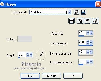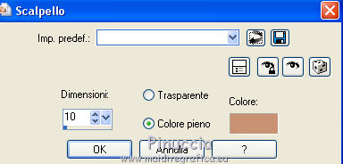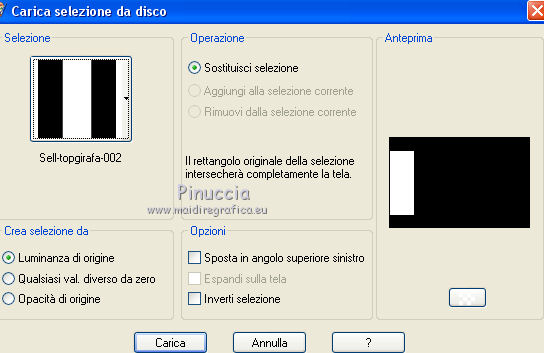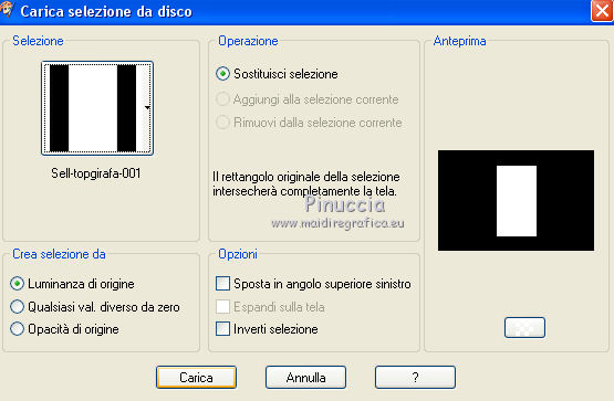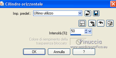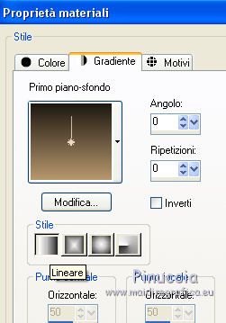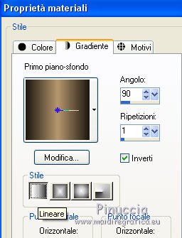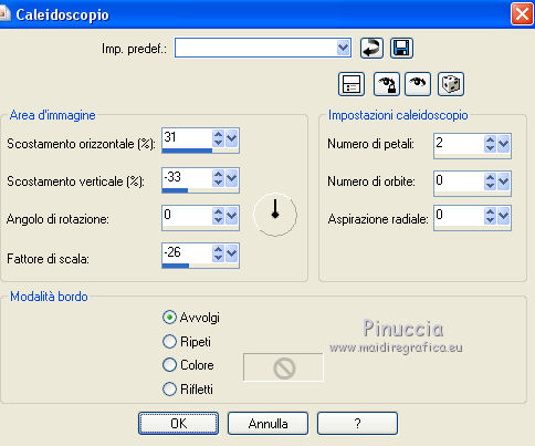 qui puoi trovare qualche risposta ai tuoi dubbi. Se l'argomento che ti interessa non è presente, ti prego di segnalarmelo. Questo tutorial è stato tradotto con CorelX7 e CorelX2, ma può essere realizzato anche con le altre versioni di PSP. Dalla versione X4, il comando Immagine>Rifletti è stato sostituito con Immagine>Capovolgi in orizzontale, e il comando Immagine>Capovolgi con Immagine>Capovolgi in verticale. Nelle versioni X5 e X6, le funzioni sono state migliorate rendendo disponibile il menu Oggetti. Con la nuova versione X7, sono tornati Rifletti>Capovolgi, ma con nuove varianti. Vedi la scheda sull'argomento qui traduzione in francese/traduction en français qui/ici Versioni/Versions quiOccorrente: Materiale qui Per il tube grazie LisaT (paysage_0289_lisat) (in questa pagina trovi i links ai siti dei creatori di tubes) Filtri: se hai problemi con i filtri, consulta la mia sezione filtri qui DSB Flux - Blast qui AAA Frames - Foto Frame qui ![]() non esitare a cambiare modalità di miscelatura e opacità secondo i colori utilizzati. Nelle ultime versioni di PSP non c'è il gradiente di primo piano/sfondo (Corel_06_029) Puoi usare i gradienti delle versioni precedenti. Trovi qui i gradienti Corel X. Metti le selezioni nella cartella Selezioni. 1- Apri una nuova immagine trasparente 1000 x 650 pixels. Imposta il colore di primo piano con il colore chiaro #b7976d, e il colore di sfondo con il colore scuro #1d1811. ![]() Passa il colore di primo piano a Gradiente di primo piano/sfondo, stile Lineare. ![]() Riempi l'immagine trasparente con il gradiente.2. Effetti>Effetti di trama>Nappa, con i settaggi standard. ![]() 3. Effetti>Plugins>DSB Flux - Blast ![]() L'Effetto Blast si trova anche nel filtro VM Toolbox. Secondo la versione di PSP che stai usando, può capitare che il primo di questi filtri aggiunto ai Percorsi Files, impedisca di vedere l'effetto nella lista del secondo. Per poter usare l'Effetto Blast di DSB Flux, è necessario togliere dai Percorsi Files la cartella del filtro VM Toolbox Livelli>Duplica. 4. Effetti>Plugins>AAA Frames - Foto Frame. ![]() Selezione>Seleziona tutto. Selezione>Modifica>Contrai - 60 pixels. Premi sulla tastiera il tasto CANC ![]() Selezione>Deseleziona. 5. Effetti>Effetti geometrici>Cilindro orizzontale. ![]() 6. Effetti>Effetti di riflesso>Specchio rotante, con i settaggi standard. ![]() Livelli>Unisci>Unisci giù. 7. Livelli>Duplica. Immagine>Ridimensiona, all'80%, tutti i livelli non selezionato. Livelli>Unisci>Unisci giù. 8. Effetti>Effetti di riflesso>Caleidoscope. ![]() 9. Selezione>Carica/Salva selezione>Carica selezione da disco. Cerca e carica la selezione Sell-topgirafa-001 ![]() 10. Apri il tube del paesaggio e vai a Modifica>Copia. Torna al tuo lavoro e vai a Modifica>Incolla come nuovo livello. Posiziona il tube sulla selezione,per il mio esempio ho ridimensionato il tube all'85%. ![]() Selezione>Inverti. Premi sulla tastiera il tasto CANC ![]() 11. Effetti>Effetti 3D>Scalpello, colore #ca9274. ![]() Selezione>Deseleziona. Livelli>Unisci>Unisci giù. 12. Selezione>Carica/Salva selezione>Carica selezione da disco. Cerca e carica la selezione Sell-topgirafa-002 ![]() 13. Modifica>Incolla come nuovo livello (il tube del paesaggio è ancora in memoria). Posiziona il tube sulla selezione.![]() Selezione>Inverti. Premi sulla tastiera il tasto CANC. Effetti>Effetti 3D>Scalpello, con i settaggi precedenti. ![]() Selezione>Deseleziona. 14. Livelli>Duplica. Immagine>Rifletti. Livelli>Unisci>Unisci visibile. 15. Selezione>Carica/Salva selezione>Carica selezione da disco. Cerca e carica la selezione Sell-topgirafa-003 ![]() 16. Cambia i settaggi del gradiente ![]() Livelli>Nuovo livello raster. Riempi la selezione con il gradiente.Selezione>Deseleziona. 17. Effetti>Effetti di trama>Nappa, con i settaggi standard. ![]() 1 18. Livelli>Duplica. Immagine>Capovolgi. Livelli>Unisci>Unisci tutto. 19. Immagine>Aggiungi bordatura, simmetriche non selezionato, colore bianco. ![]() 20. Selezione>Seleziona tutto. Selezione>Modifica>Contrai - 5 pixels. Selezione>Inverti. 21. Livelli>Nuovo livello raster. Passa il colore di primo piano a Colore. Riempi il livello con il colore chiaro di primo piano.Selezione>Deseleziona. Livelli>Unisci>Unisci giù. Firma il tuo lavoro e salva in formato jpg. Versione con un mio tube ![]() ![]() Puoi scrivermi se hai problemi o dubbi, o trovi un link che non funziona, o soltanto per un saluto. 16 Febbraio 2021 |